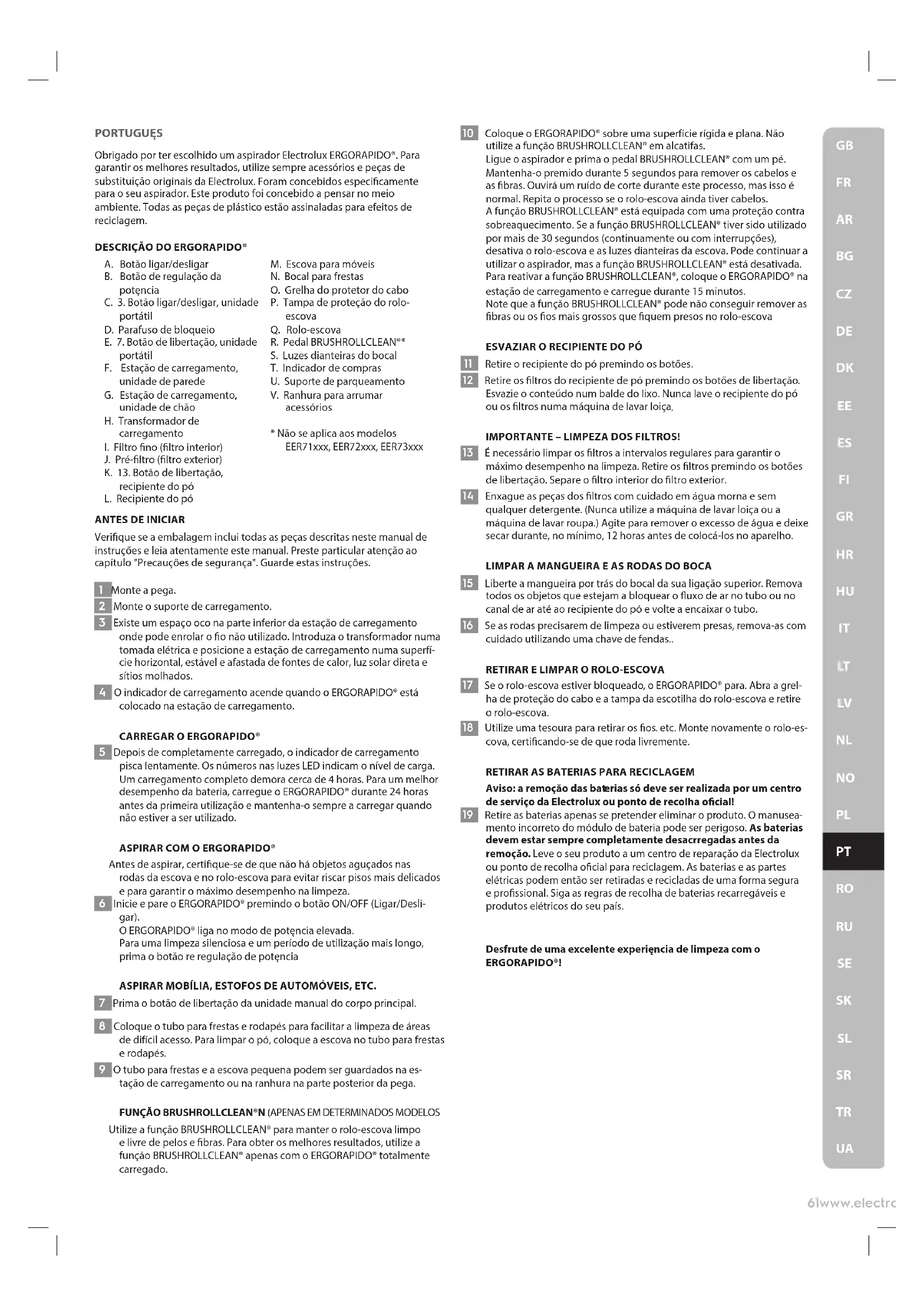 Aviso: a remoçăo das bat erias só deve ser realizada por um centro de serviço da Electrolux ou ponto de recolha ocial! 19 Retire as baterias apenas se pretender eliminar o produto. O manusea- mento incorreto do módulo de bateria pode ser perigoso. As baterias devem estar sempre completamente desacrregadas antes da remoçăo. Leve o seu produto a um centro de reparaçăo da Electrolux ou ponto de recolha ocial para reciclagem. As baterias e as partes elétricas podem entăo ser retiradas e recicladas de uma forma segura e prossional. Siga as regras de recolha de baterias recarregáveis e produtos elétricos do seu país. Desfrute de uma excelente experięncia de limpeza com o ERGORAPIDO®!62www.electrolux.com