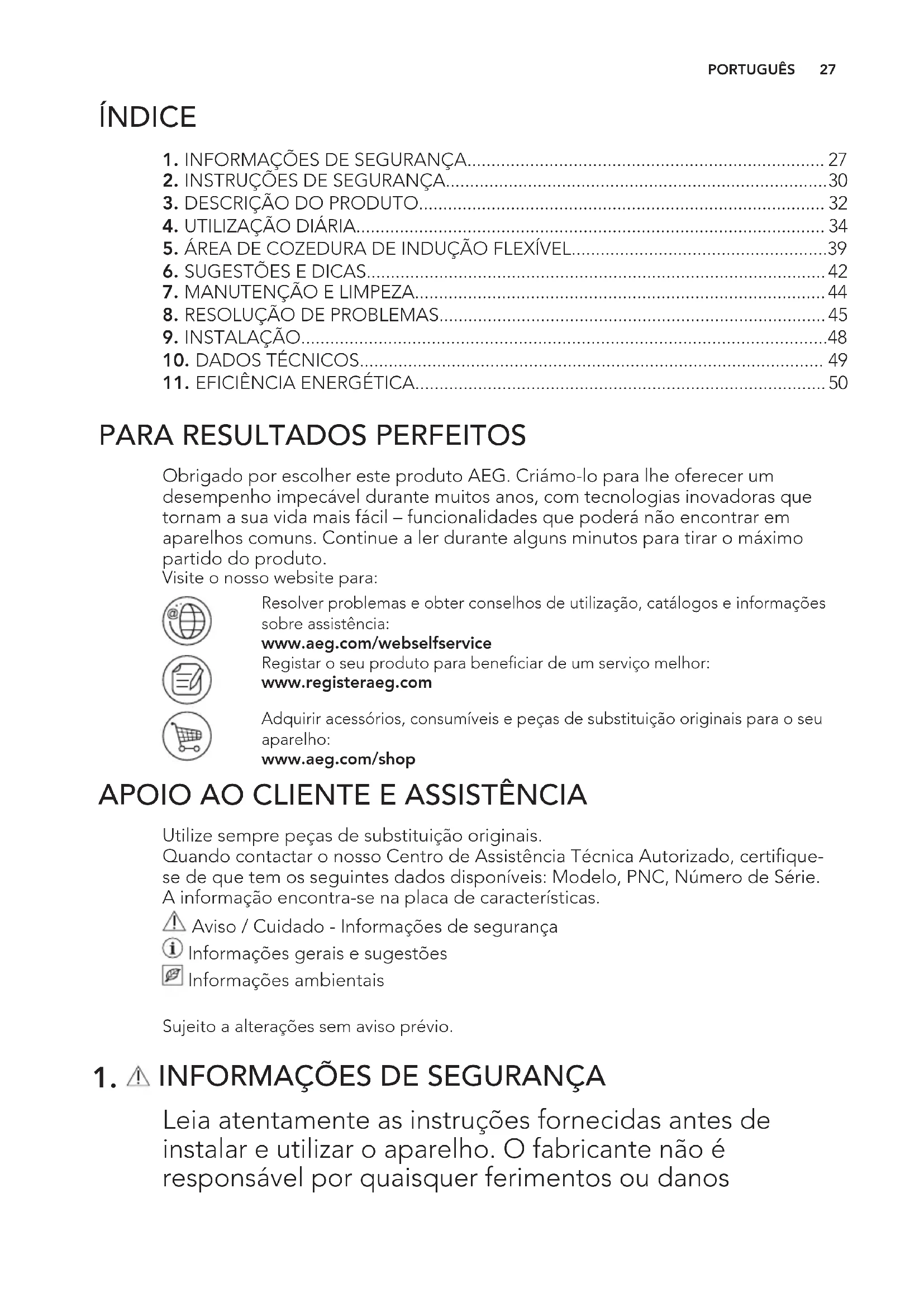 Obrigado por escolher este produto AEG. Criámo-lo para lhe oferecer um desempenho impecável durante muitos anos, com tecnologias inovadoras que tornam a sua vida mais fácil – funcionalidades que poderá não encontrar em aparelhos comuns. Continue a ler durante alguns minutos para tirar o máximo partido do produto. Visite o nosso website para: Resolver problemas e obter conselhos de utilização, catálogos e informações sobre assistência: www.aeg.com/webselfservice Registar o seu produto para beneficiar de um serviço melhor: www.registeraeg.com Adquirir acessórios, consumíveis e peças de substituição originais para o seu aparelho: www.aeg.com/shop