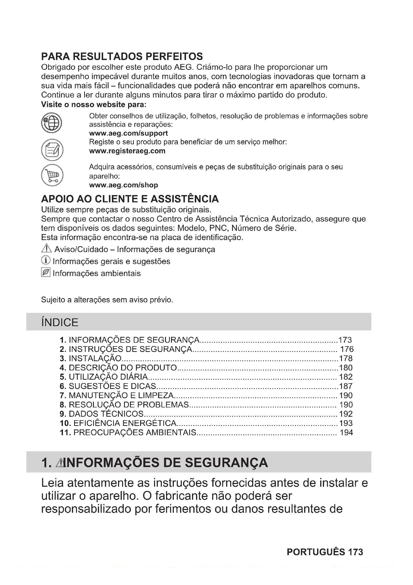Utilize sempre peças de substituição originais.Sempre que contactar o nosso Centro de Assistência Técnica Autorizado, assegure quetem disponíveis os dados seguintes: Modelo, PNC, Número de Série.Esta informação encontra-se na placa de identificação. Aviso/Cuidado – Informações de segurança Informações gerais e sugestões Informações ambientaisSujeito a alterações sem aviso prévio. ÍNDICE 1. INFORMAÇÕES DE SEGURANÇA............................................................1732. INSTRUÇÕES DE SEGURANÇA............................................................... 176