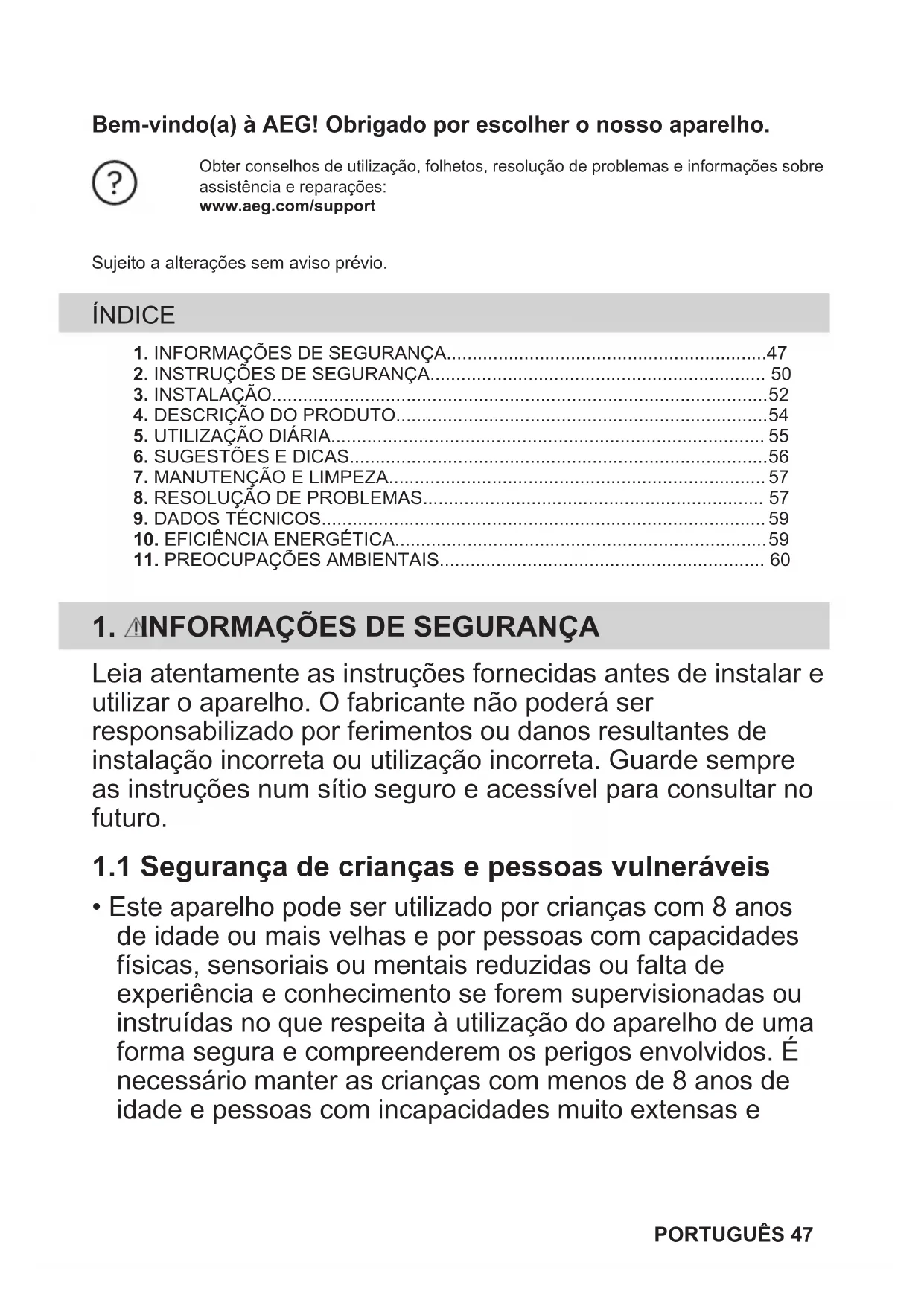 - Este aparelho pode ser utilizado por crianças com 8 anos de idade ou mais velhas e por pessoas com capacidades físicas, sensoriais ou mentais reduzidas ou falta de experiência e conhecimento se forem supervisionadas ou instruídas no que respeita à utilização do aparelho de uma forma segura e compreenderem os perigos envolvidos. É necessário manter as crianças com menos de 8 anos de idade e pessoas com incapacidades muito extensas e PORTUGUÊS 47complexas afastadas do aparelho, a menos que sejam constantemente vigiadas.