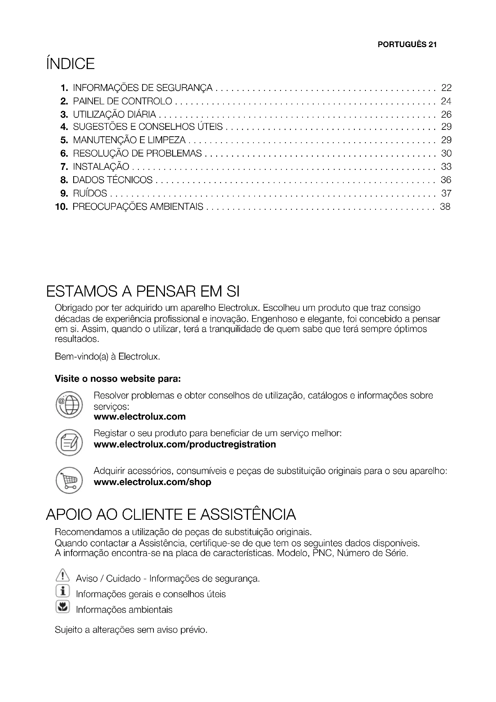 Obrigado por ter adquirido um aparelho Electrolux. Escolheu um produto que traz consigo décadas de experiência profissional e inovação. Engenhoso e elegante, foi concebido a pensar em si. Assim, quando o utilizar, terá a tranquilidade de quem sabe que terá sempre óptimos resultados. Bem-vindo(a) à Electrolux. Visite o nosso website para: Resolver problemas e obter conselhos de utilização, catálogos e informações sobre serviços: www.electrolux.com Registar o seu produto para beneficiar de um serviço melhor: www.electrolux.com/productregistration Adquirir acessórios, consumíveis e peças de substituição originais para o seu aparelho: www.electrolux.com/shop