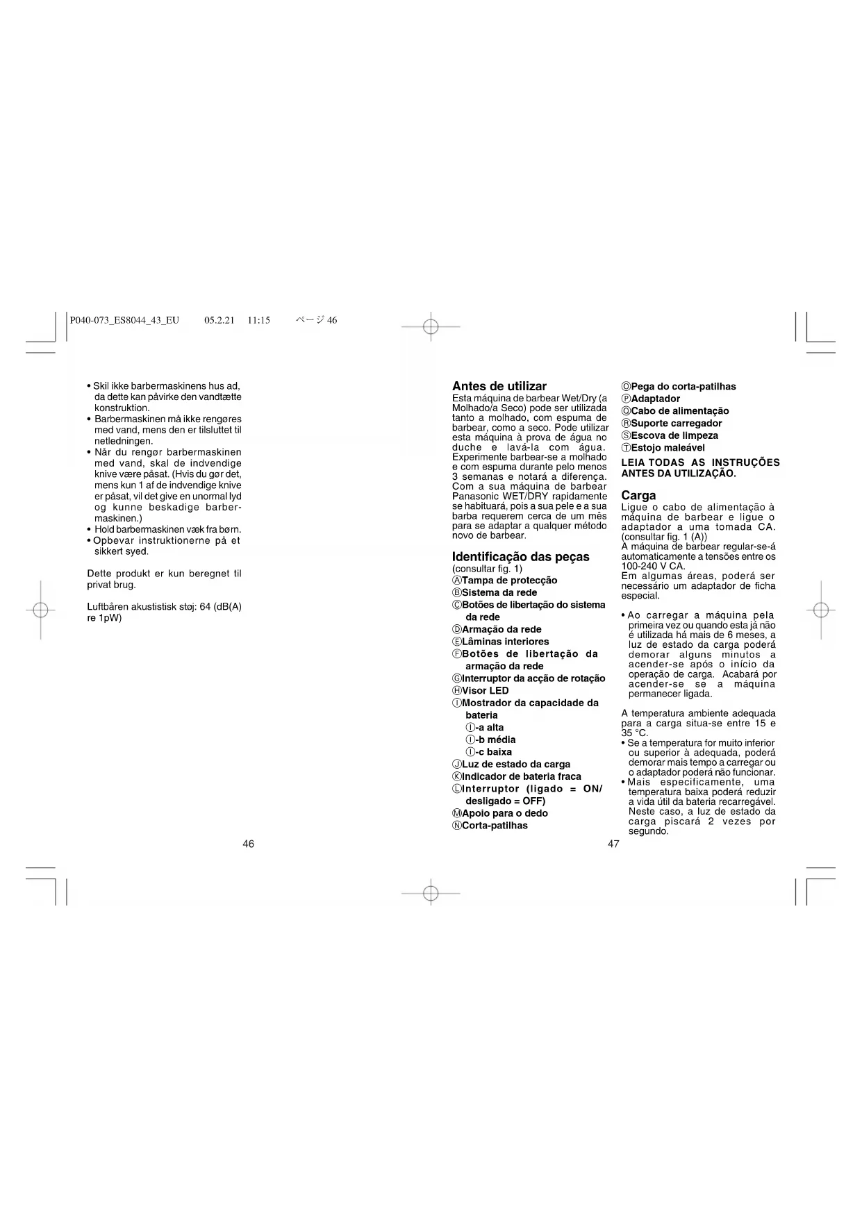 P040-073ES804443EU 05.2.21 11:15 ページ447 Antes de utilizar Esta máquina de barbear Wet/Dry (a Molhado/a Seco) pode ser utilizada tanto a molhado, com espuma de barbear, como a seco. Pode utilizar esta máquina à prova de água no duche e lavá-la com água. Experimente barbear-se a molhado e com espuma durante pelo menos 3 semanas e notará a diferença. Com a sua máquina de barbear Panasonic WET/DRY rapidamente se habituará, pois a sua pele e a sua barba requerem cerca de um mês para se adaptar a qualquer método novo de barbear. Identificação das peças (consultar fig. 1) A Tampa de protecção B Sistema da rede C Botões de libertação do sistema da rede D Armação da rede E Lâminas interiores F Botões de libertação da armação da rede G Interruptor da acção de rotação H Visor LED I Mostrador da capacidade da bateria I-a alta I-b média I-c baixa J Luz de estado da carga K Indicador de bateria fraca L Interruptor (ligado = ON/ desligado = OFF) M Apoio para o dedo N Corta-patilhas O Pega do corta-patilhas P Adaptador Q Cabo de alimentação R Suporte carregador S Escova de limpeza T Estojo maleável