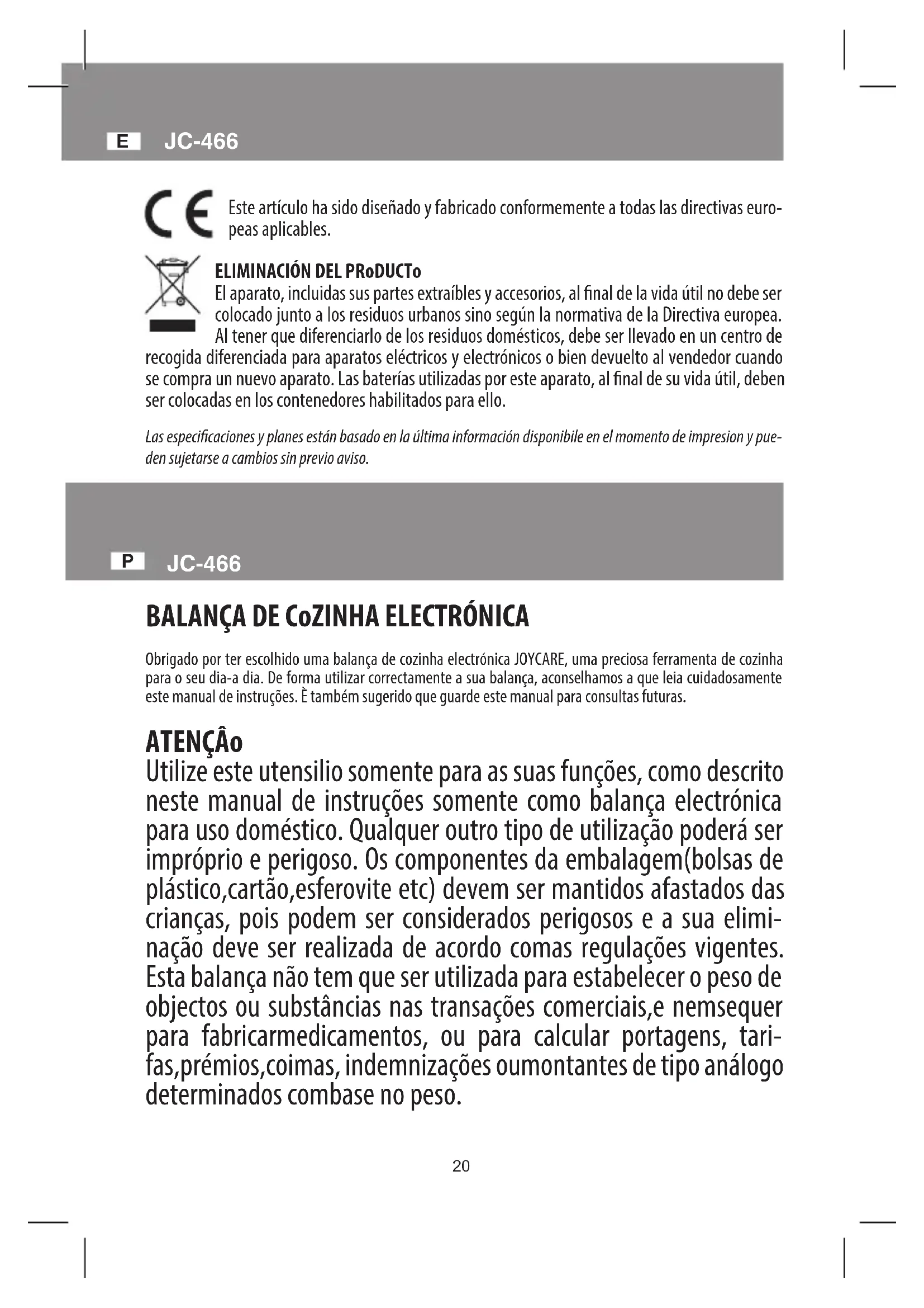 Este artículo ha sido diseñado y fabricado conformemente a todas las directivas euro- peas aplicables. ELIMINACIÓN DEL PRoDUCTo El aparato, incluidas sus partes extraíbles y accesorios, al nal de la vida útil no debe ser colocado junto a los residuos urbanos sino según la normativa de la Directiva europea. Al tener que diferenciarlo de los residuos domésticos, debe ser llevado en un centro de recogida diferenciada para aparatos eléctricos y electrónicos o bien devuelto al vendedor cuando se compra un nuevo aparato. Las baterías utilizadas por este aparato, al nal de su vida útil, deben ser colocadas en los contenedores habilitados para ello. Las especicaciones y planes están basado en la última información disponibile en el momento de impresion y pue- den sujetarse a cambios sin previo aviso. BALANÇA DE CoZINHA ELECTRÓNICA Obrigado por ter escolhido uma balança de cozinha electrónica JOYCARE, uma preciosa ferramenta de cozinha para o seu dia-a dia. De forma utilizar correctamente a sua balança, aconselhamos a que leia cuidadosamente este manual de instruções. È também sugerido que guarde este manual para consultas futuras. ATENÇÂo Utilize este utensilio somente para as suas funções, como descrito neste manual de instruções somente como balança electrónica para uso doméstico. Qualquer outro tipo de utilização poderá ser impróprio e perigoso. Os componentes da embalagem(bolsas de plástico,cartão,esferovite etc) devem ser mantidos afastados das crianças, pois podem ser considerados perigosos e a sua elimi- nação deve ser realizada de acordo comas regulações vigentes. Esta balança não tem que ser utilizada para estabelecer o peso de objectos ou substâncias nas transações comerciais,e nemsequer para fabricarmedicamentos, ou para calcular portagens, tari- fas,prémios,coimas, indemnizações oumontantes de tipo análogo determinados combase no peso. JC-466 P20