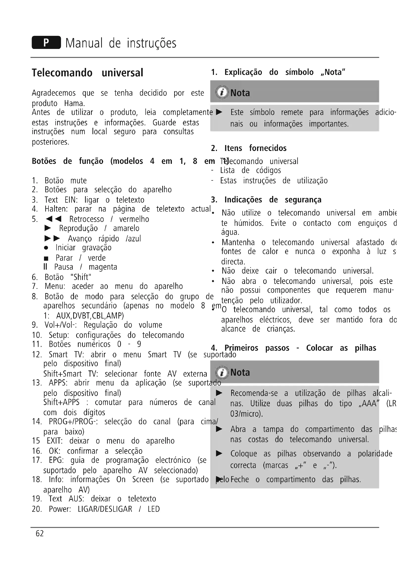 - Não abra o telecomando universal, pois este não possui componentes que requerem manu- tenção pelo utilizador.