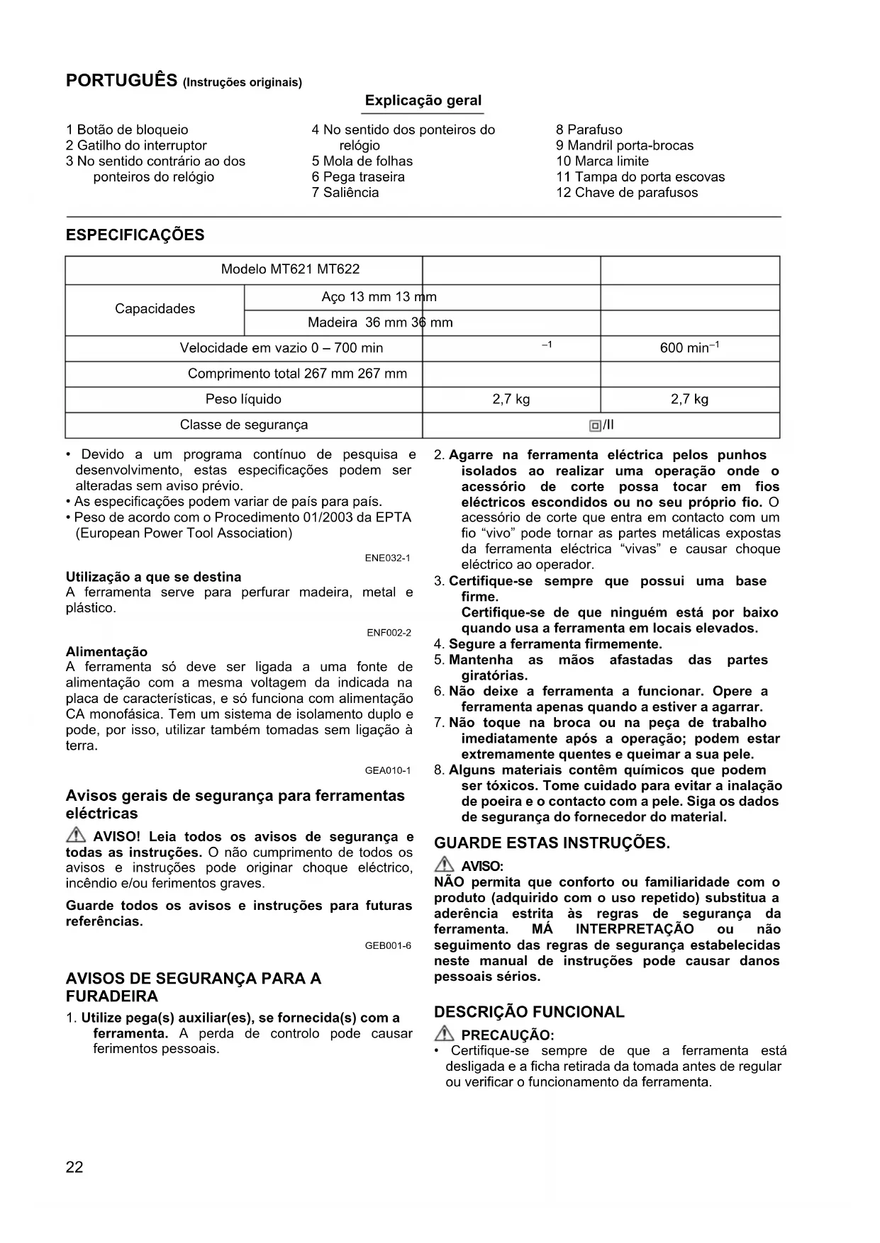Baixe as instruções para o seu Parafusadeira em formato PDF gratuitamente! Encontre o seu manual MT622 - Maktec e retome o controlo do seu dispositivo eletrónico. Nesta página estão publicados todos os documentos necessários para a utilização do seu dispositivo. MT622 da marca Maktec.