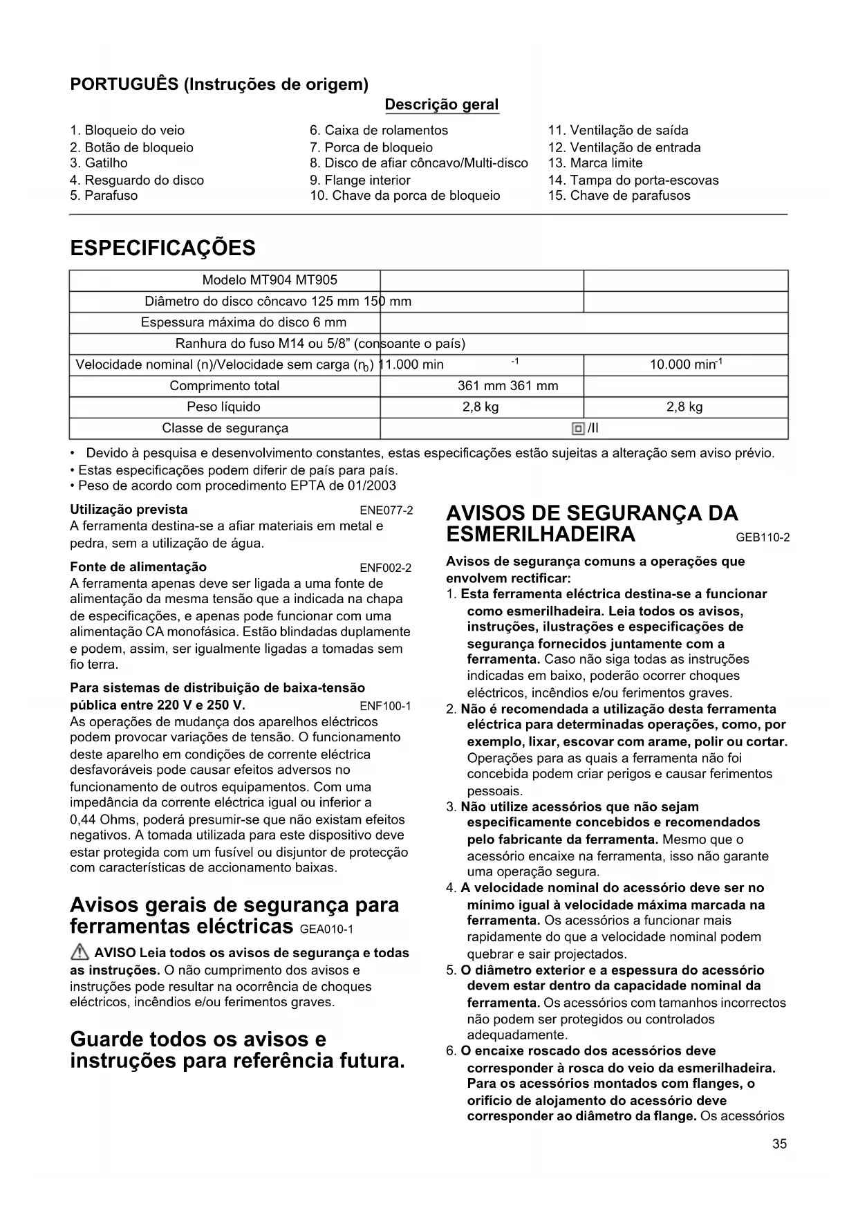 Baixe as instruções para o seu Esmerilhadeira angular em formato PDF gratuitamente! Encontre o seu manual MT904 - Maktec e retome o controlo do seu dispositivo eletrónico. Nesta página estão publicados todos os documentos necessários para a utilização do seu dispositivo. MT904 da marca Maktec.