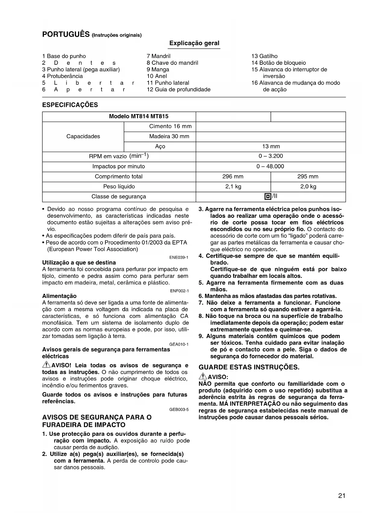 Baixe as instruções para o seu Furadeira em formato PDF gratuitamente! Encontre o seu manual MT814 - Maktec e retome o controlo do seu dispositivo eletrónico. Nesta página estão publicados todos os documentos necessários para a utilização do seu dispositivo. MT814 da marca Maktec.