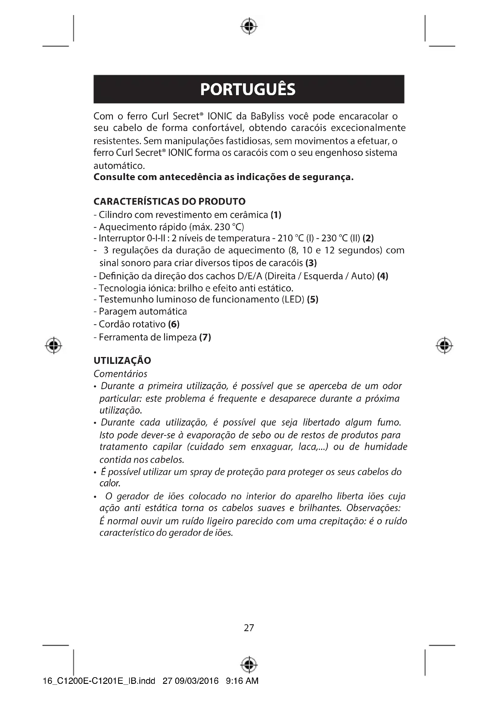 - O gerador de iões colocado no interior do aparelho liberta iões cuja ação anti estática torna os cabelos suaves e brilhantes. Observações: É normal ouvir um ruído ligeiro parecido com uma crepitação: é o ruído característico do gerador de iões. 16_C1200E-C1201E_IB.indd 27 09/03/2016 9:16 AM28
