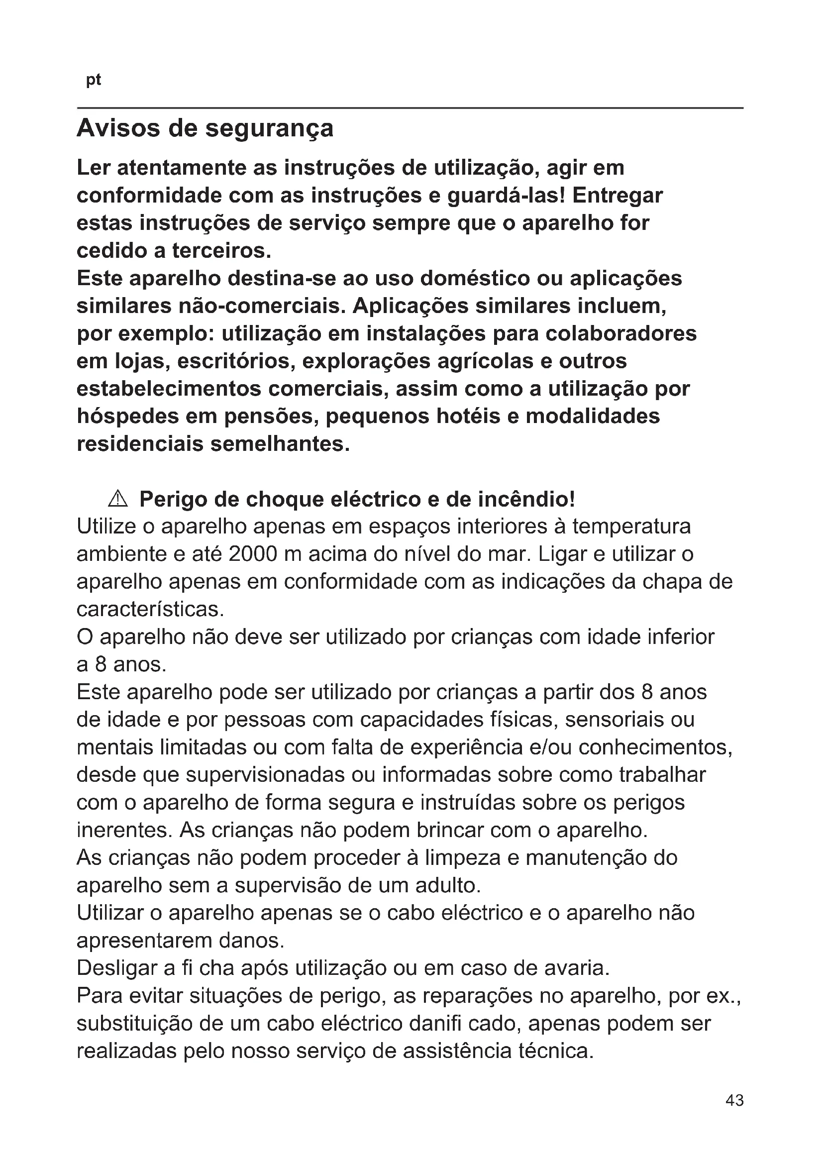 Avisos de segurança Ler atentamente as instruções de utilização, agir em conformidade com as instruções e guardá-las! Entregar estas instruções de serviço sempre que o aparelho for cedido a terceiros. Este aparelho destina-se ao uso doméstico ou aplicações similares não-comerciais. Aplicações similares incluem, por exemplo: utilização em instalações para colaboradores em lojas, escritórios, explorações agrícolas e outros estabelecimentos comerciais, assim como a utilização por hóspedes em pensões, pequenos hotéis e modalidades residenciais semelhantes. A Perigo de choque eléctrico e de incêndio! Utilize o aparelho apenas em espaços interiores à temperatura ambiente e até 2000 m acima do nível do mar. Ligar e utilizar o aparelho apenas em conformidade com as indicações da chapa de características. O aparelho não deve ser utilizado por crianças com idade inferior a 8 anos. Este aparelho pode ser utilizado por crianças a partir dos 8 anos de idade e por pessoas com capacidades físicas, sensoriais ou mentais limitadas ou com falta de experiência e/ou conhecimentos, desde que supervisionadas ou informadas sobre como trabalhar com o aparelho de forma segura e instruídas sobre os perigos inerentes. As crianças não podem brincar com o aparelho. As crianças não podem proceder à limpeza e manutenção do aparelho sem a supervisão de um adulto. Utilizar o aparelho apenas se o cabo eléctrico e o aparelho não apresentarem danos. Desligar a cha após utilização ou em caso de avaria. Para evitar situações de perigo, as reparações no aparelho, por ex., substituição de um cabo eléctrico dani cado, apenas podem ser realizadas pelo nosso serviço de assistência técnica.44