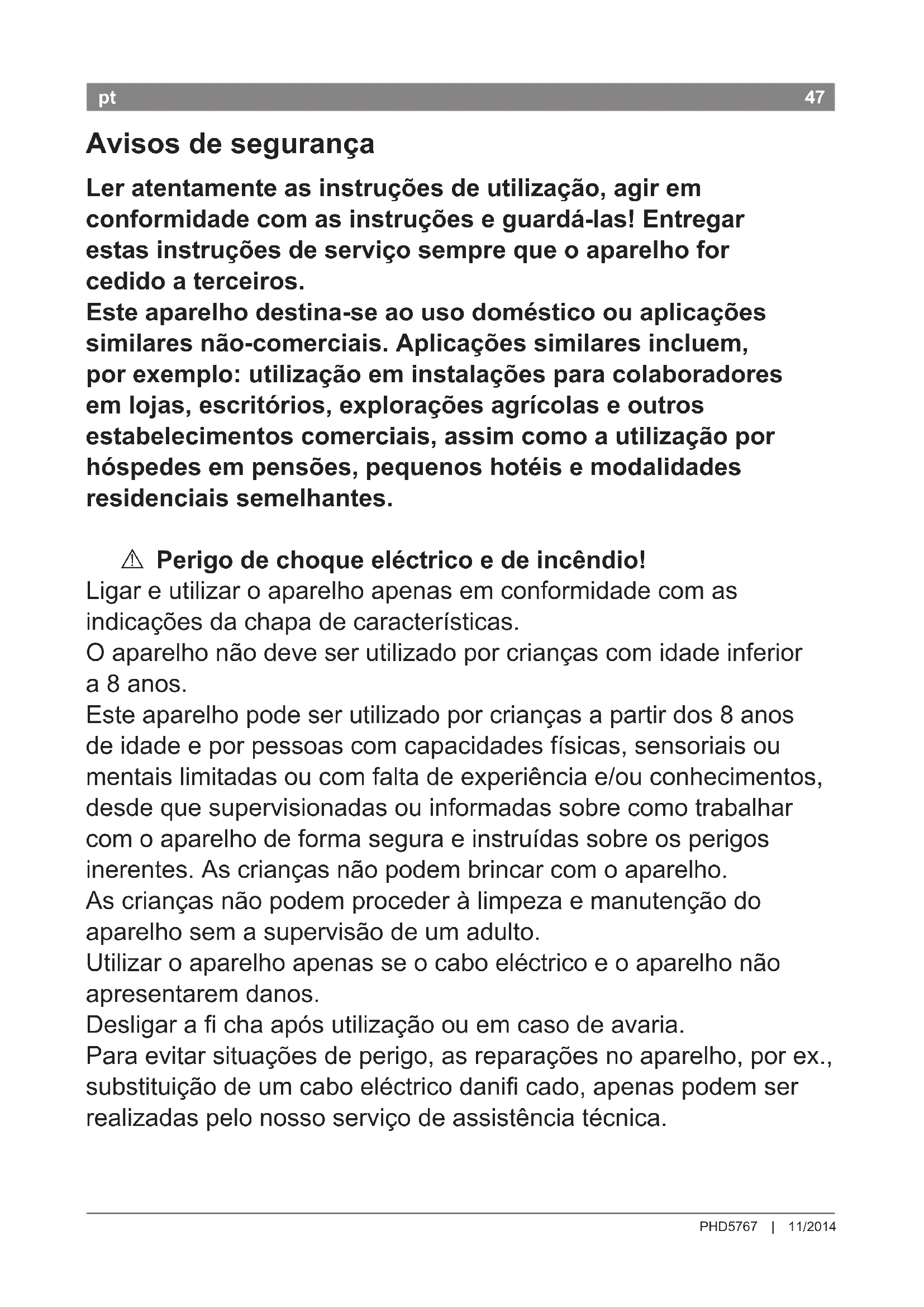 Não utilizar na proximidade de banheiras, lavatórios ou outros recipientes com água. A Perigo de morte! Nunca colocar o aparelho em contacto com a água. É perigoso mesmo com o aparelho desligado, por isso, depois de usar, desligar a cha. A instalação de uma protecção térmica até 30 mA oferece mais segurança à instalação. Para mais informações, consulte um técnico electricista. A Risco de sufoco! Não permitir a crianças brincar com o material de embalagem. A Perigo de queimadura! O concentrador e o difusor podem car quentes. Antes de tirar, deixar arrefecer um pouco.49 PHD5767 | 11/2014