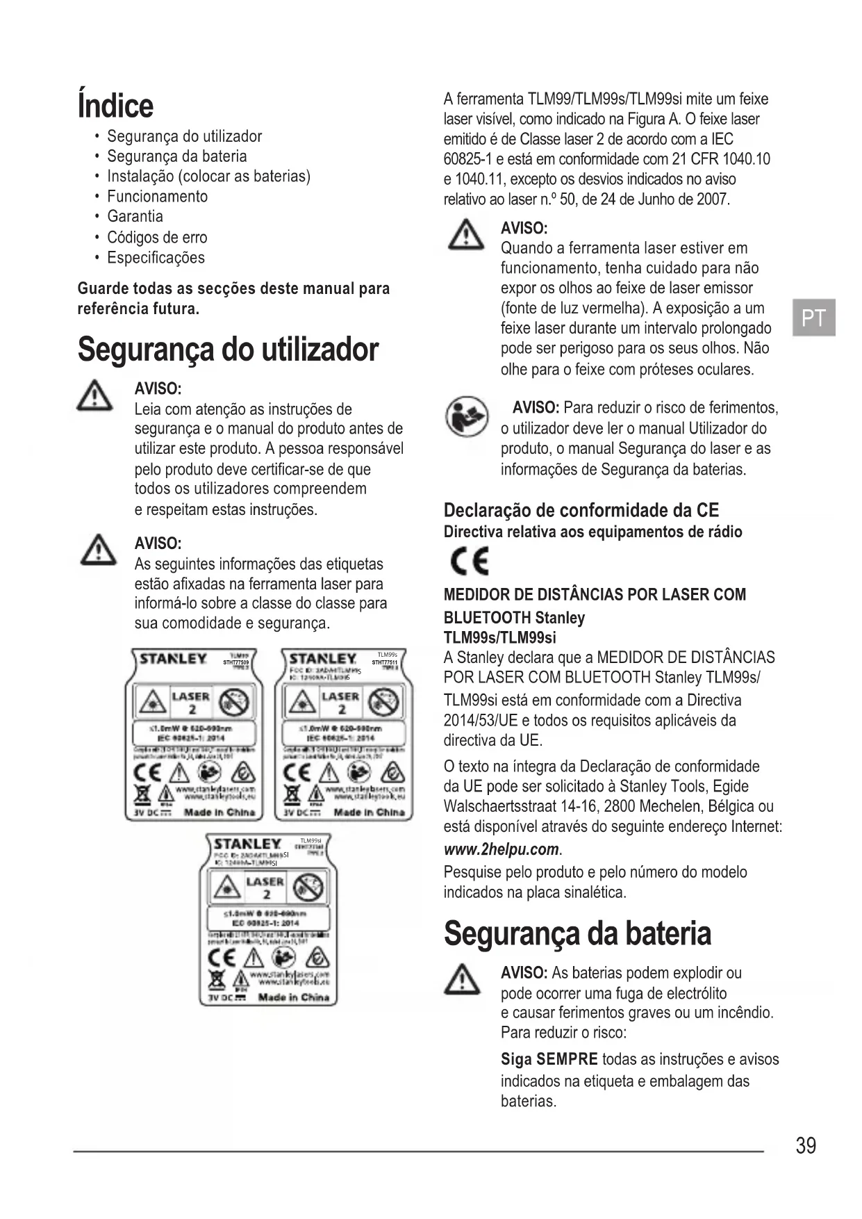 TLM99si A ferramenta TLM99/TLM99s/TLM99si mite um feixe laser visível, como indicado na Figura A. O feixe laser emitido é de Classe laser 2 de acordo com a IEC 60825-1 e está em conformidade com 21 CFR 1040.10 e 1040.11, excepto os desvios indicados no aviso relativo ao laser n.º 50, de 24 de Junho de 2007.AVISO:Quando a ferramenta laser estiver em funcionamento, tenha cuidado para não expor os olhos ao feixe de laser emissor (fonte de luz vermelha). A exposição a um feixe laser durante um intervalo prolongado pode ser perigoso para os seus olhos. Não olhe para o feixe com próteses oculares. AVISO: Para reduzir o risco de ferimentos, o utilizador deve ler o manual Utilizador do produto, o manual Segurança do laser e as informações de Segurança da baterias. Declaração de conformidade da CE Directiva relativa aos equipamentos de rádioMEDIDOR DE DISTÂNCIAS POR LASER COM BLUETOOTH Stanley TLM99s/TLM99siA Stanley declara que a MEDIDOR DE DISTÂNCIAS POR LASER COM BLUETOOTH Stanley TLM99s/TLM99si está em conformidade com a Directiva 2014/53/UE e todos os requisitos aplicáveis da directiva da UE.O texto na íntegra da Declaração de conformidade da UE pode ser solicitado à Stanley Tools, Egide Walschaertsstraat 14-16, 2800 Mechelen, Bélgica ou está disponível através do seguinte endereço Internet: www.2helpu.com.Pesquise pelo produto e pelo número do modelo indicados na placa sinalética. Segurança da bateria AVISO: As baterias podem explodir ou pode ocorrer uma fuga de electrólito e causar ferimentos graves ou um incêndio. Para reduzir o risco:Siga SEMPRE todas as instruções e avisos indicados na etiqueta e embalagem das baterias.PT