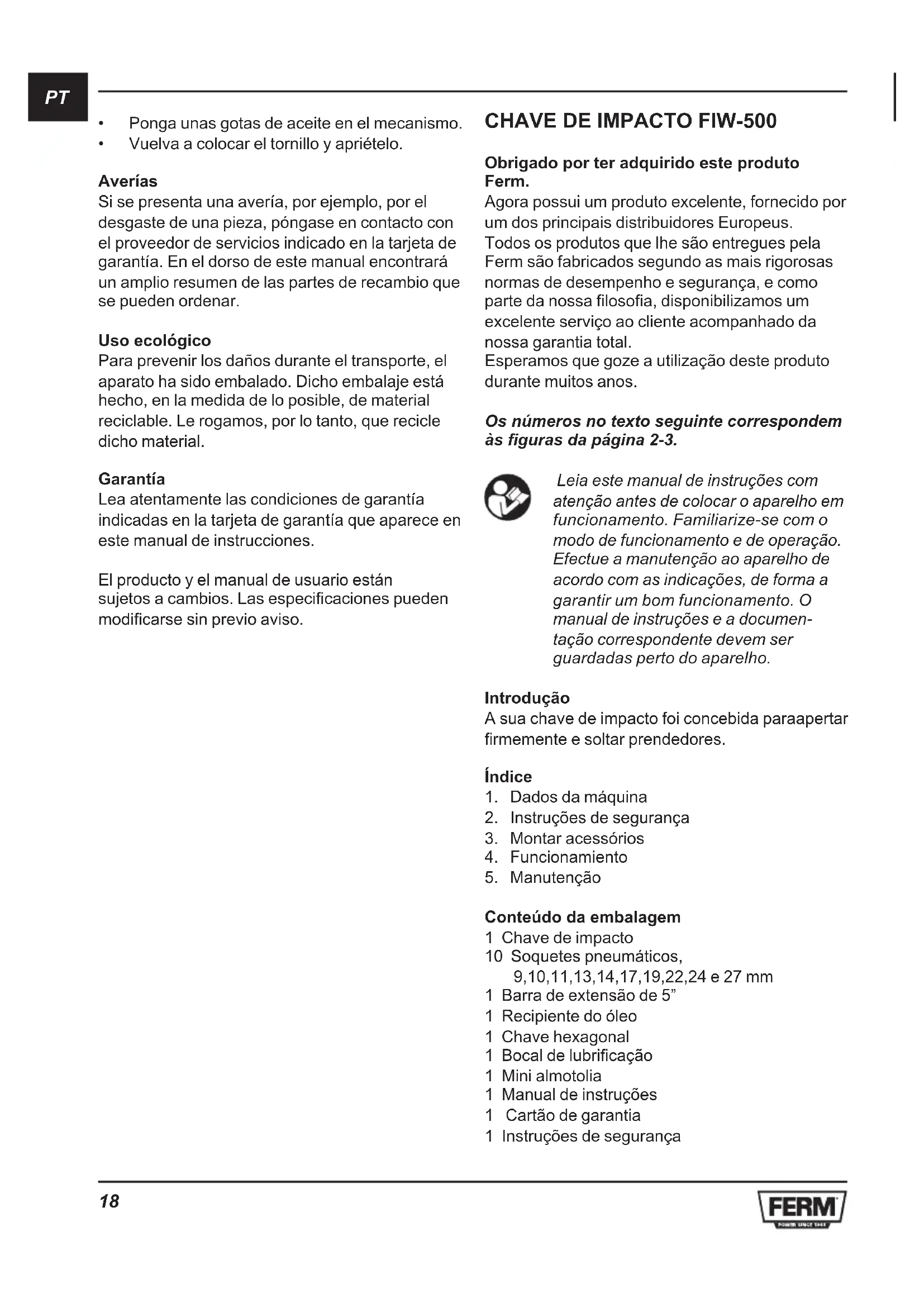 Obrigado por ter adquirido este produto Ferm. Agora possui um produto excelente, fornecido por um dos principais distribuidores Europeus. Todos os produtos que lhe são entregues pela Ferm são fabricados segundo as mais rigorosas normas de desempenho e segurança, e como parte da nossa filosofia, disponibilizamos um excelente serviço ao cliente acompanhado da nossa garantia total. Esperamos que goze a utilização deste produto durante muitos anos. Os números no texto seguinte correspondem às figuras da página 2-3. Leia este manual de instruções com atenção antes de colocar o aparelho em funcionamento. Familiarize-se com o modo de funcionamento e de operação. Efectue a manutenção ao aparelho de acordo com as indicações, de forma a garantir um bom funcionamento. O manual de instruções e a documen- tação correspondente devem ser guardadas perto do aparelho. Introdução A sua chave de impacto foi concebida paraapertar firmemente e soltar prendedores. Índice