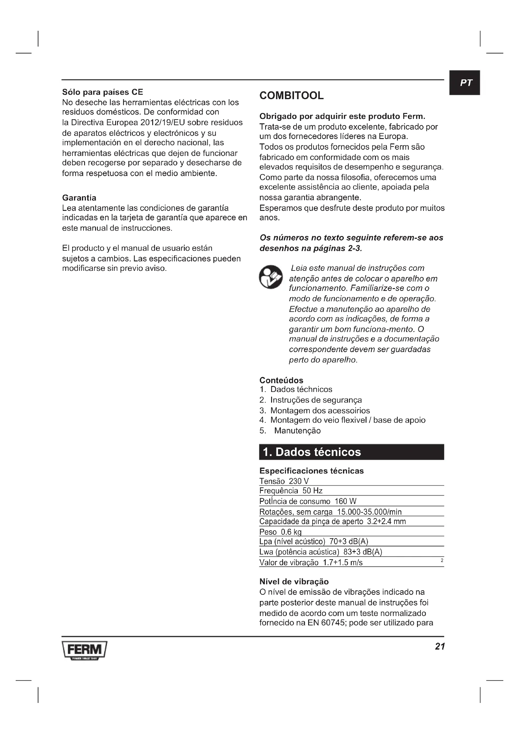 Sólo para países CE No deseche las herramientas eléctricas con los residuos domésticos. De conformidad con la Directiva Europea 2012/19/EU sobre residuos de aparatos eléctricos y electrónicos y su implementación en el derecho nacional, las herramientas eléctricas que dejen de funcionar deben recogerse por separado y desecharse de forma respetuosa con el medio ambiente. Garantía Lea atentamente las condiciones de garantía indicadas en la tarjeta de garantía que aparece en este manual de instrucciones. El producto y el manual de usuario están sujetos a cambios. Las especificaciones pueden modificarse sin previo aviso. COMBITOOL Obrigado por adquirir este produto Ferm. Trata-se de um produto excelente, fabricado por um dos fornecedores líderes na Europa. Todos os produtos fornecidos pela Ferm são fabricado em conformidade com os mais elevados requisitos de desempenho e segurança. Como parte da nossa filosofia, oferecemos uma excelente assistência ao cliente, apoiada pela nossa garantia abrangente. Esperamos que desfrute deste produto por muitos anos. Os números no texto seguinte referem-se aos desenhos na páginas 2-3. Leia este manual de instruções com atenção antes de colocar o aparelho em funcionamento. Familiarize-se com o modo de funcionamento e de operação. Efectue a manutenção ao aparelho de acordo com as indicações, de forma a garantir um bom funciona-mento. O manual de instruções e a documentação correspondente devem ser guardadas perto do aparelho. Conteúdos