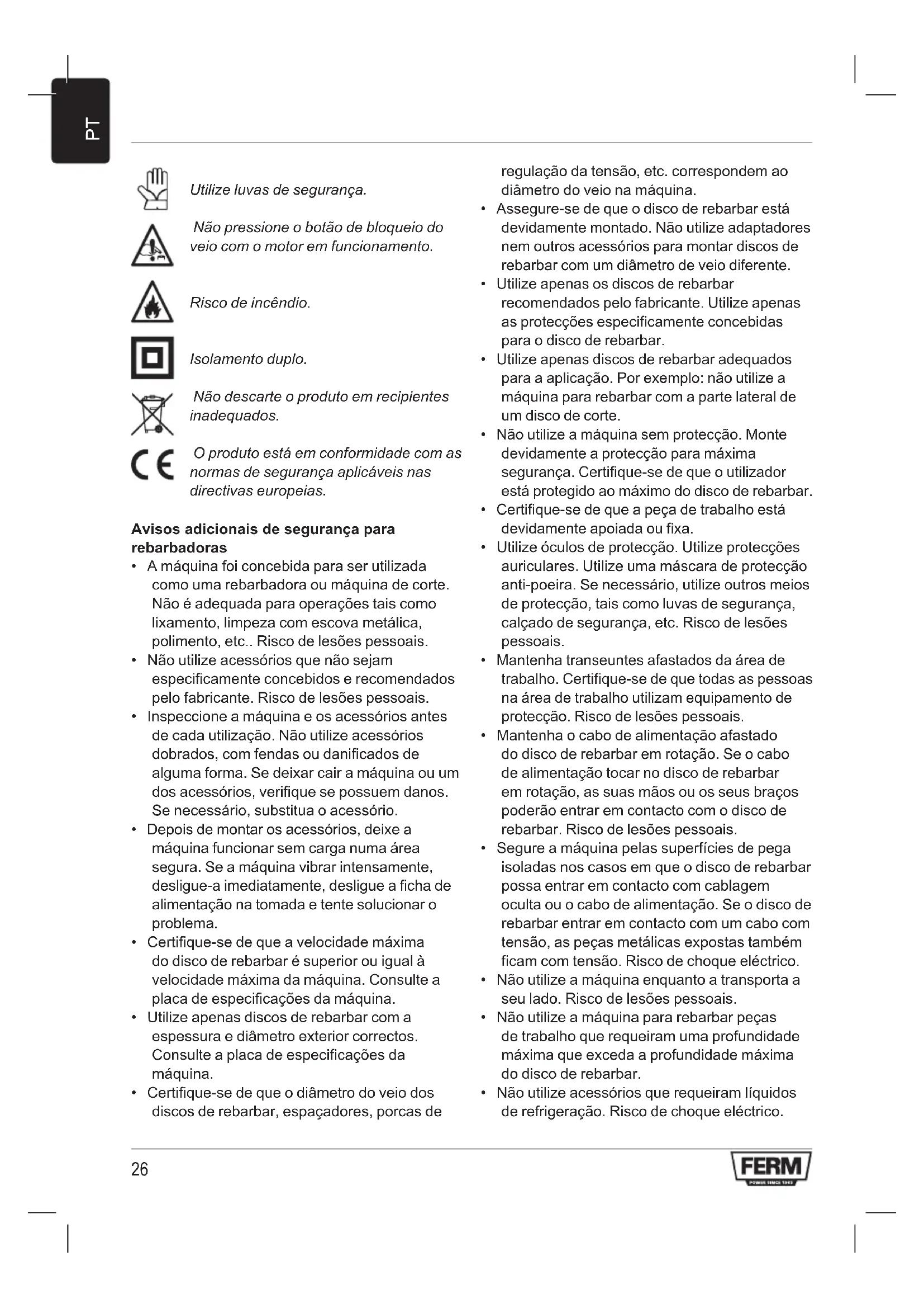 Utilize luvas de segurança. Não pressione o botão de bloqueio do veio com o motor em funcionamento. Risco de incêndio. Isolamento duplo. Não descarte o produto em recipientes inadequados. O produto está em conformidade com as normas de segurança aplicáveis nas directivas europeias. Avisos adicionais de segurança para rebarbadoras