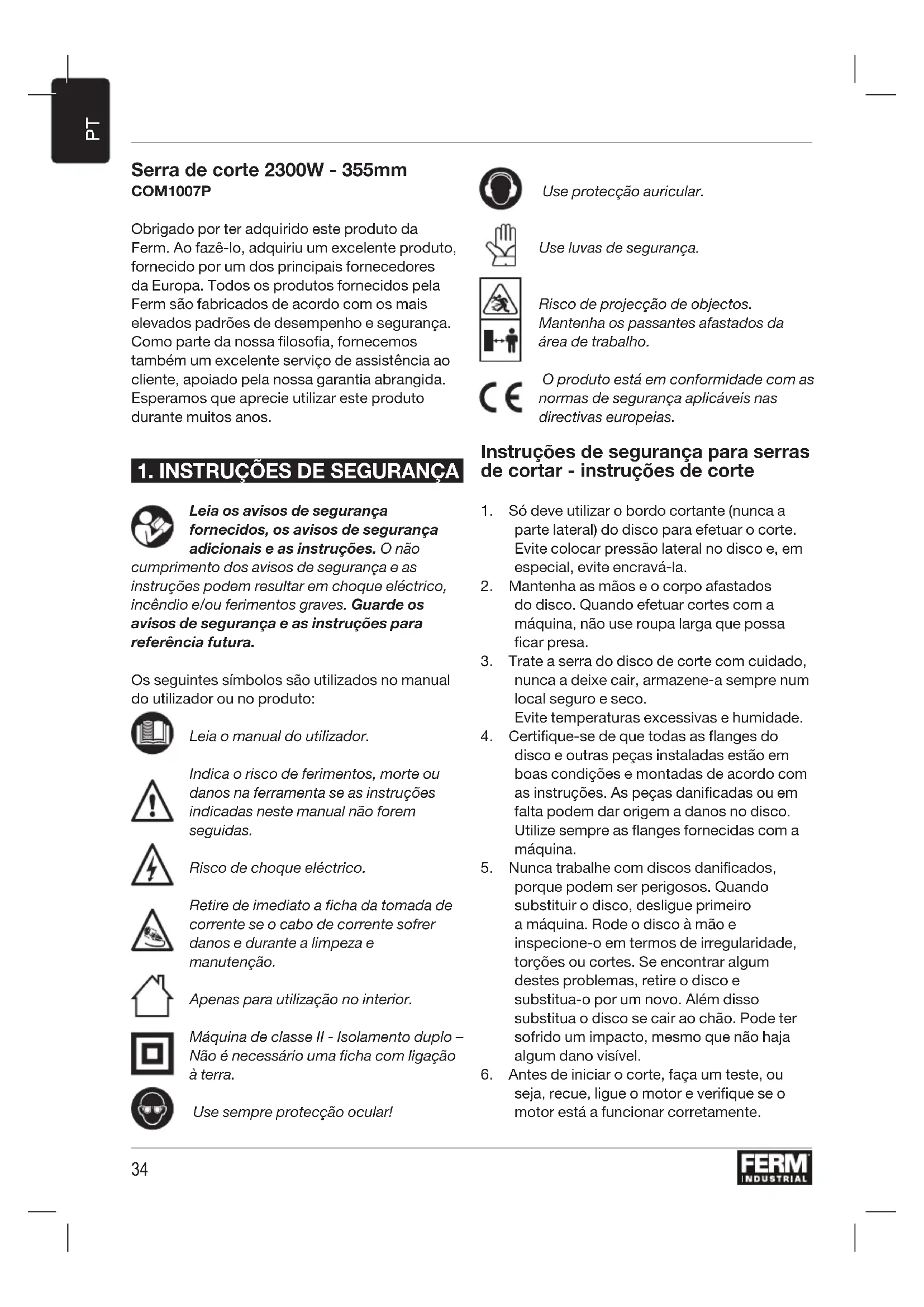 Serra de corte 2300W - 355mm COM1007P Obrigado por ter adquirido este produto da Ferm. Ao fazê-lo, adquiriu um excelente produto, fornecido por um dos principais fornecedores da Europa. Todos os produtos fornecidos pela Ferm são fabricados de acordo com os mais elevados padrões de desempenho e segurança. Como parte da nossa filosofia, fornecemos também um excelente serviço de assistência ao cliente, apoiado pela nossa garantia abrangida. Esperamos que aprecie utilizar este produto durante muitos anos.