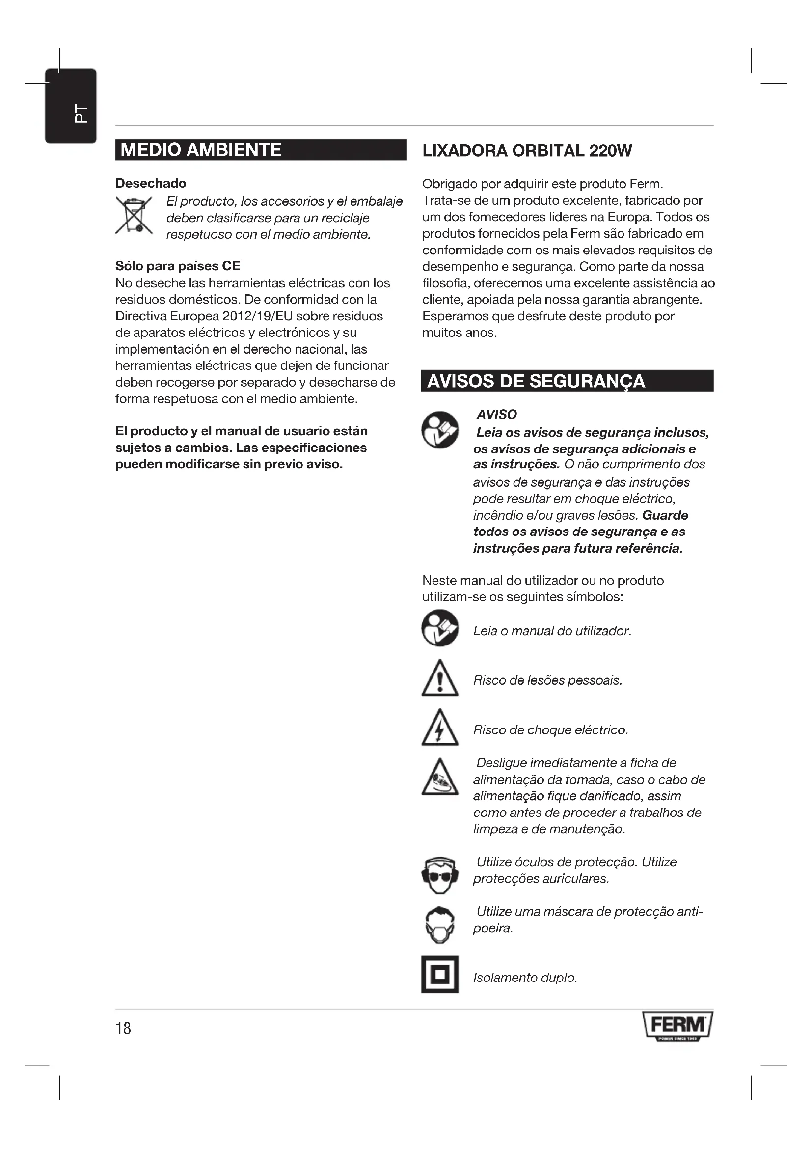 Obrigado por adquirir este produto Ferm. Trata-se de um produto excelente, fabricado por um dos fornecedores líderes na Europa. Todos os produtos fornecidos pela Ferm são fabricado em conformidade com os mais elevados requisitos de desempenho e segurança. Como parte da nossa filosofia, oferecemos uma excelente assistência ao cliente, apoiada pela nossa garantia abrangente. Esperamos que desfrute deste produto por muitos anos.