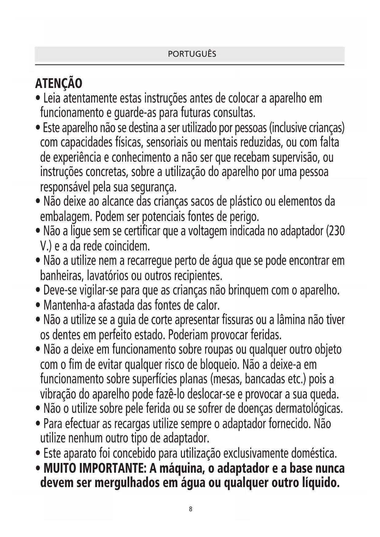 - MUITO IMPORTANTE: A máquina, o adaptador e a base nunca devem ser mergulhados em água ou qualquer outro líquido.9