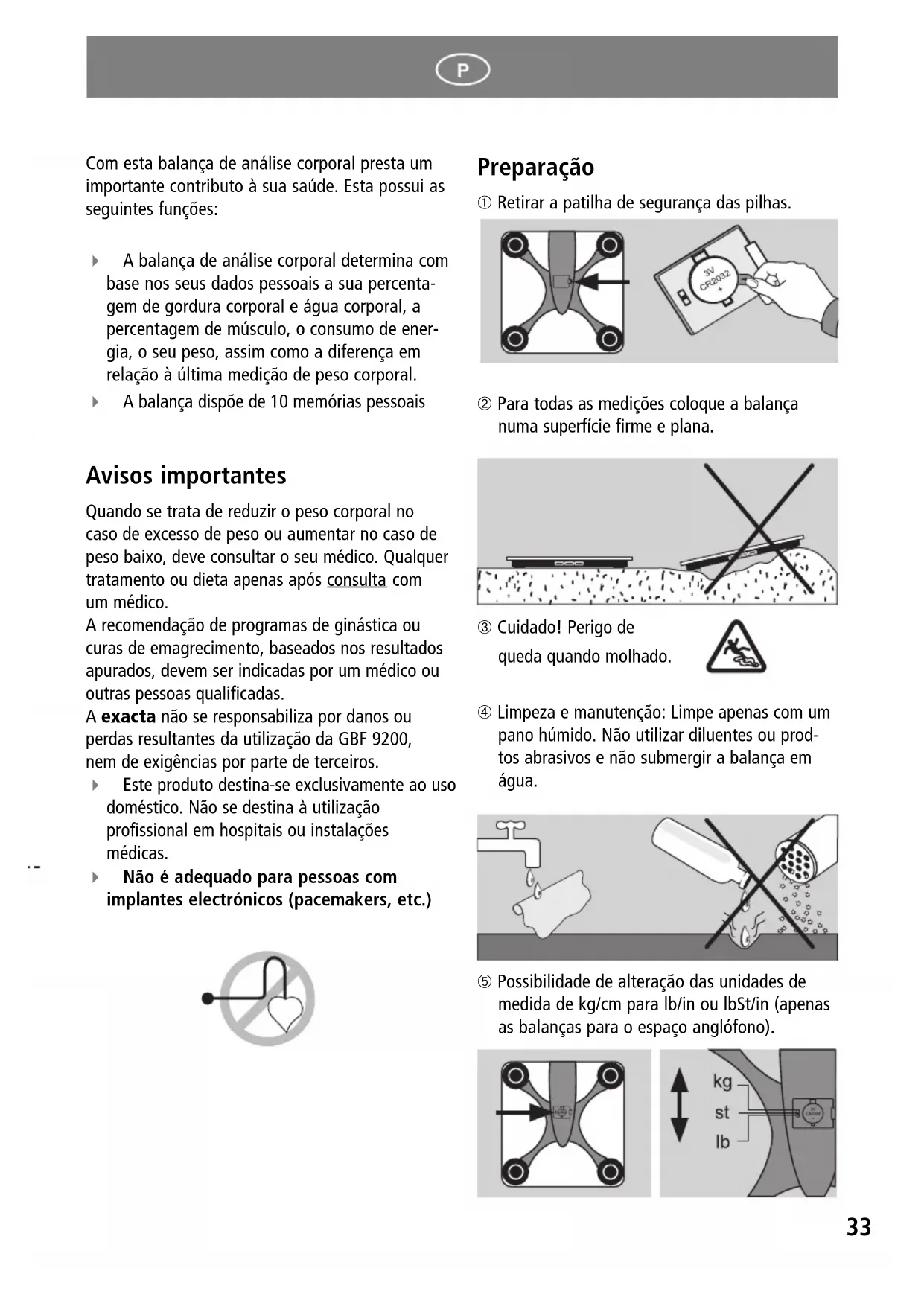 ④ Limpeza e manutençao: Limpe apenas com um pano humido. Não utilizez diluentes ou produtos abrasivos e não submergir a balança em água.