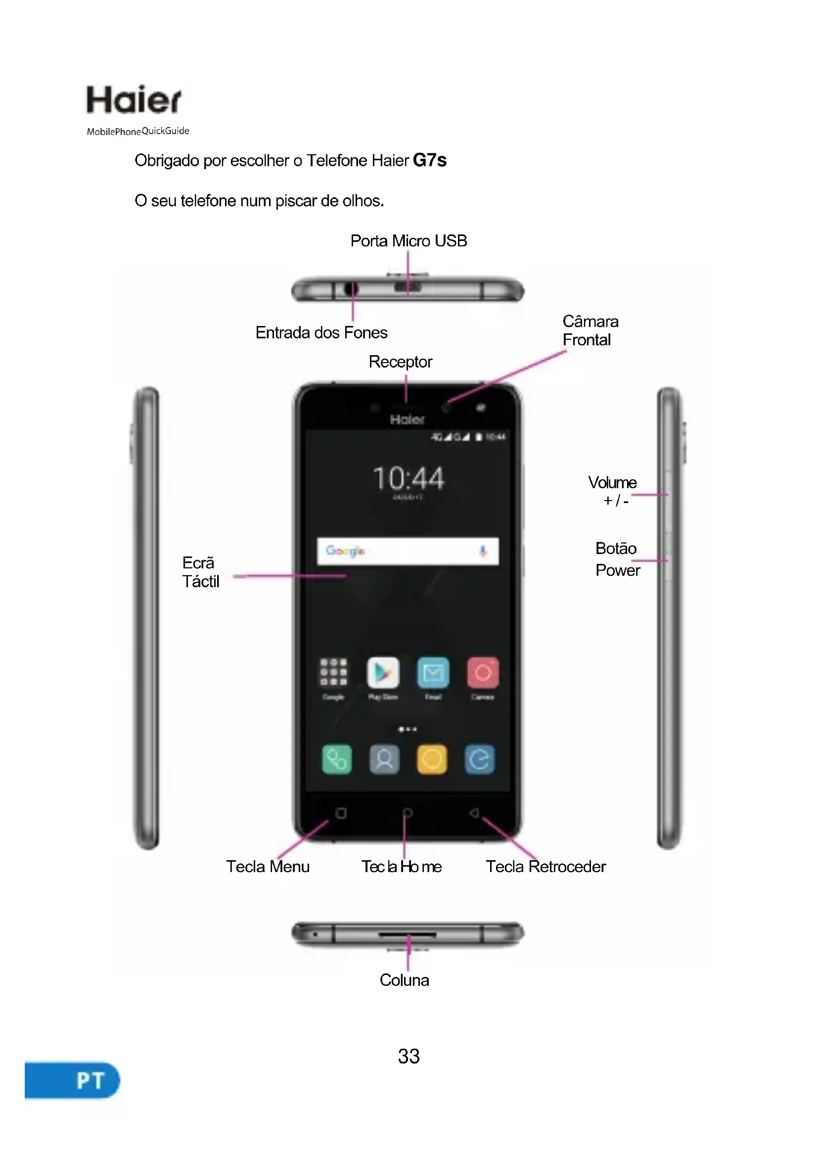 MobilePhone-QuickGuide Cuerpo Obrigado por escolher o Telefone Haier O seu telefone num piscar de olhos.