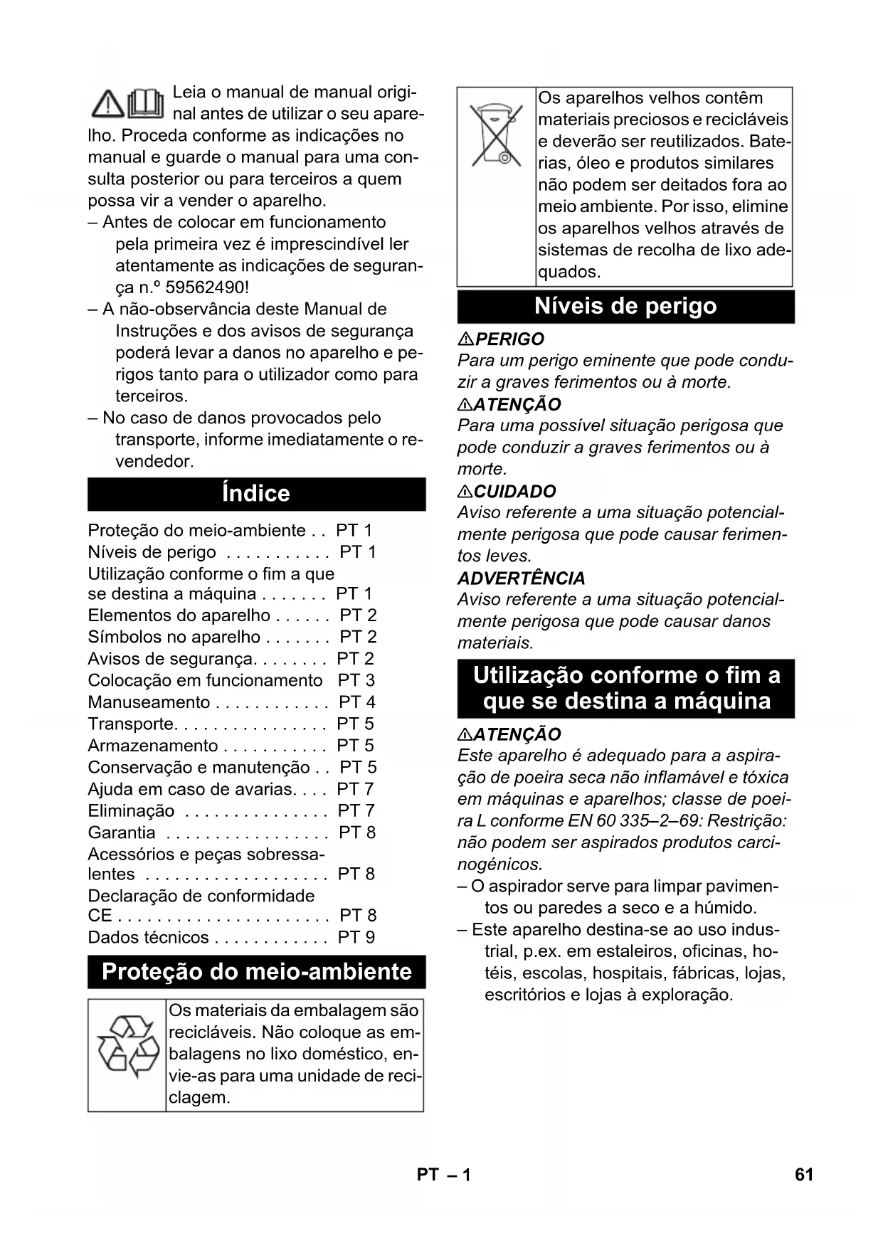 No. de pieza Longitud del cable EU 297.534 7,5 m 60 ES– 1 Leia o manual de manual origi- nal antes de utilizar o seu apare- lho. Proceda conforme as indicações no manual e guarde o manual para uma con- sulta posterior ou para terceiros a quem possa vir a vender o aparelho. – Antes de colocar em funcionamento pela primeira vez é imprescindível ler atentamente as indicações de seguran- ça n.º 59562490! – A não-observância deste Manual de Instruções e dos avisos de segurança poderá levar a danos no aparelho e pe- rigos tanto para o utilizador como para terceiros. – No caso de danos provocados pelo transporte, informe imediatamente o re- vendedor. PERIGO Para um perigo eminente que pode condu- zir a graves ferimentos ou à morte. 몇 ATENÇÃO Para uma possível situação perigosa que pode conduzir a graves ferimentos ou à morte. 몇 CUIDADO Aviso referente a uma situação potencial- mente perigosa que pode causar ferimen- tos leves. ADVERTÊNCIA Aviso referente a uma situação potencial- mente perigosa que pode causar danos materiais. 몇 ATENÇÃO Este aparelho é adequado para a aspira- ção de poeira seca não inflamável e tóxica em máquinas e aparelhos; classe de poei- ra L conforme EN 60 335–2–69: Restrição: não podem ser aspirados produtos carci- nogénicos. – O aspirador serve para limpar pavimen- tos ou paredes a seco e a húmido. – Este aparelho destina-se ao uso indus- trial, p.ex. em estaleiros, oficinas, ho- téis, escolas, hospitais, fábricas, lojas, escritórios e lojas à exploração. Índice Proteção do meio-ambiente . . PT 1 Níveis de perigo . . . . . . . . . . . PT 1 Utilização conforme o fim a que se destina a máquina . . . . . . . PT 1 Elementos do aparelho . . . . . . PT 2 Símbolos no aparelho . . . . . . . PT 2 Avisos de segurança. . . . . . . . PT 2 Colocação em funcionamento PT 3 Manuseamento . . . . . . . . . . . . PT 4 Transporte. . . . . . . . . . . . . . . . PT 5 Armazenamento . . . . . . . . . . . PT 5 Conservação e manutenção . . PT 5 Ajuda em caso de avarias. . . . PT 7 Eliminação . . . . . . . . . . . . . . . PT 7 Garantia . . . . . . . . . . . . . . . . . PT 8 Acessórios e peças sobressa- lentes . . . . . . . . . . . . . . . . . . . PT 8 Declaração de conformidade CE . . . . . . . . . . . . . . . . . . . . . . PT 8 Dados técnicos . . . . . . . . . . . . PT 9 Proteção do meio-ambiente Os materiais da embalagem são recicláveis. Não coloque as em- balagens no lixo doméstico, en- vie-as para uma unidade de reci- clagem. Os aparelhos velhos contêm materiais preciosos e recicláveis e deverão ser reutilizados. Bate- rias, óleo e produtos similares não podem ser deitados fora ao meio ambiente. Por isso, elimine os aparelhos velhos através de sistemas de recolha de lixo ade- quados. Níveis de perigo Utilização conforme o fim a que se destina a máquina 61PT– 2 1 Eléctrodos 2 Tubo flexível de aspiração 3 Gancho de cabo 4 Saída do ar, ar de trabalho 5 Bloqueio da cabeça de aspiração 6 Adaptador universal 7 Entrada de ar, ar de refrigeração do motor 8 Recipiente de sujidades 9 Cabeçote de aspiração 10 Rolo de guia 11 Bocal de aspiração 12 Bico para pavimentos (não incluído no volume de fornecimento) 13 Tubo de aspiração (não incluído no vo- lume de fornecimento) 14 Pega para portar 15 Tampa do filtro 16 Tubo curvo (não incluído no volume de fornecimento) 17 Regulador da força de aspiração (contínua) 18 Regulador de rotação para potência de aspiração (mín-máx) 19 Lâmpada de controlo 20 Tomada 21 Limpeza automática do filtro 22 Interruptor principal 23 Filtro de pregas 24 Limpeza do filtro 25 Suporte do bocal de chão 26 Suporte para bico de juntas 27 Suporte para tubos de aspiração 28 Cabo de rede 29 Placa de tipo 몇 ATENÇÃO – Quando o ar de exaustão for enviado novamente para o ambiente, e impres- cindível existir uma gama suficiente de troca de ar (L) no local. Para manter os valores-limite exigidos, o débito máxi- mo de ar viciado não poderá ser supe- rior a 50% do débito de ar fresco (volu- me da sala V