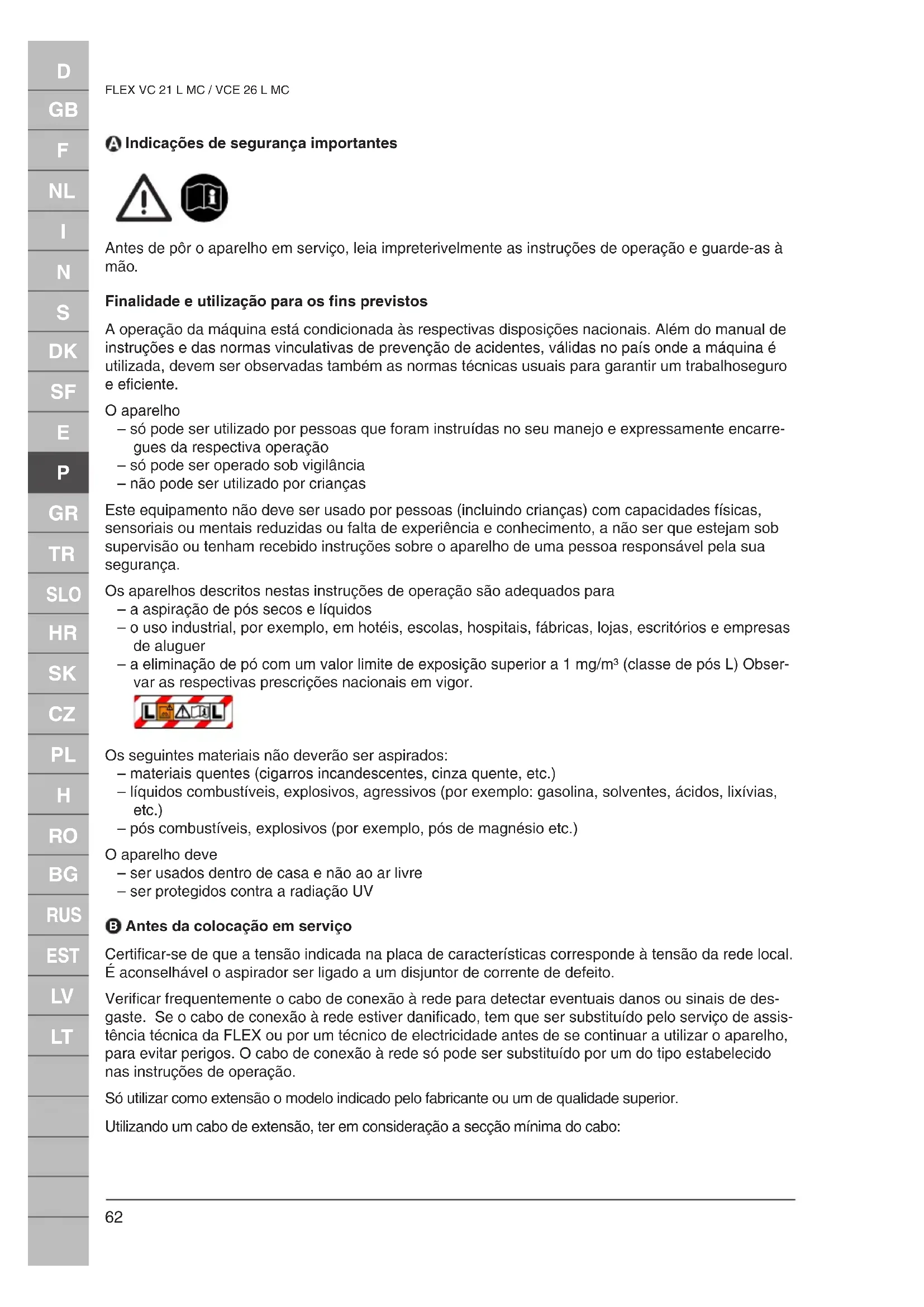 Antes da colocação em serviço Certificar-se de que a tensão indicada na placa de características corresponde à tensão da rede local. É aconselhável o aspirador ser ligado a um disjuntor de corrente de defeito. Verificar frequentemente o cabo de conexão à rede para detectar eventuais danos ou sinais de des- gaste. Se o cabo de conexão à rede estiver danificado, tem que ser substituído pelo serviço de assis- tência técnica da FLEX ou por um técnico de electricidade antes de se continuar a utilizar o aparelho, para evitar perigos. O cabo de conexão à rede só pode ser substituído por um do tipo estabelecido nas instruções de operação. Só utilizar como extensão o modelo indicado pelo fabricante ou um de qualidade superior. Utilizando um cabo de extensão, ter em consideração a secção mínima do cabo:D