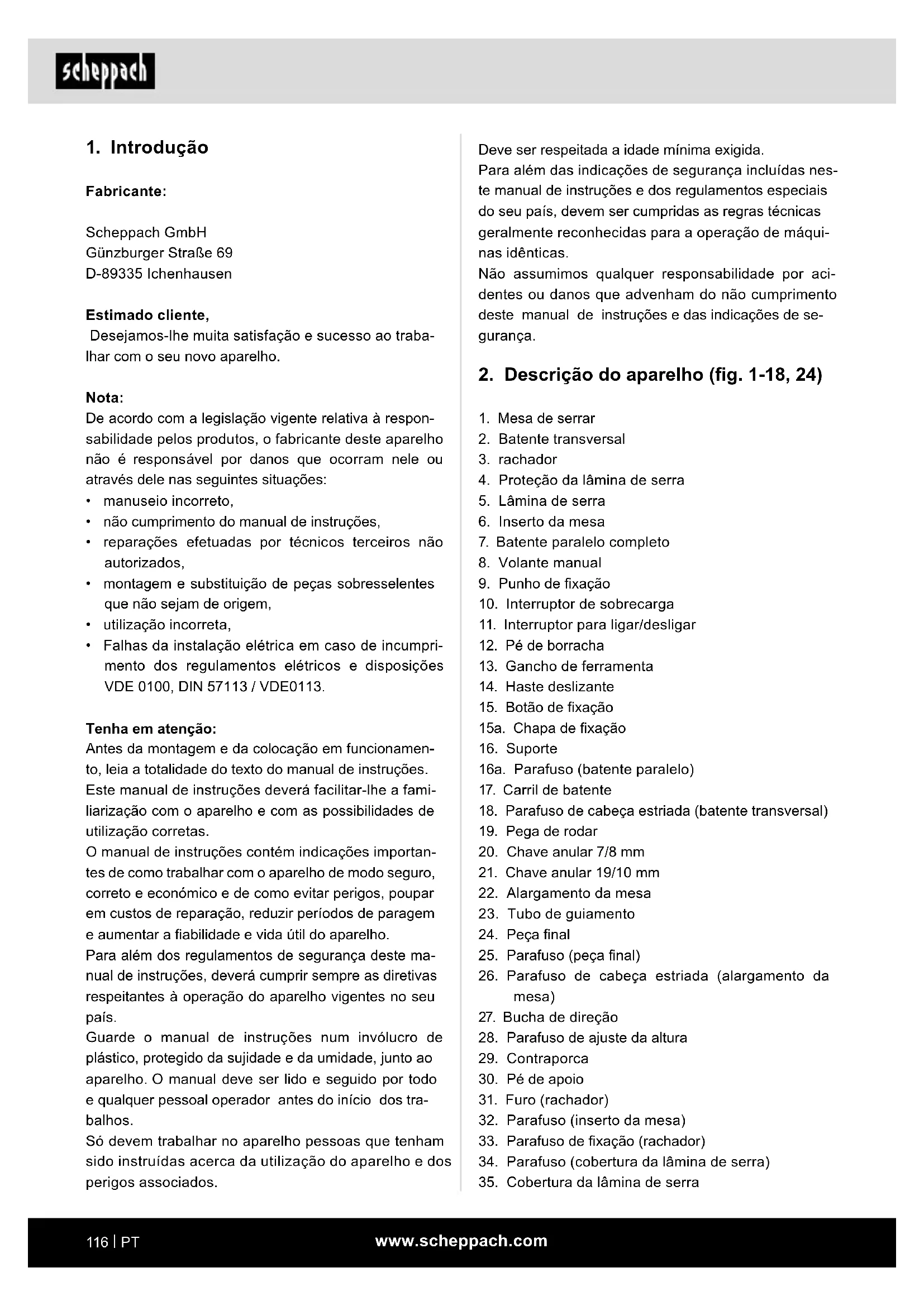 - Falhas da instalação elétrica em caso de incumpri- mento dos regulamentos elétricos e disposições VDE 0100, DIN 57113 / VDE0113. Tenha em atenção: Antes da montagem e da colocação em funcionamen- to, leia a totalidade do texto do manual de instruções. Este manual de instruções deverá facilitar-lhe a fami- liarização com o aparelho e com as possibilidades de utilização corretas. O manual de instruções contém indicações importan- tes de como trabalhar com o aparelho de modo seguro, correto e económico e de como evitar perigos, poupar em custos de reparação, reduzir períodos de paragem e aumentar a abilidade e vida útil do aparelho. Para além dos regulamentos de segurança deste ma- nual de instruções, deverá cumprir sempre as diretivas respeitantes à operação do aparelho vigentes no seu país. Guarde o manual de instruções num invólucro de plástico, protegido da sujidade e da umidade, junto ao aparelho. O manual deve ser lido e seguido por todo e qualquer pessoal operador antes do início dos tra- balhos. Só devem trabalhar no aparelho pessoas que tenham sido instruídas acerca da utilização do aparelho e dos perigos associados.www.scheppach.com