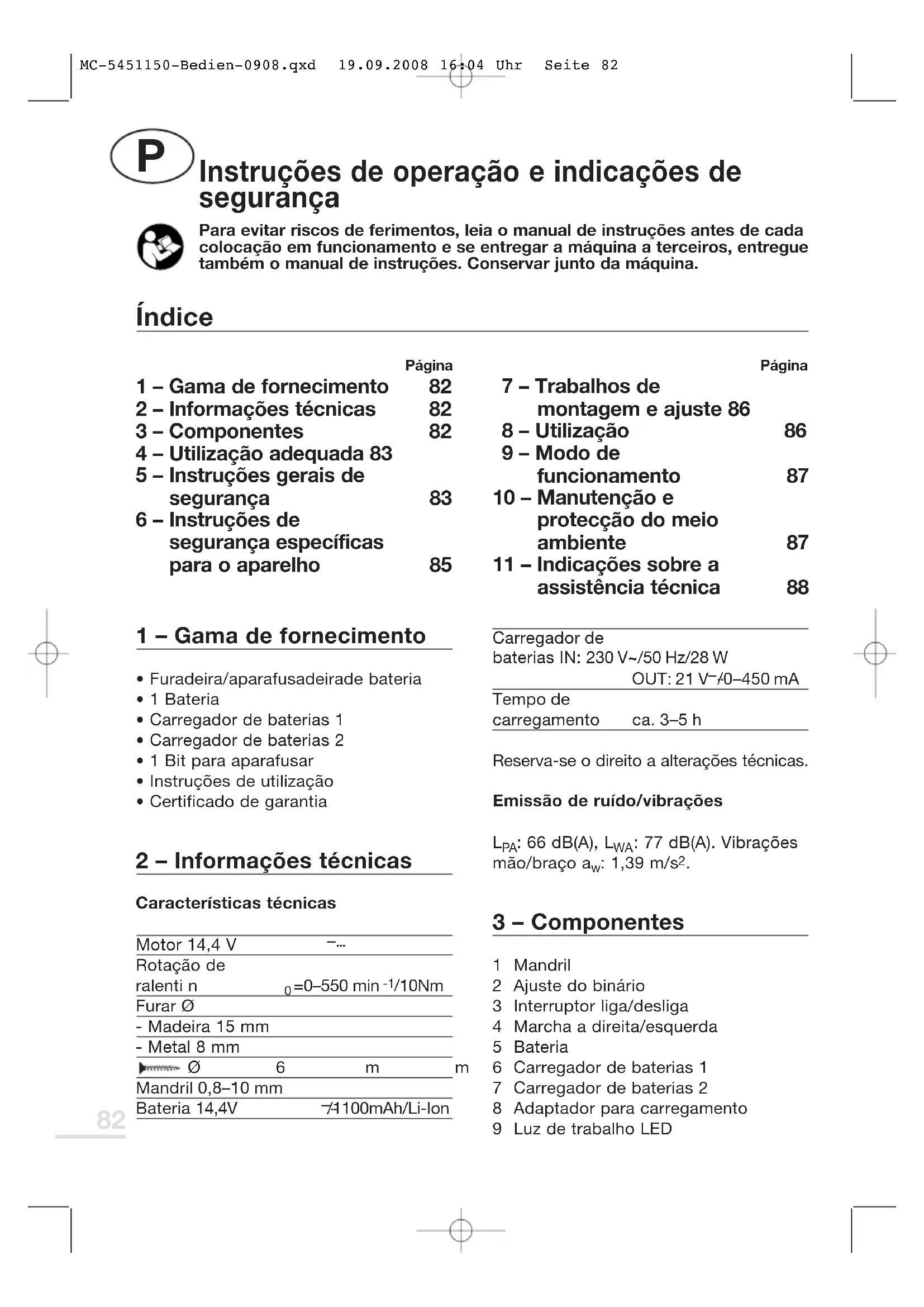 | Carregador de baterias IN: 230 V~/50 Hz/28 W OUT: 21 V- /0-450 mA | |
