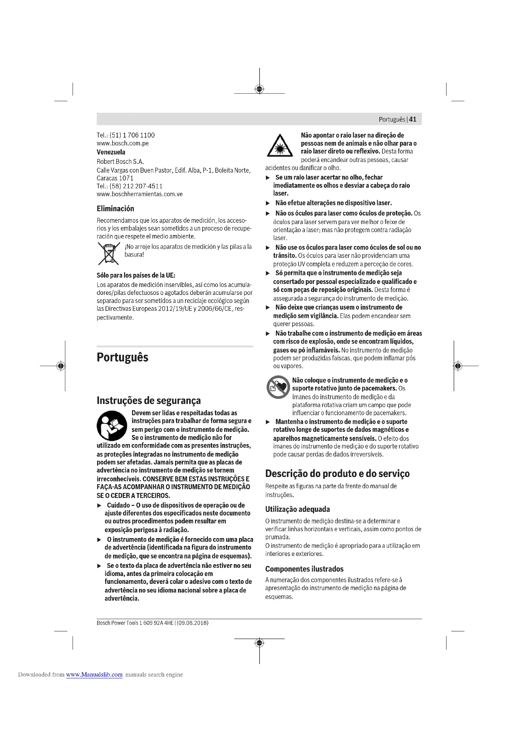 – Divergência 0,8mrad (ângulo completo) 0,8mrad (ângulo completo) Encaixe do tripé 1/4", 5/8" 1/4", 5/8" Downloaded from www.Manualslib.com manuals search engineLaser por pontos e linear GCL 2-15 GCL 2-15 G Pilhas 3 × 1,5 V LR6 (AA) 3 × 1,5 V LR6 (AA) Tempo de autonomia no modo de operação – Operação com linhas cruzadas e pontos 6 h 6 h – Operação com linhas cruzadas 8 h 8 h – Operação com linhas e pontos 12 h 10 h – Operação com linhas 16 h 12 h – Operação com pontos 22 h 22 h Peso conforme EPTA-Procedure 01:2014 0,49 kg 0,49 kg Dimensões (comprimento × largura × altura) – sem suporte rotativo 112 × 55 × 106 mm 112 × 55 × 106 mm – com suporte rotativo 132 × 81 × 163 mm 132 × 81 × 163 mm Tipo de proteção IP 54 (protegido contra pó e projeção de água) IP 54 (protegido contra pó e projeção de água) A) O raio de ação pode ser reduzido por condições ambiente desfavoráveis (por exemplo radiação solar direta). B) Só surge sujidade não condutora, mas ocasionalmente é esperada uma condutividade temporária causada por condensação. Para uma identificação inequívoca do seu instrumento de medição, consulte o número de série (11) na placa de identificação. Montagem Colocar/trocar pilhas Para a operação do instrumento de medição, é recomendável utilizar pilhas de mangano alcalino. Abra a tampa do compartimento das pilhas (6) e coloque as pilhas. Tenha atenção à polaridade correta de acordo com a representação no interior do compartimento das pilhas. Se as pilhas estiverem fracas, a indicação da capacidade das pilhas (2) pisca a verde. Adicionalmente, as linhas laser piscam a cada 10min durante aprox. 5s. O instrumento de medição ainda pode ser operado durante aprox. 1h a partir do momento em que a indicação começa a piscar. Quando as pilhas estiverem gastas, as linhas laser ainda piscam novamente imediatamente antes do desligamento automático. Substitua sempre todas as pilhas em simultâneo. Utilize apenas pilhas de um fabricante e com a mesma capacidade. u Retire as pilhas do instrumento de medição se não forem utilizadas durante longos períodos. Em caso de armazenamento prolongado, as pilhas podem ficar corroídas ou descarregar-se automaticamente. Trabalhar com o suporte rotativo RM1 (ver figurasA1–A3) Com a ajuda do suporte rotativo (13) pode rodar o instrumento de medição a 360 em torno de um ponto de prumada central, sempre visível. Dessa forma, é possível definir as linhas laser com precisão, sem alterar a posição do instrumento de medição. Coloque o instrumento de medição com a ranhura de guia (7) na calha de guia (14) da plataforma rotativa (13) e empurre o instrumento de medição até ao batente na plataforma. Para separar, puxe o instrumento de medição no sentido oposto do suporte rotativo. Opções de posicionamento do suporte rotativo: – na vertical sobre uma superfície nivelada, – aparafusado numa superfície vertical, – em molduras de teto metálicas, em combinação com o grampo de teto (17), – em superfícies metálicas, com a ajuda dos ímanes (16). Funcionamento Colocação em funcionamento u Proteja o instrumento de medição da humidade e da radiação solar direta. u Não exponha o instrumento de medição a temperaturas extremas ou oscilações de temperatura. Não os deixe, p. ex., ficar durante muito tempo no automóvel. No caso de oscilações de temperatura maiores, deixe o instrumento de medição atingir a temperatura ambiente antes de o utilizar. No caso de temperaturas ou de oscilações de temperatura extremas é possível que a precisão do instrumento de medição seja prejudicada. u Evite quedas ou embates violentos com o instrumento de medição. Após severas influências externas no instrumento de medição, recomendamos que se proceda a um controlo de exatidão antes de prosseguir (ver "Controlo de exatidão do instrumento de medição", Página45). u Desligue o instrumento de medição quando o transporta. A unidade pendular é bloqueada logo que o Português | 43 Bosch Power Tools 1 609 92A 4HE | (09.08.2018) Downloaded from www.Manualslib.com manuals search engine44 | Português 1 609 92A 4HE | (09.08.2018) Bosch Power Tools instrumento for desligado, caso contrário poderia ser danificado devido a fortes movimentos. Ligar/desligar Para ligar o instrumento de medição, desloque o interruptor de ligar/desligar (8) para a posição " On" (para trabalhos sem nivelamento automático) ou para a posição " On" (para trabalhos sem nivelamento automático). Imediatamente após a ligação, o instrumento de medição projeta linhas laser a partir dos pontos de saída (1). u Não apontar o raio de laser na direção de pessoas nem de animais e não olhar no raio laser, nem mesmo de maiores distâncias. Para desligar o instrumento de medição, desloque o interruptor de ligar/desligar (8) para a posição "Off". Ao desligar, a unidade pendular bloqueia. u Não deixe o instrumento de medição ligado sem vigilância e desligue o instrumento de medição após utilização. Outras pessoas poderiam ser cegadas pelo raio laser. Ao exceder a temperatura de serviço máxima permitida de 50°C ocorre um desligamento para proteção do díodo laser. Depois de arrefecer, o instrumento de medição volta a estar operacional e pode ser novamente ligado. Dispositivo de desligamento automático Se não for premida nenhuma tecla no instrumento de medição durante aprox. 120 minutos, o instrumento de medição desliga-se automaticamente para efeitos de economia das pilhas. Para voltar a ligar o instrumento de medição após o desligamento automático, pode deslocar primeiro o interruptor de ligar/desligar (8) para a posição "Off" e depois voltar a ligar o instrumento de medição ou pressionar uma vez a tecla modo de operação ponto laser (4) ou a tecla modo de operação linha laser (5). Desativar o dispositivo de desligamento automático temporariamente