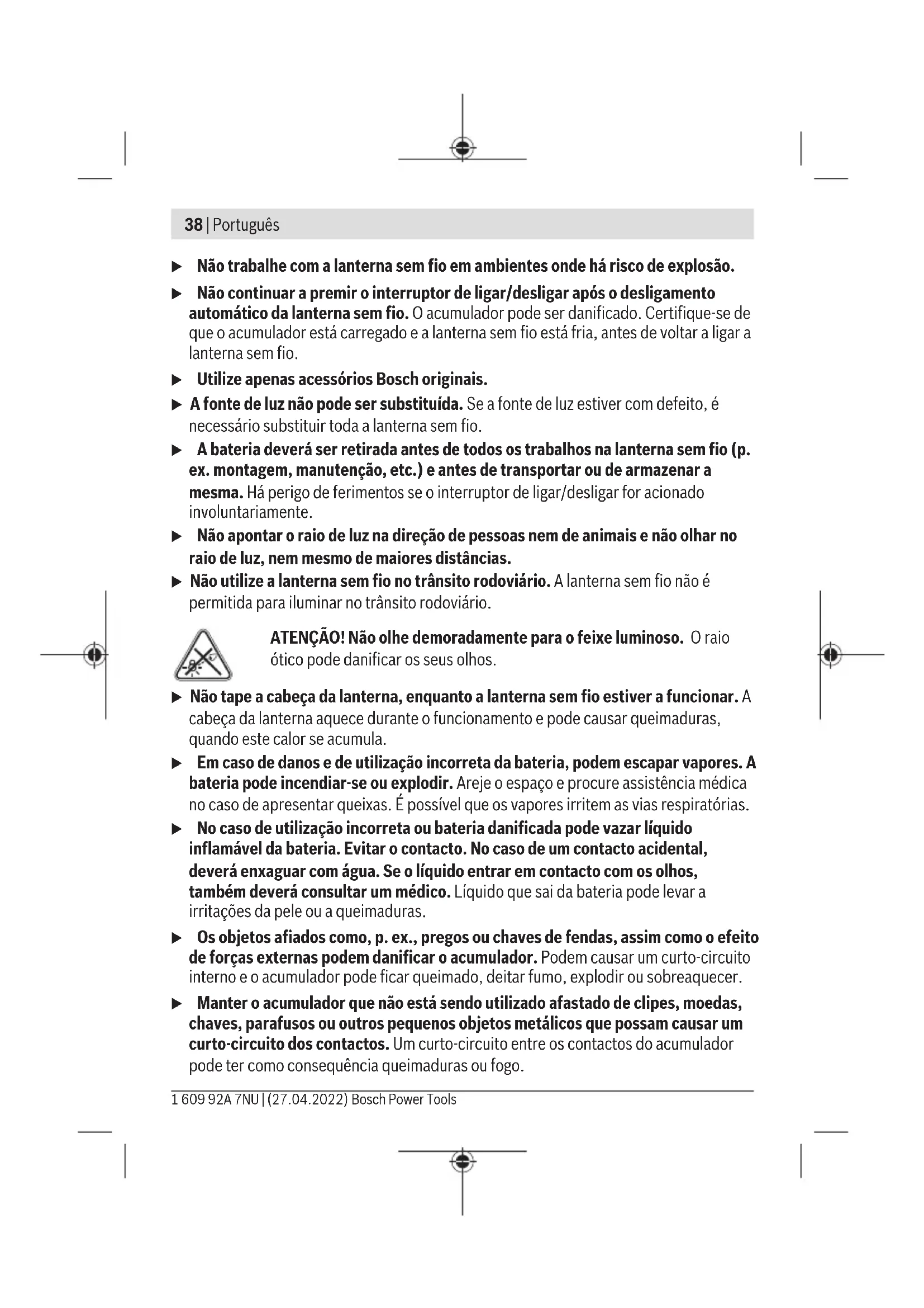 e durante o armazenamento °C –20...+50 Baterias recomendadas GBA 18V... ProCORE18V... Carregadores recomendados GAL 18... GAX 18... GAL 36... A) Potência limitada com temperaturas <0 °C A reprodução das cores dos objetos iluminados pode não corresponder à cor real. Montagem Carregar a bateria (acessório) u Utilize apenas os carregadores listados nos dados técnicos. Só estes carregadores são apropriados para as baterias de iões de lítio utilizadas para a sua lanterna a bateria. 1 609 92A 7NU | (27.04.2022) Bosch Power ToolsPortuguês | 41 Nota: A bateria é fornecida parcialmente carregada. Para assegurar a completa potência da bateria, a bateria deverá ser carregada completamente no carregador antes da primeira utilização. A bateria de iões de lítio pode ser carregada a qualquer altura, sem que a sua vida útil seja reduzida. Uma interrupção do processo de carga não danifica a bateria. O acumulador de iões de lítio está protegido contra descarga completa pelo sistema "Electronic Cell Protection (ECP)". Com a bateria descarregada, a lanterna sem fio é desligada através de uma comutação de proteção. u Não continuar a premir o interruptor de ligar/desligar após o desligamento automático da lanterna sem fio. O acumulador pode ser danificado. Certifique-se de que o acumulador está carregado e a lanterna sem fio está fria, antes de voltar a ligar a lanterna sem fio. Para retirar a bateria (4) pressione a tecla de desbloqueio da bateria (5) e puxe a bateria para a retirar da lanterna sem fio. Não empregar força. Observe as indicações sobre a eliminação de forma ecológica. Funcionamento Colocação em funcionamento Colocar a bateria Coloque a bateria(4) carregada na cabeça da lanterna(3) até esta engatar de forma percetível e ficar à face com a cabeça da lanterna. Instalar Coloque a lanterna sem fio sobre uma base estável e plana. Assegure-se de um apoio seguro. Ligar/desligar Para a colocação em funcionamento da lanterna sem fio prima o interruptor de ligar/ desligar(2). Para desligar a lanterna sem fio, prima de novo o interruptor de ligar/desligar(2). Indicador da proteção contra sobrecarga Ao exceder a temperatura permitida dos dissipadores térmicos de 60°C a lanterna sem fio pisca 3x e desliga-se. Deixe a lanterna sem fio arrefecer e ligue novamente a lanterna sem fio. Bosch Power Tools 1 609 92A 7NU | (27.04.2022)42 | Português Indicador do nível de carga da bateria Os LEDs verdes do indicador do nível de carga da bateria indicam o nível de carga da bateria. Por motivos de segurança, a consulta do nível de carga só é possível com a ferramenta elétrica parada. Prima a tecla para o indicador do nível de carga da bateria ou para visualizar o nível de carga. Isto também é possível com a bateria removida. Se, depois de premir a tecla para o indicador do nível de carga da bateria, não se acender qualquer LED, a bateria tem defeito e tem de ser substituída. Tipo de bateria GBA 18V... LEDs Capacidade Luz permanente 3× verde 60–100% Luz permanente 2× verde 30–60% Luz permanente 1× verde 5–30% Luz intermitente 1× verde 0–5% Tipo de bateria ProCORE18V... LEDs Capacidade Luz permanente 5× verde 80−100% Luz permanente 4× verde 60−80% Luz permanente 3× verde 40−60% Luz permanente 2× verde 20−40% Luz permanente 1× verde 5−20% Luz intermitente 1× verde 0−5% Instruções de trabalho A lanterna sem fio ilumina com pouca luminosidade quanto a duração de iluminação restante é ≤10 minutos. 1 609 92A 7NU | (27.04.2022) Bosch Power ToolsPortuguês | 43 Rodar a cabeça da lanterna (verfiguraA) Pode girar a cabeça da lanterna(3) em no máximo 135° em passos de 27°. Alça de transporte (verfiguraB) Com a alça de transporte(7) a lanterna sem fio pode ser transportada ou fixada a um objeto. Manutenção e assistência técnica Manutenção e limpeza u A bateria deverá ser retirada antes de todos os trabalhos na lanterna sem fio (p. ex. montagem, manutenção, etc.) e antes de transportar ou de armazenar a mesma. Há perigo de ferimentos se o interruptor de ligar/desligar for acionado involuntariamente. A lanterna sem fio não requer manutenção e nenhuma das suas peças necessita de manutenção ou precisa ser substituída. Para evitar danos, o vidro de plástico da lanterna sem fio só deve ser limpo com um pano macio e seco. Não utilize detergentes ou solventes. Serviço pós-venda e aconselhamento O serviço pós-venda responde às suas perguntas a respeito de serviços de reparação e de manutenção do seu produto, assim como das peças sobressalentes. Desenhos explodidos e informações acerca das peças sobressalentes também em: www.bosch- pt.com A nossa equipa de consultores Bosch esclarece com prazer todas as suas dúvidas a respeito dos nossos produtos e acessórios. Indique para todas as questões e encomendas de peças sobressalentes a referência de 10 dígitos de acordo com a placa de caraterísticas do produto. Portugal Robert Bosch LDA Avenida Infante D. Henrique Lotes 2E – 3E 1800 Lisboa Para efetuar o seu pedido online de peças entre na página www.ferramentasbosch.com. Tel.: 21 8500000 Fax: 21 8511096 Bosch Power Tools 1 609 92A 7NU | (27.04.2022)44 | Português Encontra outros endereços da assistência técnica em: www.bosch-pt.com/serviceaddresses Transporte As baterias de iões de lítio recomendadas estão sujeitas ao direito de materiais perigosos. As baterias podem ser transportadas na rua pelo utilizador, sem mais obrigações. Na expedição por terceiros (porex: transporte aéreo ou expedição), devem ser observadas as especiais exigências quanto à embalagem e à designação. Neste caso é necessário consultar um especialista de materiais perigosos ao preparar a peça a ser trabalhada. Só enviar baterias se a carcaça não estiver danificada. Colar contactos abertos e embalar a bateria de modo que não possa se movimentar dentro da embalagem. Por favor observe 