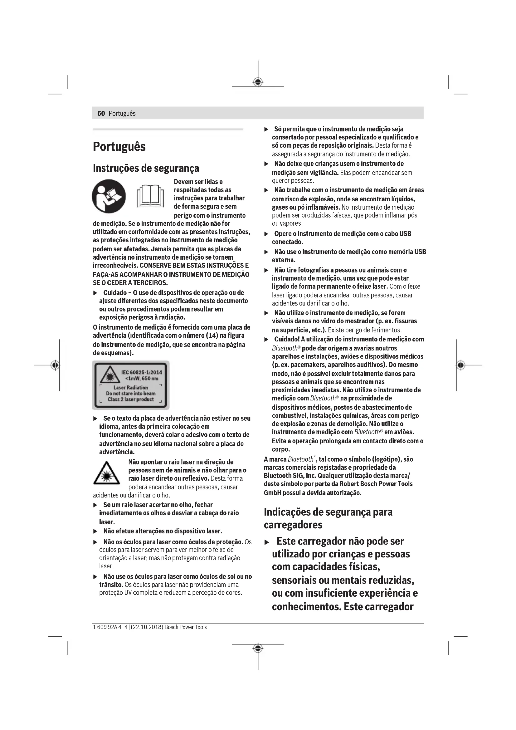 estabelecer uma ligação, conforme o modelo e o sistema operativo. Os aparelhos Bluetooth® têm de suportar o perfil GATT. Uma longa autonomia de funcionamento da bateria é alcançada através de medidas economizadoras de energia p. ex. desativação da função Bluetooth®, se esta não for necessária ou redução da luminosidade do mostrador etc. Para uma identificação inequívoca do seu instrumento de medição, consulte o número de série (15) na placa de características. Primeira colocação em funcionamento Carregar a bateria u Utilize apenas os carregadores listados nos dados técnicos. Só estes carregadores são apropriados para as baterias de lítio utilizados para o seu instrumento de medição. u A utilização de carregadores de outros fabricantes pode causar defeitos no instrumento de medição; também uma tensão mais elevada (p. ex. 12V) de um carregador de automóvel não é adequada para carregar este instrumento de medição. Em caso de inobservância, a garantia perde a validade. u Observar a tensão de rede! A tensão da fonte de corrente deve coincidir com a chapa de características do carregador. Nota: A bateria é fornecida parcialmente carregada. Para garantir o desempenho máximo da bateria, carregue a bateria totalmente antes da primeira utilização. Nota: A tomada Micro-USB(16) para ligação do cabo Micro- USB (22) encontra-se na cobertura do pino de medição (8). Para abrir a cobertura, pressione o botão de disparo (7). A bateria de iões de lítio pode ser carregada a qualquer altura, sem que a sua vida útil seja reduzida. Uma interrupção do processo de carga não danifica a bateria. Se o segmento inferior do indicador do nível de carga da bateria (g) piscar, já só podem ser efetuadas poucas medições. Carregar a bateria. Se a armação em redor dos segmentos do indicador do nível de carga da bateria (g) piscar, deixa de ser possível efetuar medições. O instrumento de medição só pode ser utilizado durante um breve período de tempo (p. ex. para verificar entradas da lista de valores de medição). Carregar a bateria. Ligue o instrumento de medição através do cabo Micro- USB(22) fornecido ao carregador (23). Ligue o carregador (23) à tomada. O processo de carga começa. O indicador do nível de carga da bateria (g) mostra o processo de carregamento. Durante o processo de carga os segmentos piscam um após o outro. Se forem exibidos todos os segmentos do indicador do nível de carga da bateria (g) então a bateria está carregada por completo. Em caso de um período de não utilização prolongado, separe o carregador da rede elétrica. Adicionalmente, a bateria também pode ser carregada numa porta USB. Para tal, conecte o instrumento de medição com o micro cabo USB a uma porta USB. Em caso de funcionamento com USB (modo de carregamento, transmissão de dados), o tempo de carregamento pode ser consideravelmente prolongado. O instrumento de medição não pode ser utilizado de forma independente durante o processo de carregamento. O Bluetooth® desliga-se durante o processo de carregamento. As ligações existentes com outros aparelhos são interrompidas. Nesta ocasião, os dados podem perder- se. Notas para o manuseamento ideal da bateria no instrumento de medição Armazene o instrumento de medição apenas na faixa de temperatura permitida, (ver "Dados técnicos", Página62). Não deixe o instrumento de medição, p. ex., dentro do carro no Verão. Um período de funcionamento reduzido após o carregamento, indica que a bateria está gasta e que deve ser substituída pelo serviço de assistência técnica da Bosch. Observe as indicações sobre a eliminação de forma ecológica. Funcionamento Colocação em funcionamento u Não deixe o instrumento de medição ligado sem vigilância e desligue o instrumento de medição após utilização. Outras pessoas poderiam ser cegadas pelo raio laser. Português | 63 Bosch Power Tools 1 609 92A 4F4 | (22.10.2018)64 | Português 1 609 92A 4F4 | (22.10.2018) Bosch Power Tools u Proteja o instrumento de medição da humidade e da radiação solar direta. u Não exponha o instrumento de medição a temperaturas extremas ou oscilações de temperatura. Não os deixe, p. ex., ficar durante muito tempo no automóvel. No caso de oscilações de temperatura maiores, deixe o instrumento de medição atingir a temperatura ambiente antes de o utilizar. No caso de temperaturas ou de oscilações de temperatura extremas é possível que a precisão do instrumento de medição seja prejudicada. u Evite quedas ou embates violentos com o instrumento de medição. Após severas influências externas no instrumento de medição, recomendamos que se proceda a um controlo de exatidão antes de prosseguir Controlo de exatidão do instrumento de medição. u O instrumento de medição está equipado com uma interface sem fio. Devem ser respeitadas as limitações de utilização locais, p. ex. em aviões ou hospitais. Ligar/desligar Durante o trabalho, certifique-se de que a lente recetora (20), a saída do feixe laser (18) e a câmara (19) não ficam fechadas ou tapadas, caso contrário, não é possível efetuar medições corretas. – Para ligar o instrumento de medição e o laser, prima brevemente a tecla de medição (2) dianteira ou lateral