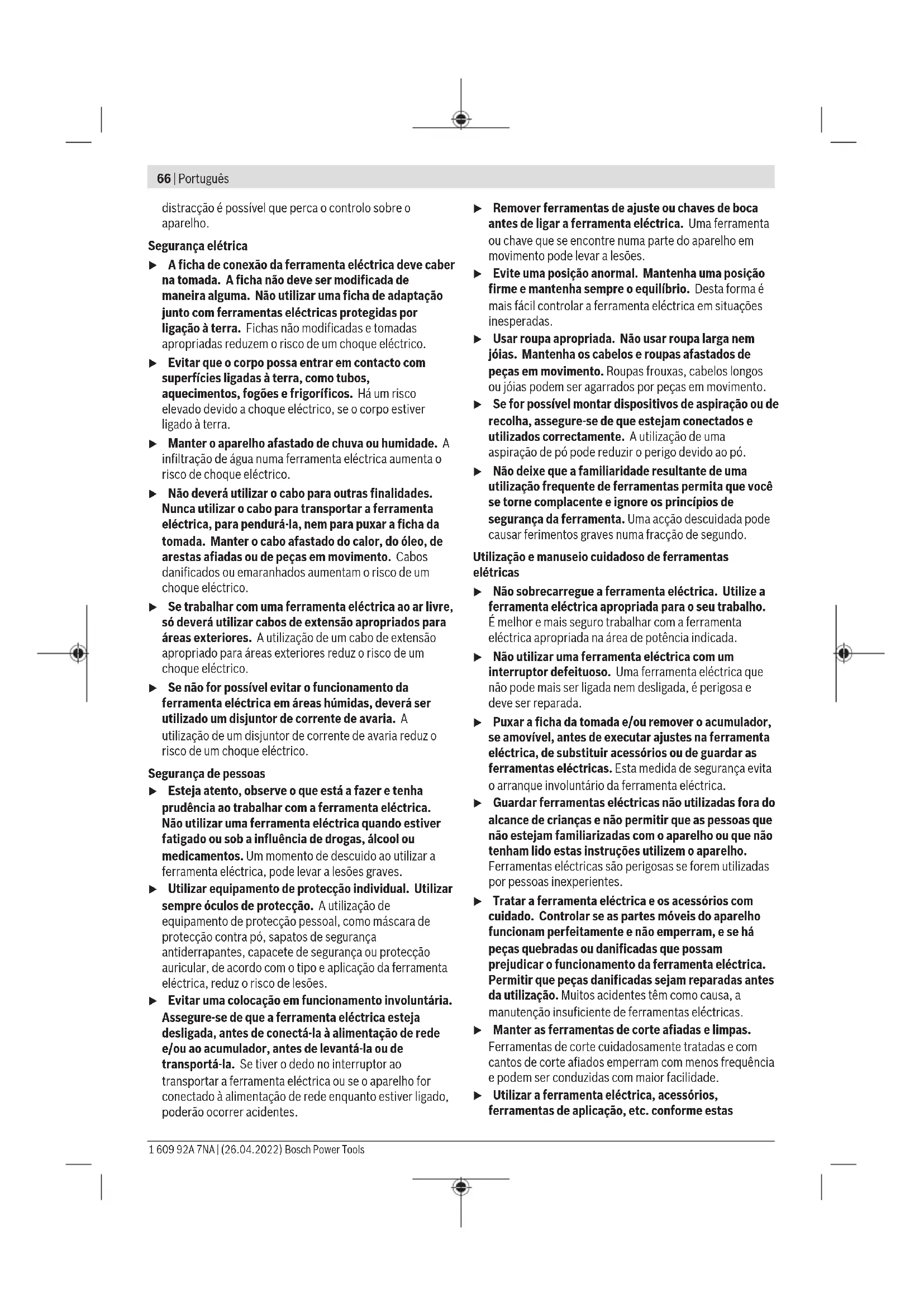 Servicio técnico y atención al cliente El servicio técnico le asesorará en las consultas que pueda Ud. tener sobre la reparación y mantenimiento de su produc- to, así como sobre piezas de recambio. Las representacio- nes gráficas tridimensionales e informaciones de repuestos se encuentran también bajo: www.bosch-pt.com El equipo asesor de aplicaciones de Bosch le ayuda gustosa- mente en caso de preguntas sobre nuestros productos y sus accesorios. Para cualquier consulta o pedido de piezas de repuesto es imprescindible indicar el nº de artículo de 10dígitos que fi- gura en la placa de características del producto. España Robert Bosch España S.L.U. Departamento de ventas Herramientas Eléctricas C/Hermanos García Noblejas, 19 28037 Madrid Para efectuar su pedido online de recambios o pedir la reco- gida para la reparación de su máquina, entre en la página www.herramientasbosch.net. Tel. Asesoramiento al cliente: 902 531 553 Fax: 902 531554 Direcciones de servicio adicionales se encuentran bajo: www.bosch-pt.com/serviceaddresses Eliminación Recomendamos que las herramientas eléctricas, accesorios y embalajes sean sometidos a un proceso de recuperación que respete el medio ambiente. ¡No arroje las herramientas eléctricas a la basu- ra! Sólo para los países de laUE: Conforme a la Directiva Europea 2012/19/UE sobre apara- tos eléctricos y electrónicos inservibles, tras su transposi- ción en ley nacional, deberán acumularse por separado las herramientas eléctricas para ser sometidas a un reciclaje ecológico. En el caso de una eliminación inadecuada, los aparatos eléc- tricos y electrónicos pueden tener efectos nocivos para el medio ambiente y la salud humana debido a la posible pre- sencia de sustancias peligrosas. El símbolo es solamente válido, si también se encuentra sobre la placa de características del producto/fabricado. Português Instruções de segurança Indicações gerais de advertência para ferramentas elétricas AVISO Devem ser lidas todas as indicações de segurança, instruções, ilustrações e especificações desta ferramenta eléctrica. O desrespeito das instruções apresentadas abaixo poderá resultar em choque eléctrico, incêndio e/ou ferimentos graves. Guarde bem todas as advertências e instruções para futura referência. O termo "ferramenta eléctrica" utilizado a seguir nas indicações de advertência, refere‑se a ferramentas eléctricas operadas com corrente de rede (com cabo de rede) e a ferramentas eléctricas operadas com acumulador (sem cabo de rede). Segurança da área de trabalho u Mantenha a sua área de trabalho sempre limpa e bem iluminada. Desordem ou áreas de trabalho insuficientemente iluminadas podem levar a acidentes. u Não trabalhar com a ferramenta eléctrica em áreas com risco de explosão, nas quais se encontrem líquidos, gases ou pós inflamáveis. Ferramentas eléctricas produzem faíscas, que podem inflamar pós ou vapores. u Manter crianças e outras pessoas afastadas da ferramenta eléctrica durante a utilização. No caso de Bosch Power Tools 1 609 92A 7NA | (26.04.2022)66 | Português distracção é possível que perca o controlo sobre o aparelho. Segurança elétrica u A ficha de conexão da ferramenta eléctrica deve caber na tomada. A ficha não deve ser modificada de maneira alguma. Não utilizar uma ficha de adaptação junto com ferramentas eléctricas protegidas por ligação à terra. Fichas não modificadas e tomadas apropriadas reduzem o risco de um choque eléctrico. u Evitar que o corpo possa entrar em contacto com superfícies ligadas à terra, como tubos, aquecimentos, fogões e frigoríficos. Há um risco elevado devido a choque eléctrico, se o corpo estiver ligado à terra. u Manter o aparelho afastado de chuva ou humidade. A infiltração de água numa ferramenta eléctrica aumenta o risco de choque eléctrico. u Não deverá utilizar o cabo para outras finalidades. Nunca utilizar o cabo para transportar a ferramenta eléctrica, para pendurá‑la, nem para puxar a ficha da tomada. Manter o cabo afastado do calor, do óleo, de arestas afiadas ou de peças em movimento. Cabos danificados ou emaranhados aumentam o risco de um choque eléctrico. u Se trabalhar com uma ferramenta eléctrica ao ar livre, só deverá utilizar cabos de extensão apropriados para áreas exteriores. A utilização de um cabo de extensão apropriado para áreas exteriores reduz o risco de um choque eléctrico. u Se não for possível evitar o funcionamento da ferramenta eléctrica em áreas húmidas, deverá ser utilizado um disjuntor de corrente de avaria. A utilização de um disjuntor de corrente de avaria reduz o risco de um choque eléctrico. Segurança de pessoas u Esteja atento, observe o que está a fazer e tenha prudência ao trabalhar com a ferramenta eléctrica. Não utilizar uma ferramenta eléctrica quando estiver fatigado ou sob a influência de drogas, álcool ou medicamentos. Um momento de descuido ao utilizar a ferramenta eléctrica, pode levar a lesões graves. u Utilizar equipamento de protecção individual. Utilizar sempre óculos de protecção. A utilização de equipamento de protecção pessoal, como máscara de protecção contra pó, sapatos de segurança antiderrapantes, capacete de segurança ou protecção auricular, de acordo com o tipo e aplicação da ferramenta eléctrica, reduz o risco de lesões. u Evitar uma colocação em funcionamento involuntária. Assegure‑se de que a ferramenta eléctrica esteja desligada, antes de conectá‑la à alimentação de rede e/ou ao acumulador, antes de levantá‑la ou de transportá‑la. Se tiver o dedo no interruptor ao transportar a ferramenta eléctrica ou se o aparelho for conectado à alimentação de rede enquanto estiver ligado, poderão ocorrer acidentes. u Remover ferramentas de ajuste ou chaves de boca antes de ligar a ferramenta eléctrica. Uma ferramenta ou chave que se encontre numa parte do aparelho em movimen