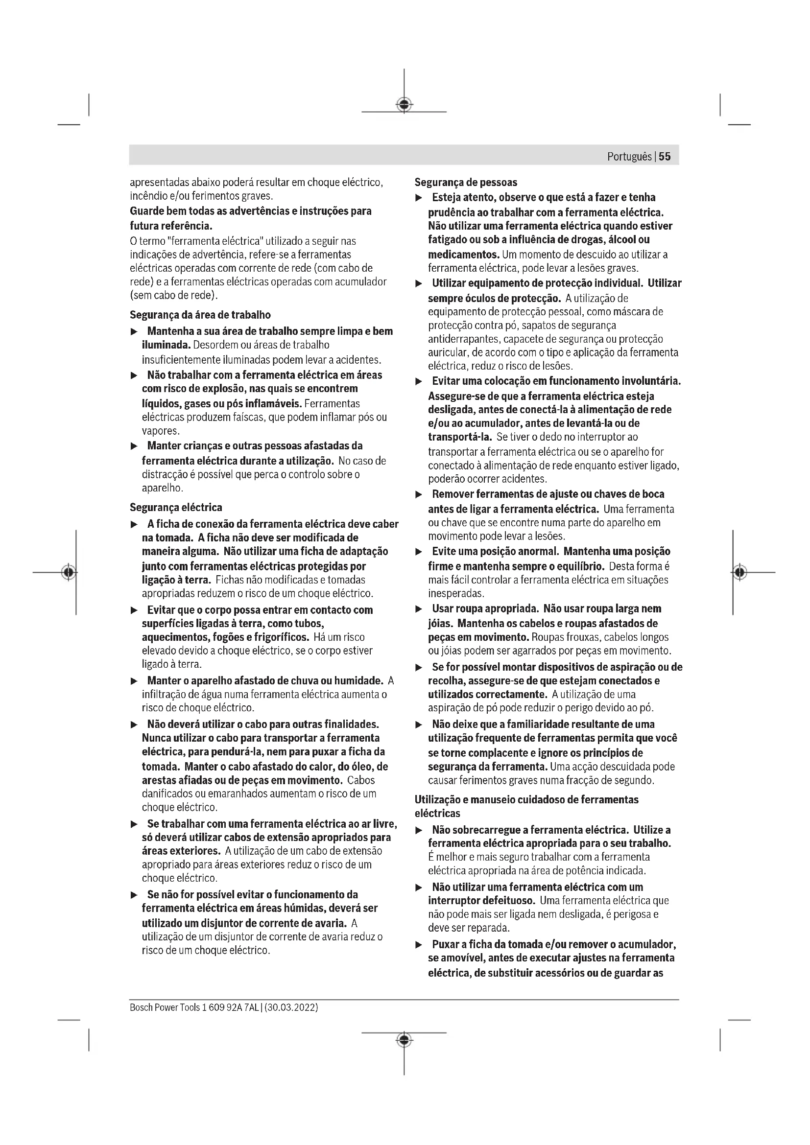 Os valores indicados dos níveis de rotação são valores de referência. Montagem Montar o dispositivo de proteção u Antes de todos trabalhos na ferramenta elétrica deverá puxar a ficha de rede da tomada. Nota: Se o disco abrasivo quebrar durante o funcionamento ou se os dispositivos de fixação na tampa de proteção/na ferramenta elétrica estiverem danificados, será necessário que a ferramenta elétrica seja enviada imediatamente ao serviço pós-venda, os endereços encontram-se na secção "Serviço pós-venda e aconselhamento". Bosch Power Tools 1 609 92A 7AL | (30.03.2022)62 | Português Tampa de proteção para lixar Coloque a tampa de proteção (8) no encaixe na ferramenta elétrica até as saliências de codificação da tampa de proteção coincidirem com o encaixe. Para tal, prima e segure a alavanca de destravamento (1). Pressione a tampa de proteção (8) na gola do veio até o colar da tampa de proteção assentar no flange da ferramenta elétrica e rode a tampa de proteção, até esta encaixar de forma audível. Ajuste a posição da tampa de proteção (8) de acordo com os requisitos da operação. Para tal, prima a alavanca de destravamento (1) para cima e rode a tampa de proteção (8) para a posição desejada. u Ajuste sempre a tampa de proteção (8) de forma a que os dois cames da alavanca de destravamento(1) encaixem nos respetivos entalhes da tampa de proteção(8). u Ajuste a tampa de proteção (8)de modo a evitar que voem faíscas na direção do operador. u A tampa de proteção (8) não pode rodar quando se aciona a alavanca de destravamento (1) ! Caso contrário, não deverá de modo algum continuar a utilizar a ferramenta elétrica, mas enviá-la ao serviço pós-venda. Nota: As saliências de codificação nas tampas de proteção (8)asseguram que só é montada a tampa de proteção adequada na ferramenta elétrica. Capa de aspiração para lixar Para lixar tintas, vernizes e plásticos com pouco pó em conjunto com mós tipo tacho de metal duro(11) pode utilizar a tampa de aspiração(7). A tampa de aspiração(7) não é indicada para trabalhar com metais. Na tampa de aspiração(7)pode ser conectado um aspirador de pó Bosch apropriado. Para isso, encaixe a mangueira de aspiração com o adaptador de aspiração nas peças de alojamento previstas da tampa de aspiração. Tampa de proteção para cortar u Para cortar utilize sempre a tampa de proteção para cortar(9) ou a tampa de proteção para lixar (8) juntamente com a cobertura para cortar(27). u Ao cortar em pedra assegure uma aspiração de pó suficiente. A tampa de proteção para cortar(9) é montada como a tampa de proteção para lixar(8). Cobertura para cortar em metal Monte a cobertura para cortar(27) em metal na tampa de proteção para lixar(8) (verfiguraA): oscile o arco de suporte para trás (➊). Encaixe a cobertura(27) na tampa de proteção para lixar(8) (➋). Pressione o arco de suporte na tampa de proteção(8) (➌). Para a desmontagem (verfiguraB) pressione o botão no arco de suporte (➊) e oscile-o para trás (➋). Retire a cobertura(27) da tampa de proteção(8) (➌). Cobertura para cortar em plástico Encaixe a cobertura para cortar(27) em plástico na tampa de proteção para lixar(8) (verfiguraC). A cobertura(27) engata de forma audível e visível na tampa de proteção(8). Para a desmontagem (verfiguraD) desbloqueie a cobertura(27) na tampa de proteção(8) (➊) esquerda ou direita e retire a cobertura (➋). Tampa de aspiração para cortar com patim de guia A tampa de aspiração para cortar com patim de guia(19) é montada como a tampa de proteção para lixar. Mediante a fixação do punho adicional(6)/(32) através do arco na tampa de aspiração na carcaça da engrenagem, a ferramenta elétrica é ligada de forma fixa com a tampa de aspiração. Na tampa de aspiração com patim de guia(19) pode ser conectado um aspirador de pó Bosch apropriado. Para isso, encaixe a mangueira de aspiração com o adaptador de aspiração nas peças de alojamento previstas da tampa de aspiração. Nota: O atrito formado através do pó na mangueira de aspiração e no acessório durante a aspiração, provoca uma carga eletrostática que pode percecionar o utilizador como descarga estática (dependendo dos fatores ambientais e do seu estado fisiológico). A Bosch recomenda de uma forma geral a utilização de uma mangueira de aspiração antiestática (acessório) para a aspiração de pó fino e materiais secos. Proteção das mãos u Para trabalhos com o prato de lixar em borracha(22) ou com a catrabucha tipo tacho/catrabucha em forma de cone/broca de coroa de diamante monte sempre a proteção das mãos (21). Fixe a proteção das mãos(21) com o punho adicional(6)/ (32). Punho adicional padrão/punho adicional antivibrações Dependendo do modo de operação, enrosque o punho adicional(6)/(32) à direita ou à esquerda na cabeça do mecanismo de acionamento. u Utilize a ferramenta elétrica apenas com o punho adicional(6)/(32). u Não continue a utilizar a ferramenta elétrica se o punho adicional(6)/(32) estiver danificado. Não efetue quaisquer alterações no punho adicional (6)/ (32). O punho adicional antivibrações(32) reduz as vibrações, proporcionando um trabalho agradável e seguro. 1 609 92A 7AL | (30.03.2022) Bosch Power ToolsPortuguês | 63 Montar as ferramentas de lixar u Antes de todos trabalhos na ferramenta elétrica deverá puxar a ficha de rede da tomada. u Não tocar nos discos abrasivos e de corte, antes que arrefeçam. Os discos tornam‑se extremamente quentes durante o trabalho. Limpe o veio de retificação (18) e todas as peças a serem montadas. Para fixar e soltar as ferramentas de lixar, pressione a tecla de bloqueio do veio (2), para bloquear o veio de retificação. u Só acione a tecla de bloqueio do veio com o veio de retificação parado. Caso contrário é possível que a ferramenta elétrica seja danificada. Disco abrasiv