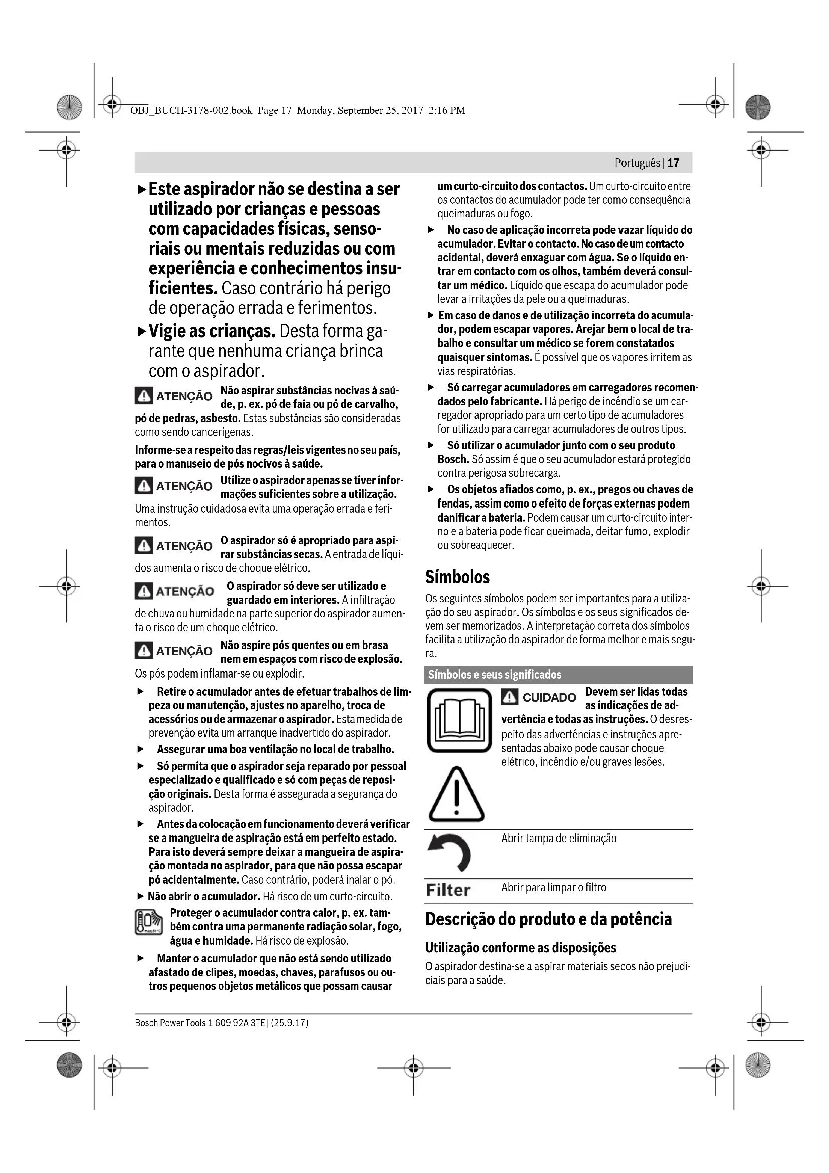 Tel. : +221 33 849 01 01 Fax : +221 33 823 34 20 Transport Les batteries Lithium-ion sont soumises aux règlements de transport des matières dangereuses. L’utilisateur peut trans- porter les batteries par voie routière sans mesures supplé- mentaires. Lors d’une expédition par tiers (par ex. : transport aérien ou entreprise de transport), les mesures à prendre spécifiques à l’emballage et au marquage doivent être observées. Dans un tel cas, lors de la préparation de l’envoi, il est impératif de faire appel à un expert en transport des matières dange- reuses. N’expédiez les accus que si le carter n’est pas endommagé. Recouvrez les contacts non protégés et emballez l’accu de manière à ce qu’il ne puisse pas se déplacer dans l’emballage. Veuillez également respecter les règlementations supplémen- taires éventuellement en vigueur. Élimination des déchets Prière de rapporter l’aspirateur, les accus et les em- ballages dans un Centre de recyclage respectueux de l’environnement. Ne jetez pas l’aspirateur ou les accus/piles avec les ordures ménagères ! Batteries/piles : Lithium ion : Respectez les indications données dans le chapitre « Transport », page 16. Sous réserve de modifications. Português Indicações de segurança Devem ser lidas todas as indicações de ad- vertência e todas as instruções. O desrespei- to das advertências e instruções apresentadas abaixo pode causar choque elétrico, incêndio e/ou graves lesões. Guarde bem estas instruções. OBJ_BUCH-3178-002.book Page 16 Monday, September 25, 2017 2:16 PMPortuguês | 17 Bosch Power Tools 1 609 92A 3TE | (25.9.17) Este aspirador não se destina a ser utilizado por crianças e pessoas com capacidades físicas, senso- riais ou mentais reduzidas ou com experiência e conhecimentos insu- ficientes. Caso contrário há perigo de operação errada e ferimentos. Vigie as crianças. Desta forma ga- rante que nenhuma criança brinca com o aspirador. Não aspirar substâncias nocivas à saú- de, p. ex. pó de faia ou pó de carvalho, pó de pedras, asbesto. Estas substâncias são consideradas como sendo cancerígenas. Informe-se a respeito das regras/leis vigentes no seu país, para o manuseio de pós nocivos à saúde. Utilize o aspirador apenas se tiver infor- mações suficientes sobre a utilização. Uma instrução cuidadosa evita uma operação errada e feri- mentos. O aspirador só é apropriado para aspi- rar substâncias secas. A entrada de líqui- dos aumenta o risco de choque elétrico. O aspirador só deve ser utilizado e guardado em interiores. A infiltração de chuva ou humidade na parte superior do aspirador aumen- ta o risco de um choque elétrico. Não aspire pós quentes ou em brasa nem em espaços com risco de explosão. Os pós podem inflamar-se ou explodir. Retire o acumulador antes de efetuar trabalhos de lim- peza ou manutenção, ajustes no aparelho, troca de acessórios ou de armazenar o aspirador. Esta medida de prevenção evita um arranque inadvertido do aspirador. Assegurar uma boa ventilação no local de trabalho. Só permita que o aspirador seja reparado por pessoal especializado e qualificado e só com peças de reposi- ção originais. Desta forma é assegurada a segurança do aspirador. Antes da colocação em funcionamento deverá verificar se a mangueira de aspiração está em perfeito estado. Para isto deverá sempre deixar a mangueira de aspira- ção montada no aspirador, para que não possa escapar pó acidentalmente. Caso contrário, poderá inalar o pó. Não abrir o acumulador. Há risco de um curto-circuito. Proteger o acumulador contra calor, p. ex. tam- bém contra uma permanente radiação solar, fogo, água e humidade. Há risco de explosão. Manter o acumulador que não está sendo utilizado afastado de clipes, moedas, chaves, parafusos ou ou- tros pequenos objetos metálicos que possam causar um curto-circuito dos contactos. Um curto-circuito entre os contactos do acumulador pode ter como consequência queimaduras ou fogo. No caso de aplicação incorreta pode vazar líquido do acumulador. Evitar o contacto. No caso de um contacto acidental, deverá enxaguar com água. Se o líquido en- trar em contacto com os olhos, também deverá consul- tar um médico. Líquido que escapa do acumulador pode levar a irritações da pele ou a queimaduras. Em caso de danos e de utilização incorreta do acumula- dor, podem escapar vapores. Arejar bem o local de tra- balho e consultar um médico se forem constatados quaisquer sintomas. É possível que os vapores irritem as vias respiratórias. Só carregar acumuladores em carregadores recomen- dados pelo fabricante. Há perigo de incêndio se um car- regador apropriado para um certo tipo de acumuladores for utilizado para carregar acumuladores de outros tipos. Só utilizar o acumulador junto com o seu produto Bosch. Só assim é que o seu acumulador estará protegido contra perigosa sobrecarga. Os objetos afiados como, p. ex., pregos ou chaves de fendas, assim como o efeito de forças externas podem danificar a bateria. Podem causar um curto-circuito inter- no e a bateria pode ficar queimada, deitar fumo, explodir ou sobreaquecer. Símbolos Os seguintes símbolos podem ser importantes para a utiliza- ção do seu aspirador. Os símbolos e os seus significados de- vem ser memorizados. A interpretação correta dos símbolos facilita a utilização do aspirador de forma melhor e mais segu- ra. Descrição do produto e da potência Utilização conforme as disposições O aspirador destina-se a aspirar materiais secos não prejudi- ciais para a saúde. ATENÇÃO ATENÇÃO ATENÇÃO ATENÇÃO Símbolos e seus significados Devem ser lidas todas as indicações de ad- vertência e todas as instruções. O desres- peito das advertências e instruções apre- sentadas abaixo pode causar choque elétrico, incêndio e/ou graves lesões. Abrir tampa de eliminação Abrir para limpar o filtro CUIDADO O