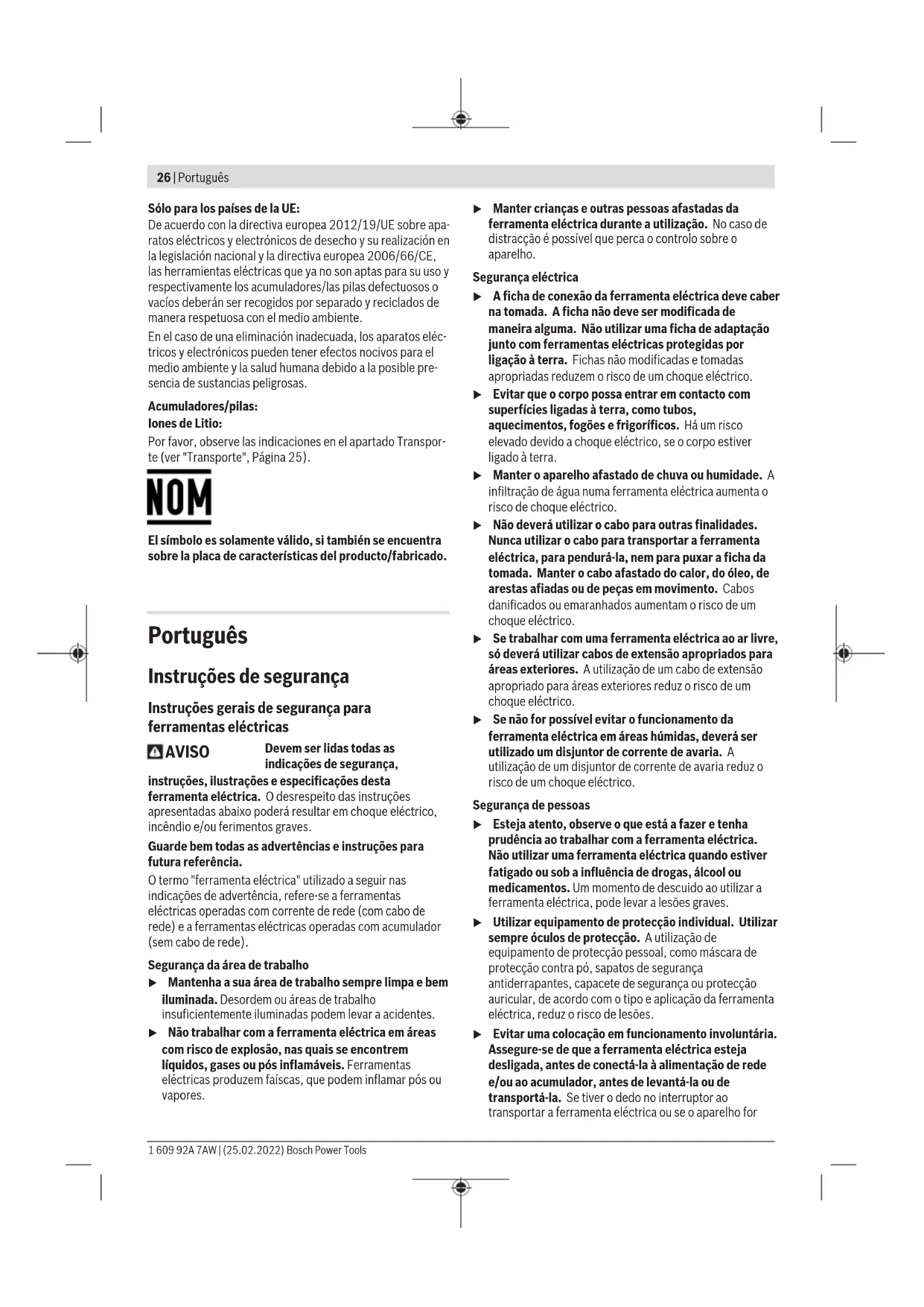 O nível de vibrações indicado nestas instruções e o valor de emissões sonoras foram medidos de acordo com um processo de medição normalizado e podem ser utilizados para a comparação de ferramentas elétricas. Também são adequados para uma avaliação provisória das emissões sonoras e de vibrações. 1 609 92A 7AW | (25.02.2022) Bosch Power ToolsPortuguês | 29 O nível de vibrações indicado e o valor de emissões sonoras representam as aplicações principais da ferramenta elétrica. Se a ferramenta elétrica for utilizada para outras aplicações, com outras ferramentas de trabalho ou com manutenção insuficiente, é possível que o nível de vibrações e de emissões sonoras seja diferente. Isto pode aumentar sensivelmente a emissão sonora e de vibrações para o período completo de trabalho. Para uma estimação exata da emissão sonora e de vibrações, também deveriam ser considerados os períodos nos quais o aparelho está desligado ou funciona, mas não está sendo utilizado. Isto pode reduzir a emissão sonora e de vibrações durante o completo período de trabalho. Além disso também deverão ser estipuladas medidas de segurança para proteger o operador contra o efeito de vibrações, como por exemplo: manutenção de ferramentas elétricas e acessórios, manter as mãos quentes e organização dos processos de trabalho. Bateria Bosch vende ferramentas elétricas sem fio também sem bateria. Pode consultar na embalagem se está incluída uma bateria no volume de fornecimento da sua ferramenta elétrica. Carregar a bateria u Utilize apenas os carregadores listados nos dados técnicos. Só estes carregadores são apropriados para os baterias de lítio utilizadas para a sua ferramenta elétrica. Nota: devido a normas de transporte internacionais, as baterias de lítio são fornecidas parcialmente carregadas. Para assegurar a completa potência da bateria, a bateria deverá ser carregada completamente antes da primeira utilização. Colocar a bateria Insira a bateria carregada no respetivo encaixe, até que esta esteja engatada. Retirar a bateria Para retirar a bateria, pressione a respetiva tecla de desbloqueio e puxe a bateria para fora. Não empregue força. A bateriapossui 2 níveis de travamento, que devem evitar, que a bateria caia, caso a tecla de desbloqueio da bateriaseja premida por acaso. Enquanto a bateria estiver dentro da ferramenta elétrica, ela é mantida em posição por uma mola. Indicador do nível de carga da bateria Os LEDs verdes do indicador do nível de carga da bateria indicam o nível de carga da bateria. Por motivos de segurança, a consulta do nível de carga só é possível com a ferramenta elétrica parada. Prima a tecla para o indicador do nível de carga da bateria ou para visualizar o nível de carga. Isto também é possível com a bateria removida. Se, depois de premir a tecla para o indicador do nível de carga da bateria, não se acender qualquer LED, a bateria tem defeito e tem de ser substituída. Tipo de bateria GBA 18V... LED Capacidade Luz permanente 3× verde 60–100% Luz permanente 2× verde 30–60% Luz permanente 1× verde 5–30% Luz intermitente 1× verde 0–5% Tipo de bateria ProCORE18V... LED Capacidade Luz permanente 5× verde 80–100% Luz permanente 4× verde 60–80% Luz permanente 3× verde 40–60% Luz permanente 2× verde 20–40% Luz permanente 1× verde 5–20% Luz intermitente 1× verde 0–5% Indicações sobre o manuseio ideal da bateria Proteger a bateria contra humidade e água. Armazene a bateria apenas na faixa de temperatura de −20°C a 50°C. Por exemplo, não deixe a bateria dentro do automóvel no verão. Limpar de vez em quando as aberturas de ventilação da bateria com um pincel macio, limpo e seco. Um tempo de funcionamento reduzido após o carregamento indica que a bateria está gasta e que deve ser substituída. Observe as indicações sobre a eliminação de forma ecológica. Funcionamento Colocação em funcionamento Ligar/desligar Para ligar a ferramenta elétrica, empurre o interruptor de ligar/desligar(3) para a frente, para que apareça no interruptor I. Para desligar a ferramenta elétrica, empurre o interruptor de ligar/desligar(3) para trás, para que apareça no interruptor 0. Bosch Power Tools 1 609 92A 7AW | (25.02.2022)30 | Português Proteção contra rearranque involuntário A proteção contra rearranque involuntário evita que a ferramenta elétrica possa arrancar descontroladamente após uma interrupção da alimentação de corrente elétrica. Para recolocar em funcionamento, deverá colocar o interruptor de ligar/desligar(3) na posição desligada e ligar novamente a ferramenta elétrica. Arranque suave O arranque suave eletrónico limita o binário ao ligar e aumenta a durabilidade do motor. Mudar o sentido de corte Para mudar o sentido de corte, pode rodar o porta- matriz(7) em três posições deslocadas em respetivamente 90°. Um sentido de corte para trás (no sentido da carcaça) não é possível. Para rodar o porta-matriz(7) solte o parafuso(4) até poder rodar o porta-matriz. Rode-o em 90° em relação ao eixo longitudinal da ferramenta elétrica para a direita ou para a esquerda. Certifique-se de que o parafuso(4) encaixa no furo no porta- matriz(7). Aperte o parafuso. Instruções de trabalho u A bateria deverá ser retirada antes de todos os trabalhos na ferramenta elétrica (p. ex. manutenção, troca de ferramenta etc.) e antes de transportar ou de armazenar a mesma. Há perigo de ferimentos se o interruptor de ligar/desligar for acionado involuntariamente. u A ferramenta elétrica não é adequada para o funcionamento estacionário. Não pode p. ex. ser presa num torno de bancada ou fixada a uma bancada de trabalho. u Use luvas de proteção durante o trabalho. Nas chapas cortadas formam-se rebarbas afiadas nas quais se pode magoar. u Cuidado ao manusear as aparas de corte. As aparas têm arestas afiadas que podem causar ferimentos. Só conduz