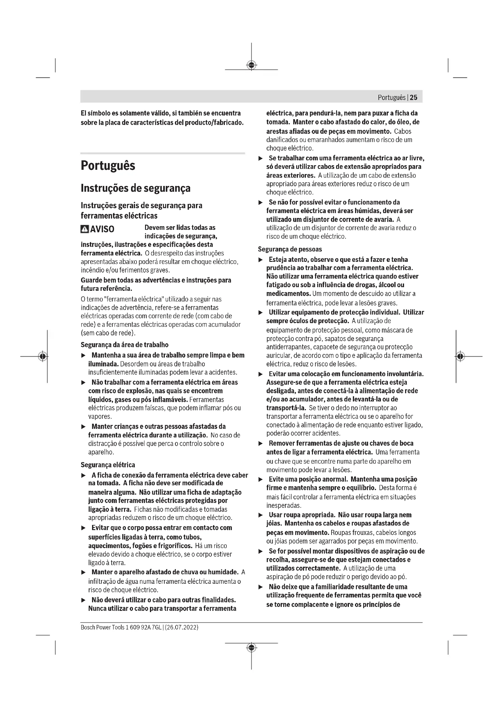 O nível de vibrações indicado nestas instruções e o valor de emissões sonoras foram medidos de acordo com um processo de medição normalizado e podem ser utilizados para a comparação de ferramentas elétricas. Também são adequados para uma avaliação provisória das emissões sonoras e de vibrações. O nível de vibrações indicado e o valor de emissões sonoras representam as aplicações principais da ferramenta elétrica. Se a ferramenta elétrica for utilizada para outras aplicações, com outras ferramentas de trabalho ou com manutenção insuficiente, é possível que o nível de vibrações e de emissões sonoras seja diferente. Isto pode aumentar sensivelmente a emissão sonora e de vibrações para o período completo de trabalho. Para uma estimação exata da emissão sonora e de vibrações, também deveriam ser considerados os períodos nos quais o aparelho está desligado ou funciona, mas não está sendo utilizado. Isto pode reduzir a emissão sonora e de vibrações durante o completo período de trabalho. Além disso também deverão ser estipuladas medidas de segurança para proteger o operador contra o efeito de vibrações, como por exemplo: manutenção de ferramentas elétricas e acessórios, manter as mãos quentes e organização dos processos de trabalho. Montagem u Antes de todos trabalhos na ferramenta elétrica deverá puxar a ficha de rede da tomada. Punho adicional (ver figura A) u Utilize a ferramenta elétrica apenas com o punho adicional (2). Aparafuse o punho adicional (2) na rosca (3) na carcaça do motor. Pega de transporte (verfiguraA) A pega de transporte(4) pode ser continuamente rodada em 360°. Troca de ferramenta u Use luvas de proteção ao trocar de ferramenta. A bucha pode aquecer muito durante trabalhos prolongados. Bosch Power Tools 1 609 92A 7GL | (26.07.2022)28 | Português Bucha de coroa dentada com travamento automático (ver figura B) Abra a bucha de coroa dentada (1) rodando até a ferramenta poder ser inserida. Introduzir a ferramenta. Insira a chave de buchas (9) nos respetivos orifícios da bucha de coroa dentada (1) e aperte a ferramenta uniformemente. Trocar a bucha (ver figura C) u Antes de todos trabalhos na ferramenta elétrica deverá puxar a ficha de rede da tomada. Remover o parafuso de segurança A bucha de aperto rápido (1) está protegida contra desaperto involuntário do veio da broca com um parafuso de segurança (10). Abra a bucha de aperto rápido (1) completamente e rode o parafuso de segurança (10) para a direita para o retirar. Tenha em atenção que o parafuso de segurança tem uma rosca para a esquerda. Se o parafuso de segurança (10) estiver bem apertado, coloque uma chave de parafusos na cabeça do parafuso e solte o parafuso de segurança através de um batimento no punho da chave de parafusos. Desmontar o mandril de brocas Para a desmontagem da bucha de coroa dentada (1) coloque uma chave de bocas (tamanho 17 mm) na porca do veio de acionamento. Segure a bucha de coroa dentada com uma mão e rode com a outra mão a chave de bocas para a esquerda, até que a bucha se solte do cone da bucha. Montar o mandril de brocas u Mantenha o cone do veio da broca e o furo da bucha livre de gordura e sujidade. Para a montagem da bucha de coroa dentada (1) rode a porca no veio de acionamento para a direita até ao batente. Insira a bucha de coroa dentada sem violência no veio de acionamento até que encaixe bem. Bata ligeiramente com um martelo de borracha no topo da bucha de coroa dentada (1), para garantir um assento seguro da bucha de coroa dentada. Certifique-se de que os mordentes da bucha de coroa dentada não estão salientes para não os danificar. Montar o parafuso de retenção Aperte o parafuso de retenção (10) rodando-o para a esquerda na bucha de coroa dentada aberta. Utilize respetivamente um parafuso de retenção novo em cuja rosca tenha sido aplicada uma massa adesiva, a qual vai deixando de fazer efeito com as utilizações. Aspiração de pó/de aparas Pós de materiais como por exemplo, tintas que contém chumbo, alguns tipos de madeira, minerais e metais, podem ser nocivos à saúde. O contacto ou a inalação dos pós pode provocar reações alérgicas e/ou doenças nas vias respiratórias do utilizador ou das pessoas que se encontrem por perto. Certos pós, como por exemplo pó de carvalho e faia são considerados como sendo cancerígenos, especialmente quando juntos com substâncias para o tratamento de madeiras (cromato, preservadores de madeira). Material que contém asbesto só deve ser processado por pessoal especializado. – Assegurar uma boa ventilação do local de trabalho. – É recomendável usar uma máscara de proteção respiratória com filtro da classe P2. Observe as diretivas para os materiais a serem processados, vigentes no seu país. u Evite a acumulação de pó no local de trabalho. Pós podem entrar levemente em ignição. Funcionamento Colocação em funcionamento u Observar a tensão de rede! A tensão da fonte de corrente elétrica deve coincidir com os dados que constam na placa de características da ferramenta elétrica. Ferramentas elétricas marcadas para 230V também podem ser operadas com 220V. Ajustar o sentido de rotação (ver imagem D) Com o comutador de sentido de rotação (7) é possível alterar o sentido de rotação da ferramenta elétrica. Com o interruptor de ligar/desligar pressionado (6) isto no entanto não é possível. Rotação à direita: para perfurar ou misturar, pressione o comutador do sentido de rotação (7) para a esquerda até ao batente. Rotação à esquerda: para desapertar ou misturar, pressione o comutador do sentido de rotação (7) para a direita até ao batente. Ligar/desligar Para a colocação em funcionamento da ferramenta elétrica deverá pressionar o interruptor de ligar/desligar (6) e mantenha-o pressionado. Para fixar o interruptor de ligar/desligar (6) pressionado, prima o botão de fixação (5). Para de