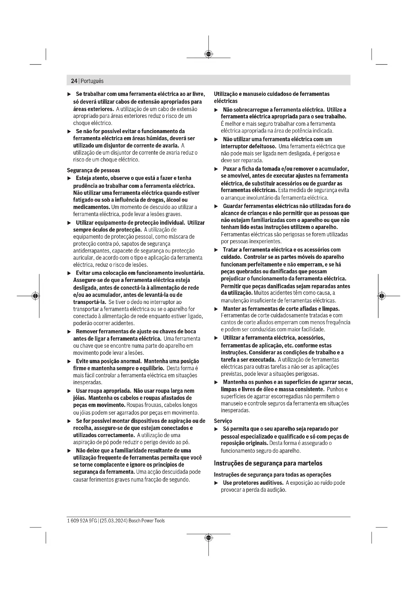kg 5,8 Classe de proteção /II A) Peso sem cabo de ligação à rede e sem ficha de rede Os dados aplicam-se a uma tensão nominal [U] de 230 V. Com tensões divergentes e em versões específicas do país, estes dados podem variar. Os valores podem variar em função do produto e estar sujeitos a condições de aplicação e do meio ambiente. Para mais informações consulte www.bosch-professional.com/wac. Informação sobre ruídos/vibrações Os valores de emissão de ruído foram determinados de acordo com ENIEC62841-2-6. O nível sonoro avaliado como A da ferramenta elétrica é normalmente de: nível de pressão sonora 92dB(A); nível de potência sonora 100dB(A). Incerteza K=3dB. Utilizar proteção auditiva! Valores totais de vibração a