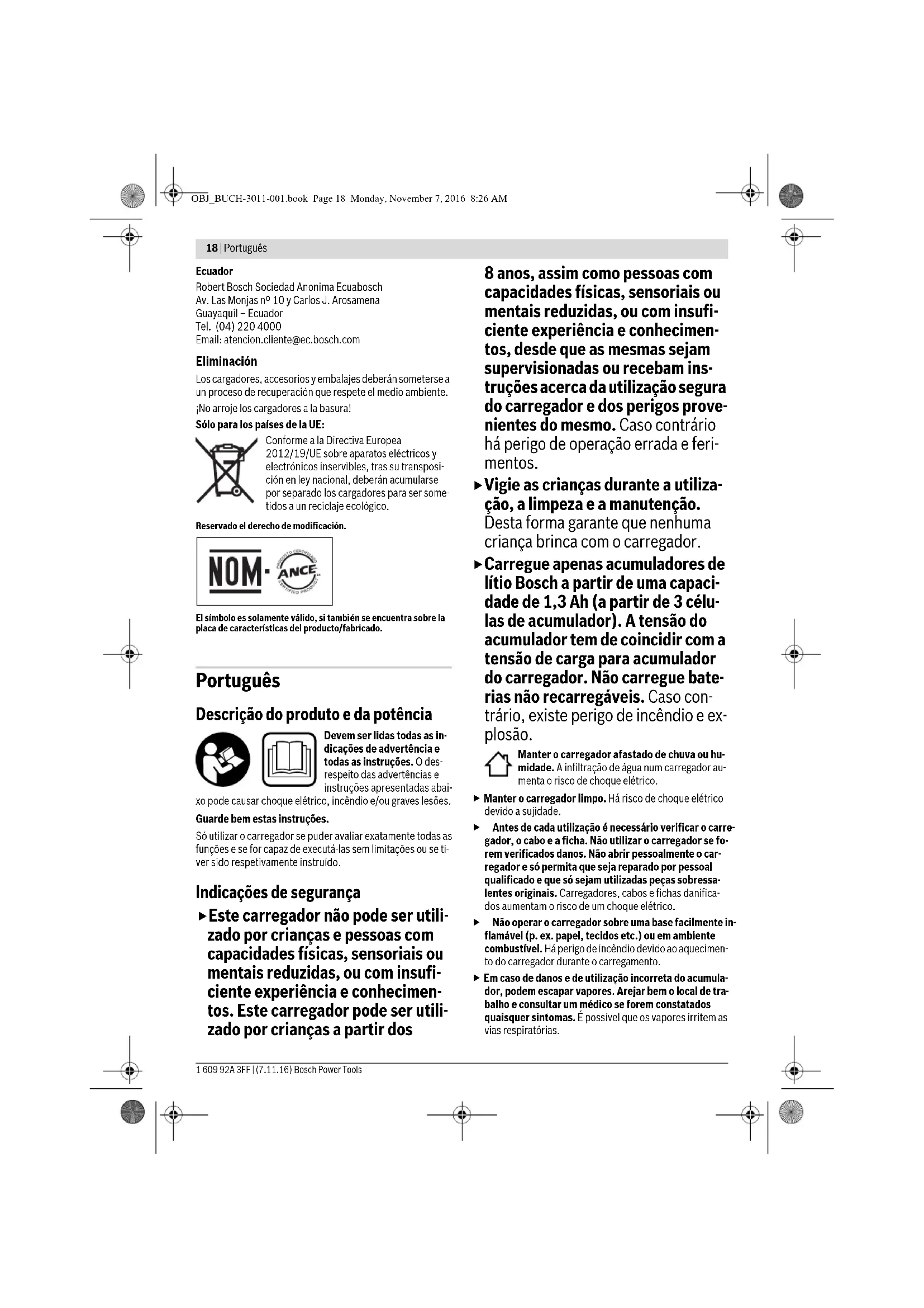 - Algunos dispositivos USB externos no se dejan cargar con este carga- dor, a pesar de la concordancia de los datos técnicos. Causa Solución OBJ_BUCH-3011-001.book Page 17 Monday, November 7, 2016 8:26 AM18 | Português 1 609 92A 3FF | (7.11.16) Bosch Power Tools Ecuador Robert Bosch Sociedad Anonima Ecuabosch Av. Las Monjas nº 10 y Carlos J. Arosamena Guayaquil – Ecuador Tel. (04) 220 4000 Email: atencion.cliente@ec.bosch.com Eliminación Los cargadores, accesorios y embalajes deberán someterse a un proceso de recuperación que respete el medio ambiente. ¡No arroje los cargadores a la basura! Sólo para los países de la UE: Conforme a la Directiva Europea 2012/19/UE sobre aparatos eléctricos y electrónicos inservibles, tras su transposi- ción en ley nacional, deberán acumularse por separado los cargadores para ser some- tidos a un reciclaje ecológico. Reservado el derecho de modificación. El símbolo es solamente válido, si también se encuentra sobre la placa de características del producto/fabricado. Português Descrição do produto e da potência Devem ser lidas todas as in- dicações de advertência e todas as instruções. O des- respeito das advertências e instruções apresentadas abai- xo pode causar choque elétrico, incêndio e/ou graves lesões. Guarde bem estas instruções. Só utilizar o carregador se puder avaliar exatamente todas as funções e se for capaz de executá-las sem limitações ou se ti- ver sido respetivamente instruído. Indicações de segurança Este carregador não pode ser utili- zado por crianças e pessoas com capacidades físicas, sensoriais ou mentais reduzidas, ou com insufi- ciente experiência e conhecimen- tos. Este carregador pode ser utili- zado por crianças a partir dos 8 anos, assim como pessoas com capacidades físicas, sensoriais ou mentais reduzidas, ou com insufi- ciente experiência e conhecimen- tos, desde que as mesmas sejam supervisionadas ou recebam ins- truções acerca da utilização segura do carregador e dos perigos prove- nientes do mesmo. Caso contrário há perigo de operação errada e feri- mentos. Vigie as crianças durante a utiliza- ção, a limpeza e a manutenção. Desta forma garante que nenhuma criança brinca com o carregador. Carregue apenas acumuladores de lítio Bosch a partir de uma capaci- dade de 1,3 Ah (a partir de 3 célu- las de acumulador). A tensão do acumulador tem de coincidir com a tensão de carga para acumulador do carregador. Não carregue bate- rias não recarregáveis. Caso con- trário, existe perigo de incêndio e ex- plosão. Manter o carregador afastado de chuva ou hu- midade. A infiltração de água num carregador au- menta o risco de choque elétrico. Manter o carregador limpo. Há risco de choque elétrico devido a sujidade. Antes de cada utilização é necessário verificar o carre- gador, o cabo e a ficha. Não utilizar o carregador se fo- rem verificados danos. Não abrir pessoalmente o car- regador e só permita que seja reparado por pessoal qualificado e que só sejam utilizadas peças sobressa- lentes originais. Carregadores, cabos e fichas danifica- dos aumentam o risco de um choque elétrico. Não operar o carregador sobre uma base facilmente in- flamável (p. ex. papel, tecidos etc.) ou em ambiente combustível. Há perigo de incêndio devido ao aquecimen- to do carregador durante o carregamento. Em caso de danos e de utilização incorreta do acumula- dor, podem escapar vapores. Arejar bem o local de tra- balho e consultar um médico se forem constatados quaisquer sintomas. É possível que os vapores irritem as vias respiratórias. OBJ_BUCH-3011-001.book Page 18 Monday, November 7, 2016 8:26 AMPortuguês | 19 Bosch Power Tools 1 609 92A 3FF | (7.11.16) Não cubra as ranhuras de ventilação do carregador. Ca- so contrário, o carregador pode sobreaquecer e deixar de funcionar corretamente. Componentes ilustrados A numeração dos componentes ilustrados refere-se à apre- sentação do carregador na página de esquemas. 1 Acumulador* 2 Compartimento de carregamento para baterias de 14,4 V/18V 3 Compartimento de carregamento para baterias de 10,8 V/12V 4 Indicador de carregamento da bateria verde para baterias de 14,4 V/18 V 5 Indicador de carregamento da bateria vermelho para baterias de 14,4 V/18 V 6 Tomada USB 7 Indicador de carregamento da bateria verde para baterias de 10,8 V/12 V 8 Indicador de carregamento da bateria vermelho para baterias de 10,8 V/12 V 9 Suporte de parede* *Acessórios apresentados ou descritos não pertencem ao volume de fornecimento padrão. Todos os acessórios encontram-se no nosso programa de acessórios. Dados técnicos Funcionamento Colocação em funcionamento Observar a tensão de rede! A tensão da fonte de corrente deve coincidir com a chapa de identificação do carrega- dor. Carregadores marcados para 230 V também podem ser operados com 220 V. Processo de carga O processo de carga começa assim que inserir a ficha de rede do carregador na tomada e a bateria 1 for inserida no compar- timento de carregamento 2/3 ou/e o cabo de carregamento for inserido na tomada USB 6. Carregador GAX 18V-30 GAX 18V-30 N.° do produto