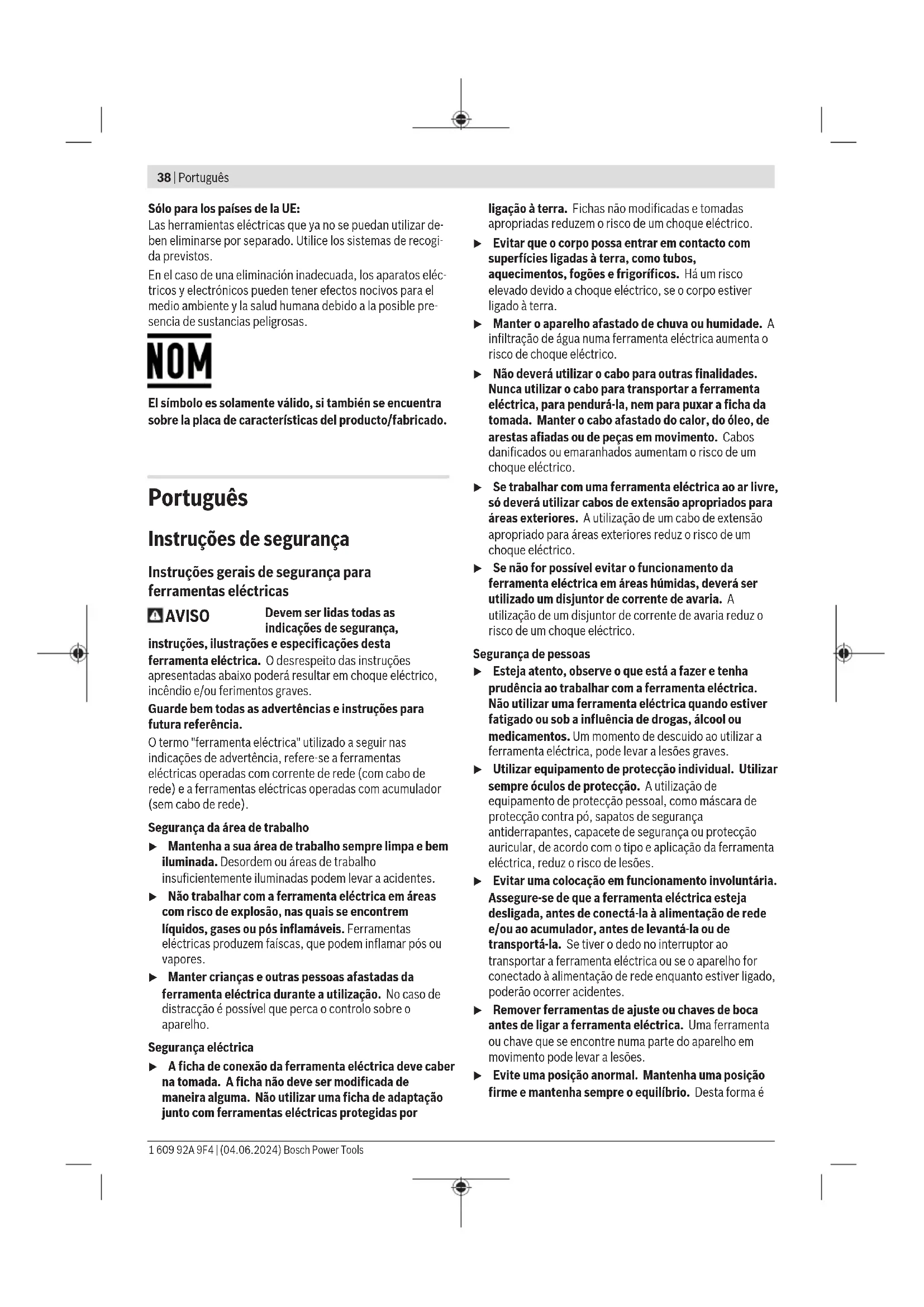 1,5 1,5 1,5 O nível de vibrações indicado nestas instruções e o valor de emissões sonoras foram medidos de acordo com um processo de medição normalizado e podem ser utilizados para a comparação de ferramentas elétricas. Também são adequados para uma avaliação provisória das emissões sonoras e de vibrações. O nível de vibrações indicado e o valor de emissões sonoras representam as aplicações principais da ferramenta elétrica. Se a ferramenta elétrica for utilizada para outras aplicações, com outras ferramentas de trabalho ou com manutenção insuficiente, é possível que o nível de vibrações e de emissões sonoras seja diferente. Isto pode aumentar sensivelmente a emissão sonora e de vibrações para o período completo de trabalho. Para uma estimação exata da emissão sonora e de vibrações, também deveriam ser considerados os períodos nos quais o aparelho está desligado ou funciona, mas não está sendo utilizado. Isto pode reduzir a emissão sonora e de vibrações durante o completo período de trabalho. Além disso também deverão ser estipuladas medidas de segurança para proteger o operador contra o efeito de vibrações, como por exemplo: manutenção de ferramentas elétricas e acessórios, manter as mãos quentes e organização dos processos de trabalho. Montagem u Só utilizar discos de serra com uma máxima velocidade admissível superior à velocidade da marcha em vazio da ferramenta elétrica. Introduzir/substituir o disco da serra circular u Antes de todos trabalhos na ferramenta elétrica deverá puxar a ficha de rede da tomada. u Para a montagem do disco de serra é necessário usar luvas de proteção. Há perigo de lesões no caso de um contacto com o disco de serra. u Nunca utilizar discos abrasivos como ferramentas de trabalho. u Só utilizar discos de serra que correspondam aos dados caraterísticos indicados nesta instrução de serviço e na ferramenta elétrica e que sejam controlados conforme EN847‑1 e respetivamente marcados. Selecionar disco de serra Encontra um resumo dois discos de serra recomendados no final destas instruções. Desmontar disco de serra (ver figura A) Coloque a ferramenta elétrica para a troca de ferramenta sobre o topo da carcaça do motor. 1 609 92A 9F4 | (04.06.2024) Bosch Power ToolsPortuguês | 43 – Prima e mantenha premida a tecla de bloqueio do veio (5). u Só acione a tecla de bloqueio do veio (5) com o veio de retificação parado. Caso contrário é possível que a ferramenta elétrica seja danificada. – Desaperte com a chave sextavada interior (4) o parafusos tensor (20) no sentido de rotação ➊. – Vire a tampa de proteção pendular (12) para trás e segure a mesma. – Retire o flange de admissão (21) e o disco de serra (22) do veio da serra (24). Montar o disco de serra (ver figura A) Coloque a ferramenta elétrica para a troca de ferramenta sobre o topo da carcaça do motor. – Limpe o disco de serra (22) e todos os meus elementos de aperto a montar. – Vire a cobertura de proteção pendular (12) para trás e segure a mesma. – Coloque o disco de serra (22) no flange de admissão (23). O sentido de corte dos dentes (sentido das setas no disco de serra) e a seta do sentido de rotação na tampa de proteção (12) têm de coincidir. – Coloque o flange de aperto (21) e aperte o parafuso tensor (20) no sentido de rotação ➋. Certifique-se da posição de montagem correta do flange de admissão (23) e do flange de aperto (21). – Prima e mantenha premida a tecla de bloqueio do veio (5). – Com uma chave sextavada interior (4), aperte o parafuso de aperto (20) no sentido de rotação ➋. O binário de aperto deve ser de 6–9Nm, o que corresponde ao aperto manual mais ¼ de volta. Aspiração de pó/de aparas Pós de materiais como por exemplo, tintas que contém chumbo, alguns tipos de madeira, minerais e metais, podem ser nocivos à saúde. O contacto ou a inalação dos pós pode provocar reações alérgicas e/ou doenças nas vias respiratórias do utilizador ou das pessoas que se encontrem por perto. Certos pós, como por exemplo pó de carvalho e faia são considerados como sendo cancerígenos, especialmente quando juntos com substâncias para o tratamento de madeiras (cromato, produtos de proteção da madeira). Material que contém asbesto só deve ser processado por pessoal especializado. – Se possível deverá usar um dispositivo de aspiração de pó apropriado para o material. – Assegurar uma boa ventilação do local de trabalho. – É recomendável usar uma máscara de proteção respiratória com filtro da classe P2. Observe as diretivas para os materiais a serem processados, vigentes no seu país. u Evite a acumulação de pó no local de trabalho. Pós podem entrar levemente em ignição. Montar adaptador de aspiração (ver figura B) Insira o adaptador de aspiração (26) na expulsão de aparas (16) até engatar. Fixe o adaptador de aspiração (26) adicionalmente com o parafuso (25). Ao adaptador de aspiração (26) é possível ligar uma mangueira de aspiração com um diâmetro de 35 mm. u O adaptador de aspiração não pode estar montado sem aspiração externa ligada. Caso contrário o canal de aspiração pode ser obstruído. u No adaptador de aspiração não pode ser ligado um saco coletor do pó. Caso contrário o sistema de aspiração pode entupir. Para assegurar uma aspiração otimizada, é necessário que o adaptador de aspiração (26) seja limpo em intervalos regulares. Aspiração externa Ligue a mangueira de aspiração a um aspirador (acessório). Encontra um resumo da ligação aos diferentes aspiradores no final deste manual. A ferramenta elétrica pode ser ligada diretamente a uma tomada de um aspirador universal Bosch com dispositivo de arranque remoto. Este é iniciado automaticamente quando se liga a ferramenta elétrica. O aspirador de pó deve ser apropriado para o material a ser trabalhado. Utilize um aspirador espe