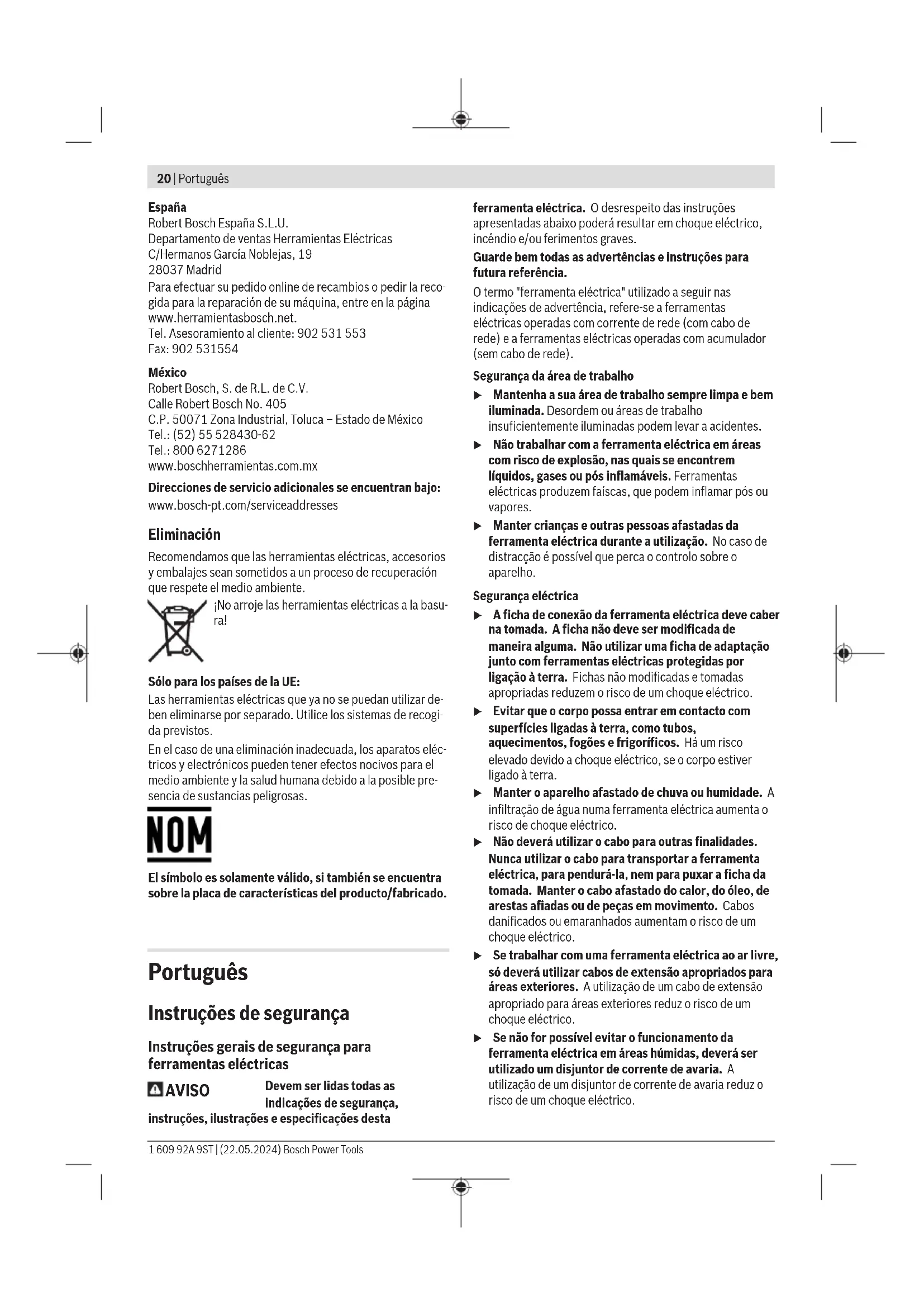 0,7 Aluminio 200 2,0 Lubricación/refrigeración del punzón Para prolongar la vida útil del punzón(6), utilice un lubrican- te con una buena función de refrigeración (p. ej., aceite de corte). Aplique una pista central de lubricación en la parte superior de la chapa a lo largo de la línea de corte prevista. Corte según trazo o con plantilla Los cortes rectos se realizan más fácilmente guiando la he- rramienta eléctrica a lo largo de una regla. Es posible cortar contornos guiando la herramienta eléctrica a lo largo de una plantilla. Para los recortes internos, se requiere un orificio pretaladra- do de 21mm de diámetro. Mantenimiento y servicio Mantenimiento y limpieza u Antes de cualquier manipulación en la herramienta eléctrica, sacar el enchufe de red de la toma de co- rriente. u Mantenga limpia la herramienta eléctrica y las rejillas de refrigeración para trabajar con eficacia y seguri- dad. Si es necesario reemplazar el cable de conexión, entonces esto debe ser realizado por Bosch o por un servicio técnico autorizado para herramientas eléctricas Bosch, para evitar riesgos de seguridad. Limpie y aceite cada 3 horas de servicio el punzón(6) y la matriz(7). Sustituya con suficiente antelación un punzón y matriz des- gastados para mantener un buen rendimiento de corte y cui- dar la herramienta eléctrica. El punzón(6) y la matriz(7) no se deben reafilar. Cambio de la matriz Desenrosque el tornillo moleteado(9) del portamatriz(5). Retire la matriz(7). Si es necesario, limpie el portamatriz(5). Coloque una nue- va matriz(7) bien lubricada en el portamatriz. Al realizar es- to observe que quede correctamente orientado el lado con el fresado plano. Atornille de nuevo el tornillo moleteado(9) con el anillo de goma(8) colocado. Con la ayuda de una llave macho hexa- gonal, apriete firmemente el tornillo contra la resistencia del anillo de goma (3−4Nm). Cambio del punzón Suelte el tornillo(2) del portamatriz y saque el portamatriz(5) por completo de la carcasa. Desplace el punzón(6) lateralmente hacia afuera del aloja- miento y extráigalo hacia abajo. Coloque un nuevo punzón(6) bien lubricado en la ranura del alojamiento y ajústelo de modo que quede centrado. Desplace cuidadosamente el portamatriz(5) sobre el pun- zón de vuelta a la carcasa. Dependiente de la dirección de corte deseada, gire el portamatriz a una de las tres posicio- nes posibles. Apriete firmemente el tornillo(2) del portama- triz. Servicio técnico y atención al cliente El servicio técnico le asesorará en las consultas que pueda Ud. tener sobre la reparación y mantenimiento de su produc- to, así como sobre piezas de recambio. Las representacio- nes gráficas tridimensionales e informaciones de repuestos se encuentran también bajo: www.bosch-pt.com El equipo asesor de aplicaciones de Bosch le ayuda gustosa- mente en caso de preguntas sobre nuestros productos y sus accesorios. Para cualquier consulta o pedido de piezas de repuesto es imprescindible indicar el nº de artículo de 10dígitos que fi- gura en la placa de características del producto. Bosch Power Tools 1 609 92A 9ST | (22.05.2024)20 | Português España Robert Bosch España S.L.U. Departamento de ventas Herramientas Eléctricas C/Hermanos García Noblejas, 19 28037 Madrid Para efectuar su pedido online de recambios o pedir la reco- gida para la reparación de su máquina, entre en la página www.herramientasbosch.net. Tel. Asesoramiento al cliente: 902 531 553 Fax: 902 531554 México Robert Bosch, S. de R.L. de C.V. Calle Robert Bosch No.405 C.P. 50071 Zona Industrial, Toluca– Estado de México Tel.: (52) 55 528430-62 Tel.: 800 6271286 www.boschherramientas.com.mx Direcciones de servicio adicionales se encuentran bajo: www.bosch-pt.com/serviceaddresses Eliminación Recomendamos que las herramientas eléctricas, accesorios y embalajes sean sometidos a un proceso de recuperación que respete el medio ambiente. ¡No arroje las herramientas eléctricas a la basu- ra! Sólo para los países de laUE: Las herramientas eléctricas que ya no se puedan utilizar de- ben eliminarse por separado. Utilice los sistemas de recogi- da previstos. En el caso de una eliminación inadecuada, los aparatos eléc- tricos y electrónicos pueden tener efectos nocivos para el medio ambiente y la salud humana debido a la posible pre- sencia de sustancias peligrosas. El símbolo es solamente válido, si también se encuentra sobre la placa de características del producto/fabricado. Português Instruções de segurança Instruções gerais de segurança para ferramentas eléctricas AVISO Devem ser lidas todas as indicações de segurança, instruções, ilustrações e especificações desta ferramenta eléctrica. O desrespeito das instruções apresentadas abaixo poderá resultar em choque eléctrico, incêndio e/ou ferimentos graves. Guarde bem todas as advertências e instruções para futura referência. O termo "ferramenta eléctrica" utilizado a seguir nas indicações de advertência, refere‑se a ferramentas eléctricas operadas com corrente de rede (com cabo de rede) e a ferramentas eléctricas operadas com acumulador (sem cabo de rede). Segurança da área de trabalho u Mantenha a sua área de trabalho sempre limpa e bem iluminada. Desordem ou áreas de trabalho insuficientemente iluminadas podem levar a acidentes. u Não trabalhar com a ferramenta eléctrica em áreas com risco de explosão, nas quais se encontrem líquidos, gases ou pós inflamáveis. Ferramentas eléctricas produzem faíscas, que podem inflamar pós ou vapores. u Manter crianças e outras pessoas afastadas da ferramenta eléctrica durante a utilização. No caso de distracção é possível que perca o controlo sobre o aparelho. Segurança eléctrica u A ficha de conexão da ferramenta eléctrica deve caber na tomada. A ficha não deve ser modificada de maneira alguma. Não utilizar uma ficha de adaptação junto com ferramentas eléctricas protegidas por ligação à terra. 
