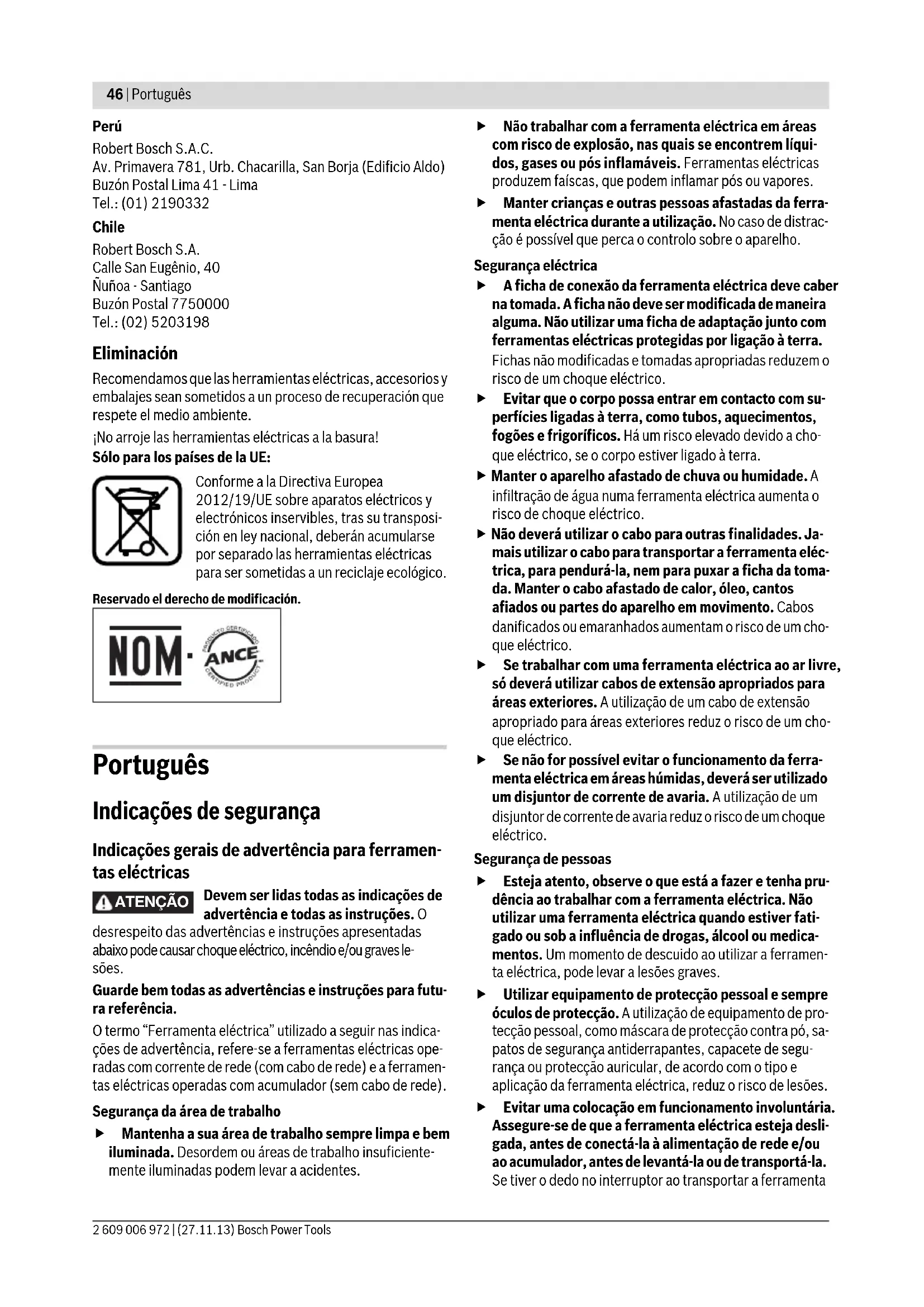 OBJ_BUCH-1961-003.book Page 44 Wednesday, November 27, 2013 3:12 PMEspañol | 45 Bosch Power Tools 2 609 006 972 | (27.11.13) Tronzado de piedra Al tronzar piedra procure una buena aspiración de pol- vo. Colóquese una mascarilla antipolvo. La herramienta eléctrica solamente deberá utilizarse para amolar o tronzar sin la aportación de agua. Para tronzar piedra se recomienda emplear un disco tronza- dor diamantado. Si usa la caperuza de aspiración para tronzar con soporte guía 19 el aspirador empleado deberá estar homologado para as- pirar polvo de piedra. Bosch le ofrece unos aspiradores ade- cuados. Conecte la herramienta eléctrica y asiente la par- te anterior del soporte guía sobre la pieza. Des- place la herramienta eléctrica con un avance moderado adecuado al tipo de material a traba- jar. Al tronzar materiales especialmente duros como, p. ej. hormi- gón con un alto contenido de áridos, es posible que se dañe el disco tronzador diamantado debido a un sobrecalentamien- to. Señal clara de ello es la formación de una corona de chis- pas en la periferia del disco. En este caso, interrumpa el proceso de tronzado y deje fun- cionar brevemente el disco en vacío, a revoluciones máximas, para permitir que se enfríe. La reducción notable del rendimiento de trabajo y la forma- ción de una corona de chispas, son indicios claros de que se ha reducido el filo del disco tronzador diamantado. Éste pue- de reafilarse realizando unos breves cortes en un material abrasivo, p. ej., en arenisca calcárea. Indicaciones referentes a la estática Al practicar ranuras en muros de carga, deberán tenerse en cuenta la norma DIN 1053 parte 1 y la normativa que pudiera existir al respecto en el respectivo país. Es imprescindible atenerse a estas prescripciones. Por ello, antes de realizar los trabajos consulte a un aparejador, arqui- tecto o al responsable de la obra. Mantenimiento y servicio Mantenimiento y limpieza Antes de cualquier manipulación en la herramienta eléctrica, sacar el enchufe de red de la toma de corrien- te. Mantenga limpia la herramienta eléctrica y las rejillas de refrigeración para trabajar con eficacia y seguridad. En el caso de aplicaciones extremas, siempre que sea posible, utilice un equipo de aspiración. Sople con fre- cuencia las rejillas de refrigeración y conecte el apara- to a través de un fusible diferencial (FI). Al trabajar me- tales puede llegar a acumularse en el interior de la herramienta eléctrica polvo susceptible de conducir co- rriente. Ello puede mermar la eficacia del aislamiento de la herramienta eléctrica. Almacene y trate cuidadosamente los accesorios. La sustitución de un cable de conexión deteriorado deberá ser realizada por Bosch o por un servicio técnico autorizado para herramientas eléctricas Bosch con el fin de garantizar la seguridad del aparato. Servicio técnico y atención al cliente El servicio técnico le asesorará en las consultas que pueda Ud. tener sobre la reparación y mantenimiento de su produc- to, así como sobre piezas de recambio. Los dibujos de despie- ce e informaciones sobre las piezas de recambio los podrá ob- tener también en internet bajo: www.bosch-pt.com Nuestro equipo de asesores técnicos le orientará gustosa- mente en cuanto a la adquisición, aplicación y ajuste de los productos y accesorios. Para cualquier consulta o pedido de piezas de repuesto es im- prescindible indicar el nº de artículo de 10 dígitos que figura en la placa de características de la herramienta eléctrica. España Robert Bosch Espana S.L.U. Departamento de ventas Herramientas Eléctricas C/Hermanos García Noblejas, 19 28037 Madrid Tel. Asesoramiento al cliente: 902 531 53 Fax: 902 531554 Venezuela Robert Bosch S.A. Final Calle Vargas. Edf. Centro Berimer P.B. Boleita Norte Caracas 107 Tel.: (0212) 2074511 México Robert Bosch S. de R.L. de C.V. Circuito G. Gonzáles Camarena 333 Centro de Ciudad Santa Fe - 01210 - Mexico DF Tel. Interior: (01) 800 6271286 Tel. D.F.: 52843062 E-Mail: arturo.fernandez@mx.bosch.com Argentina Robert Bosch Argentina S.A. Av. Córdoba 5160 C1414BAW Ciudad Autónoma de Buenos Aires Atención al Cliente Tel.: (0810) 5552020 E-Mail: herramientas.bosch@ar.bosch.com OBJ_BUCH-1961-003.book Page 45 Wednesday, November 27, 2013 3:12 PM46 | Português 2 609 006 972 | (27.11.13) Bosch Power Tools Perú Robert Bosch S.A.C. Av. Primavera 781, Urb. Chacarilla, San Borja (Edificio Aldo) Buzón Postal Lima 41 - Lima Tel.: (01) 2190332 Chile Robert Bosch S.A. Calle San Eugênio, 40 Ñuñoa - Santiago Buzón Postal 7750000 Tel.: (02) 5203198 Eliminación Recomendamos que las herramientas eléctricas, accesorios y embalajes sean sometidos a un proceso de recuperación que respete el medio ambiente. ¡No arroje las herramientas eléctricas a la basura! Sólo para los países de la UE: Conforme a la Directiva Europea 2012/19/UE sobre aparatos eléctricos y electrónicos inservibles, tras su transposi- ción en ley nacional, deberán acumularse por separado las herramientas eléctricas para ser sometidas a un reciclaje ecológico. Reservado el derecho de modificación. Português Indicações de segurança Indicações gerais de advertência para ferramen- tas eléctricas Devem ser lidas todas as indicações de advertência e todas as instruções. O desrespeito das advertências e instruções apresentadas abaixo pode causar choque eléctrico, incêndio e/ou graves le- sões. Guarde bem todas as advertências e instruções para futu- ra referência. O termo “Ferramenta eléctrica” utilizado a seguir nas indica- ções de advertência, refere-se a ferramentas eléctricas ope- radas com corrente de rede (com cabo de rede) e a ferramen- tas eléctricas operadas com acumulador (sem cabo de rede). Segurança da área de trabalho Mantenha a sua área de trabalho sempre limpa e bem iluminada. Desordem ou áreas de trabalho insuficiente- mente iluminadas podem levar a acidentes. Não trabalhar com a ferramenta e