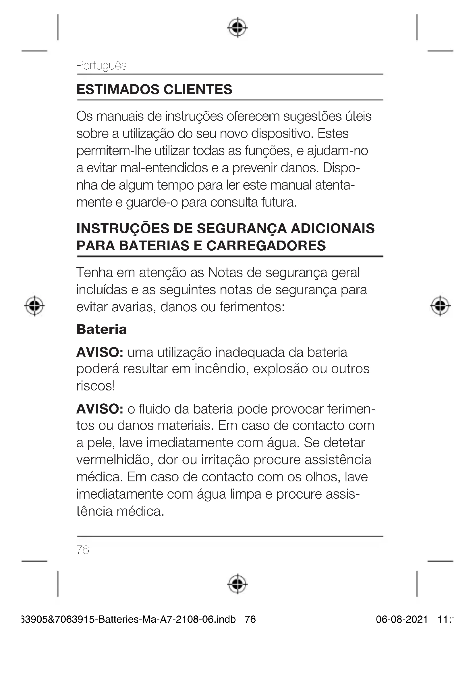 Tenha em atenção as Notas de segurança geral incluídas e as seguintes notas de segurança para evitar avarias, danos ou ferimentos: Bateria AVISO: uma utilização inadequada da bateria poderá resultar em incêndio, explosão ou outros riscos! AVISO: o uido da bateria pode provocar ferimen- tos ou danos materiais. Em caso de contacto com a pele, lave imediatamente com água. Se detetar vermelhidão, dor ou irritação procure assistência médica. Em caso de contacto com os olhos, lave imediatamente com água limpa e procure assis- tência médica. 7063905&7063915-Batteries-Ma-A7-2108-06.indb 767063905&7063915-Batteries-Ma-A7-2108-06.indb 76 06-08-2021 11:1806-08-2021 11:1877 Português