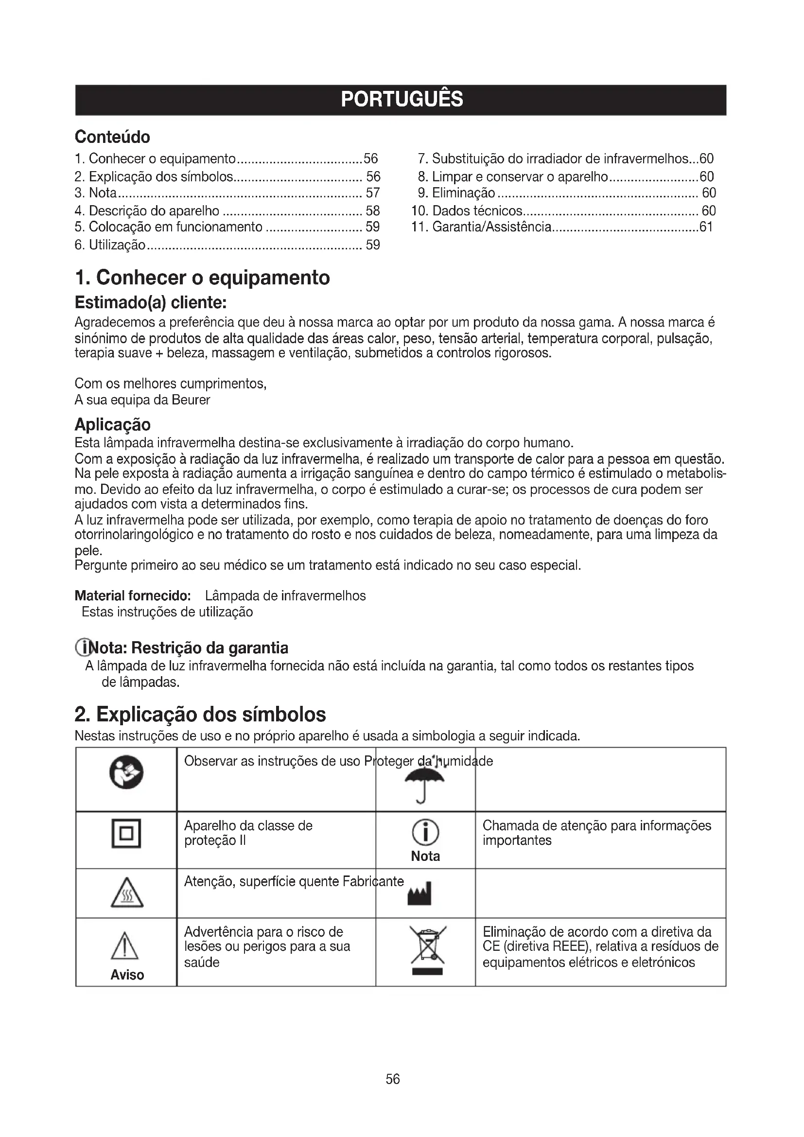 Estimado(a) cliente: Agradecemos a preferência que deu à nossa marca ao optar por um produto da nossa gama. A nossa marca é sinónimo de produtos de alta qualidade das áreas calor, peso, tensão arterial, temperatura corporal, pulsação, terapia suave + beleza, massagem e ventilação, submetidos a controlos rigorosos. Com os melhores cumprimentos, A sua equipa da Beurer Aplicação Esta lâmpada infravermelha destina-se exclusivamente à irradiação do corpo humano. Com a exposição à radiação da luz infravermelha, é realizado um transporte de calor para a pessoa em questão. Na pele exposta à radiação aumenta a irrigação sanguínea e dentro do campo térmico é estimulado o metabolis