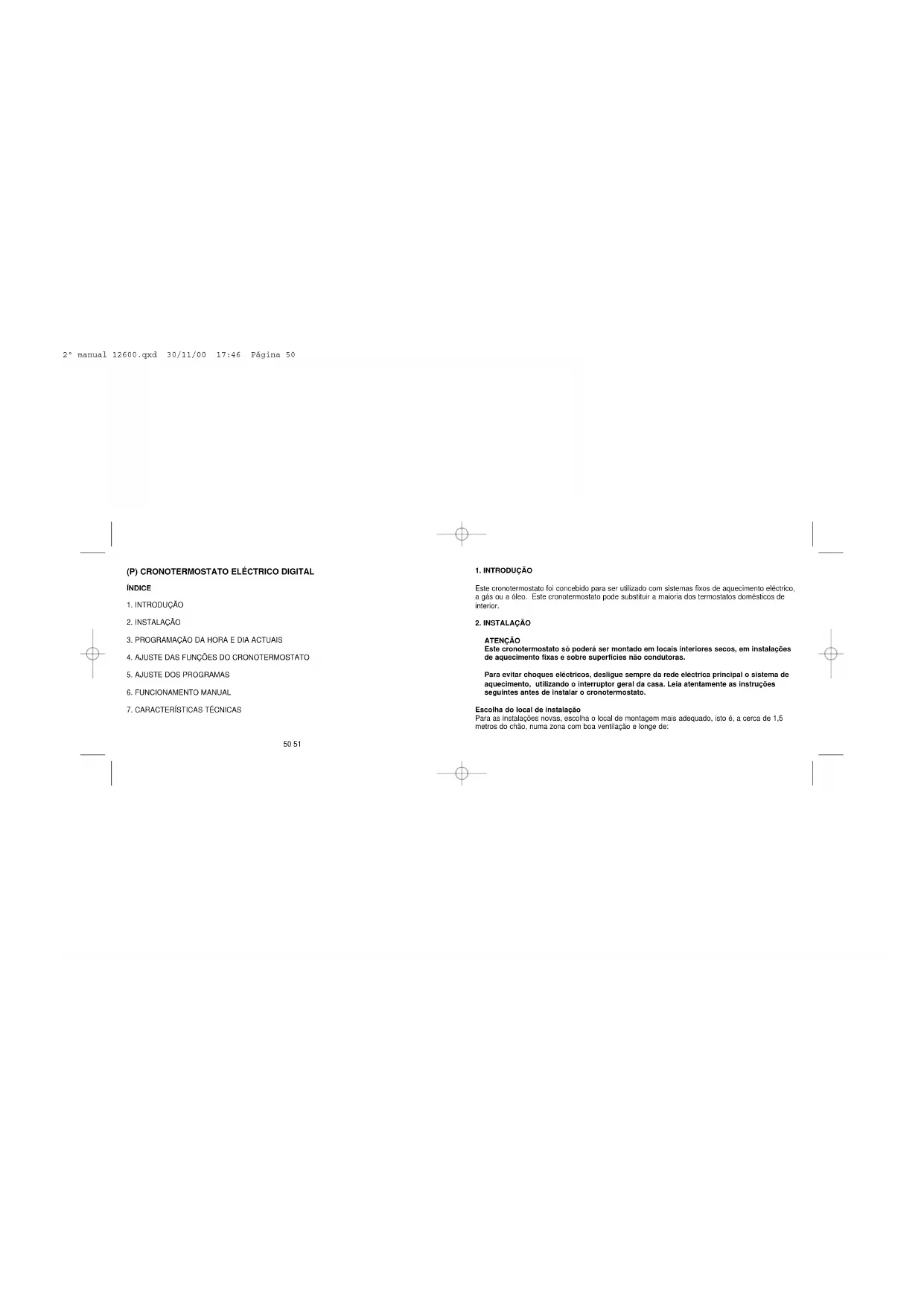 2º manual 12600.qxd 30/11/00 17:46 Página 481. INTRODUÇÃO Este cronotermostato foi concebido para ser utilizado com sistemas fixos de aquecimento eléctrico, a gás ou a óleo. Este cronotermostato pode substituir a maioria dos termostatos domésticos de interior.