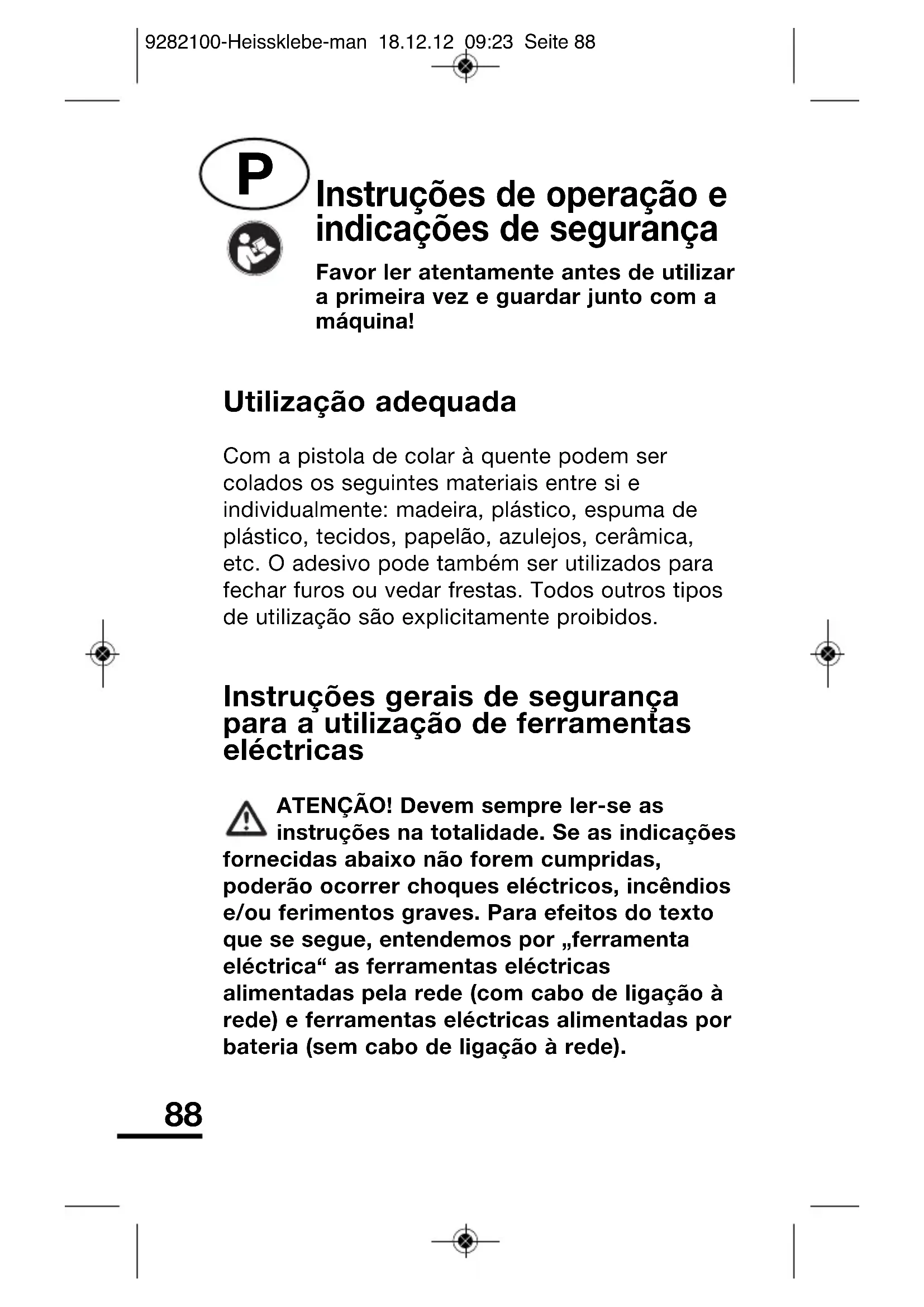 ATENÇÃO! Devem sempre ler-se as instruções na totalidade. Se as indicações foramadas abaixo não foram cumpridas, poderão ocorrerCHOques electrolycicos, incendios e/ou ferimentos graves. Paraefeitos do texto que se segue, entendemos por „ferramenta electrica"as ferramentas electrolycicas alimentadas pela rede (com cabo de ligaçao à rede) e ferramentas electrolycicas alimentadas por bateria (sem cabo de ligaçao à rede).