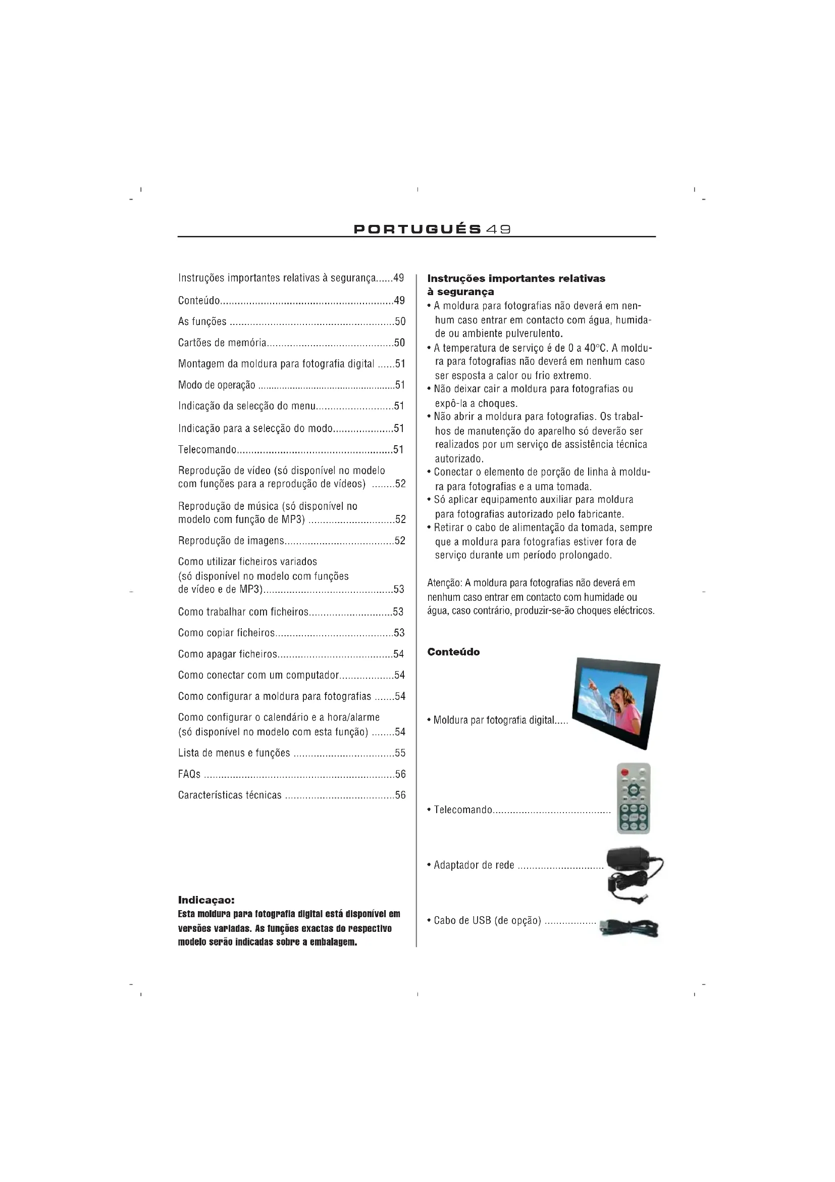 - Cabo de USB (de opção) ...................................... Indicaçao: Esta moldura para fotografia digital está disponível em versões variadas. As funções exactas do respectivo modelo serão indicadas sobre a embalagem.PORTUGUÉS50 As funções: