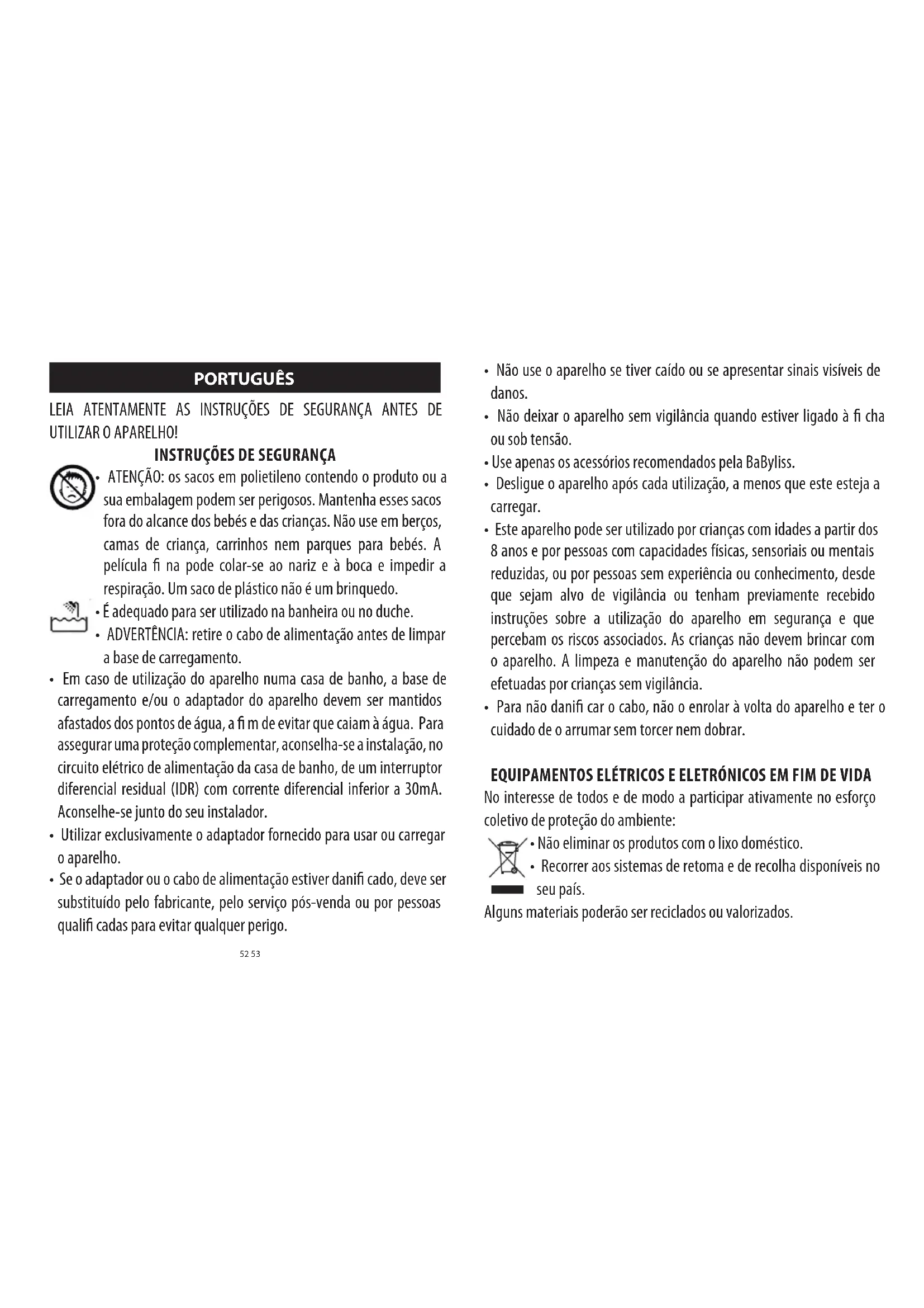 Conselhos de utilização: - Para o seu conforto, o aparelho pode ser utilizado de uma forma multidirecional. Pode efetuar movimentos circulares ou de vaivém com o aparelho sobre o rosto e o pescoço. É provável que seja necessário algum tempo para se familiarizar com o aparelho. Contudo, a utilização do aparelho tornar-se-á rapidamente confortável e intuitiva. - Se pretender passar de uma barba semilonga (+/- 15 mm de altura) para uma barba de 3 dias (com uma altura de cerca de 1 mm), é aconselhável proceder ao corte em várias etapas. Por exemplo: para passar de uma barba de 10 mm de altura para uma barba de 1 mm de altura, faça um primeiro corte de 6 mm de altura. Depois de fi nalizar a primeira fase, faça um segundo corte de 1 mm). - No caso de barbas de altura superior a 20 mm, é preferível cortá-las previamente para cerca de 15 mm antes de usar o aparelho. - Para aparar o bigode ou as patilhas, estenda bem a pele da zona em causa e, para maior precisão, utilize apenas uma lâmina rotativa. - Para desenhar contornos fi rmes e precisos, recomenda-se a utilização de um aparador de barba BaByliss e/ou de um pente de acabamento ou uma lâmina. LIMPEZA Para uma limpeza e caz do aparelho