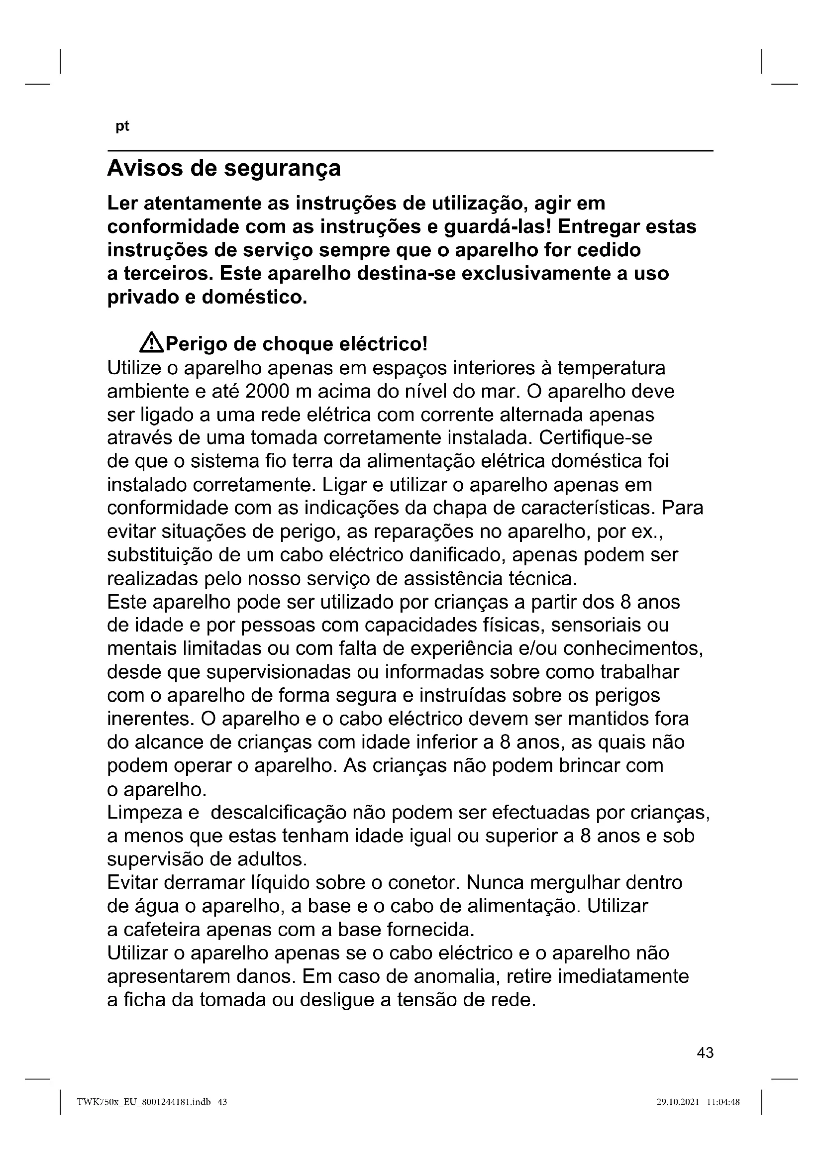 Avisos de segurança Ler atentamente as instruções de utilização, agir em conformidade com as instruções e guardá-las! Entregar estas instruções de serviço sempre que o aparelho for cedido a terceiros. Este aparelho destina-se exclusivamente a uso privado e doméstico. WPerigo de choque eléctrico! Utilize o aparelho apenas em espaços interiores à temperatura ambiente e até 2000 m acima do nível do mar. O aparelho deve ser ligado a uma rede elétrica com corrente alternada apenas através de uma tomada corretamente instalada. Certique-se de que o sistema o terra da alimentação elétrica doméstica foi instalado corretamente. Ligar e utilizar o aparelho apenas em conformidade com as indicações da chapa de características. Para evitar situações de perigo, as reparações no aparelho, por ex., substituição de um cabo eléctrico danicado, apenas podem ser realizadas pelo nosso serviço de assistência técnica. Este aparelho pode ser utilizado por crianças a partir dos 8 anos de idade e por pessoas com capacidades físicas, sensoriais ou mentais limitadas ou com falta de experiência e/ou conhecimentos, desde que supervisionadas ou informadas sobre como trabalhar com o aparelho de forma segura e instruídas sobre os perigos inerentes. O aparelho e o cabo eléctrico devem ser mantidos fora do alcance de crianças com idade inferior a 8 anos, as quais não podem operar o aparelho. As crianças não podem brincar com o aparelho. Limpeza e descalcicação não podem ser efectuadas por crianças, a menos que estas tenham idade igual ou superior a 8 anos e sob supervisão de adultos. Evitar derramar líquido sobre o conetor. Nunca mergulhar dentro de água o aparelho, a base e o cabo de alimentação. Utilizar a cafeteira apenas com a base fornecida. Utilizar o aparelho apenas se o cabo eléctrico e o aparelho não apresentarem danos. Em caso de anomalia, retire imediatamente a cha da tomada ou desligue a tensão de rede. TWK750x_EU_8001244181.indb 43TWK750x_EU_8001244181.indb 43 29.10.2021 11:04:4829.10.2021 11:04:4844