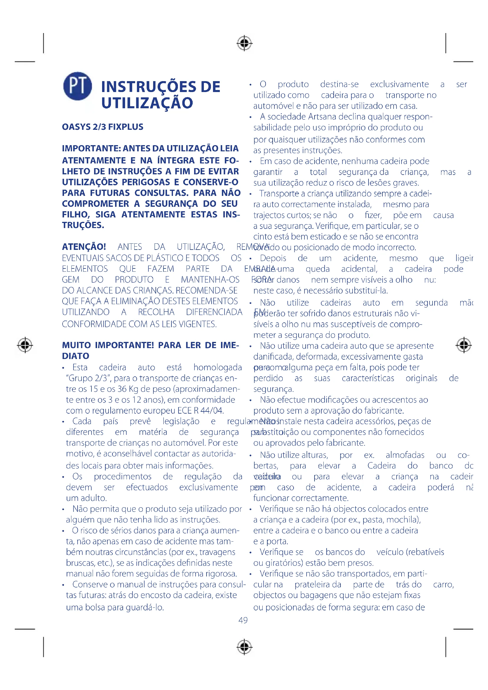 1.Este é um dispositivo de retenção para crianças, homologado segundo o regulamentoece44enbr14400,paradois tiposdiferentesdemontagem. 1.Utilizando os conectores rígidos xplus (p), com o cinto de segurança de três pontos do automóvel, o dispositivo é do tipo “semiuniversal” e é compatível exclusivamentecomosmodelosdeveículos indicadosnarespectiva“listadeautomóveis”; -Utilizandoacadeirasemosconectoresrígidos xplus, com o cinto de segurança de três pontosdoautomóvel,odispositivoédotipo “universal”. 2.Indicadoapenasparautilizaçãoemveículos equipados com cinto de segurança de três pontos, estático ou com enrolador, homologadocombasenoregulamentoun/ ecen°16ououtrosstandardsequivalentes. 3.Em caso de dúvidas, consulte o fabricante dodispositivoderetençãoparacriançasou vendedor. LIMITAÇÕES E REGRAS DE UTILIZAÇÃO