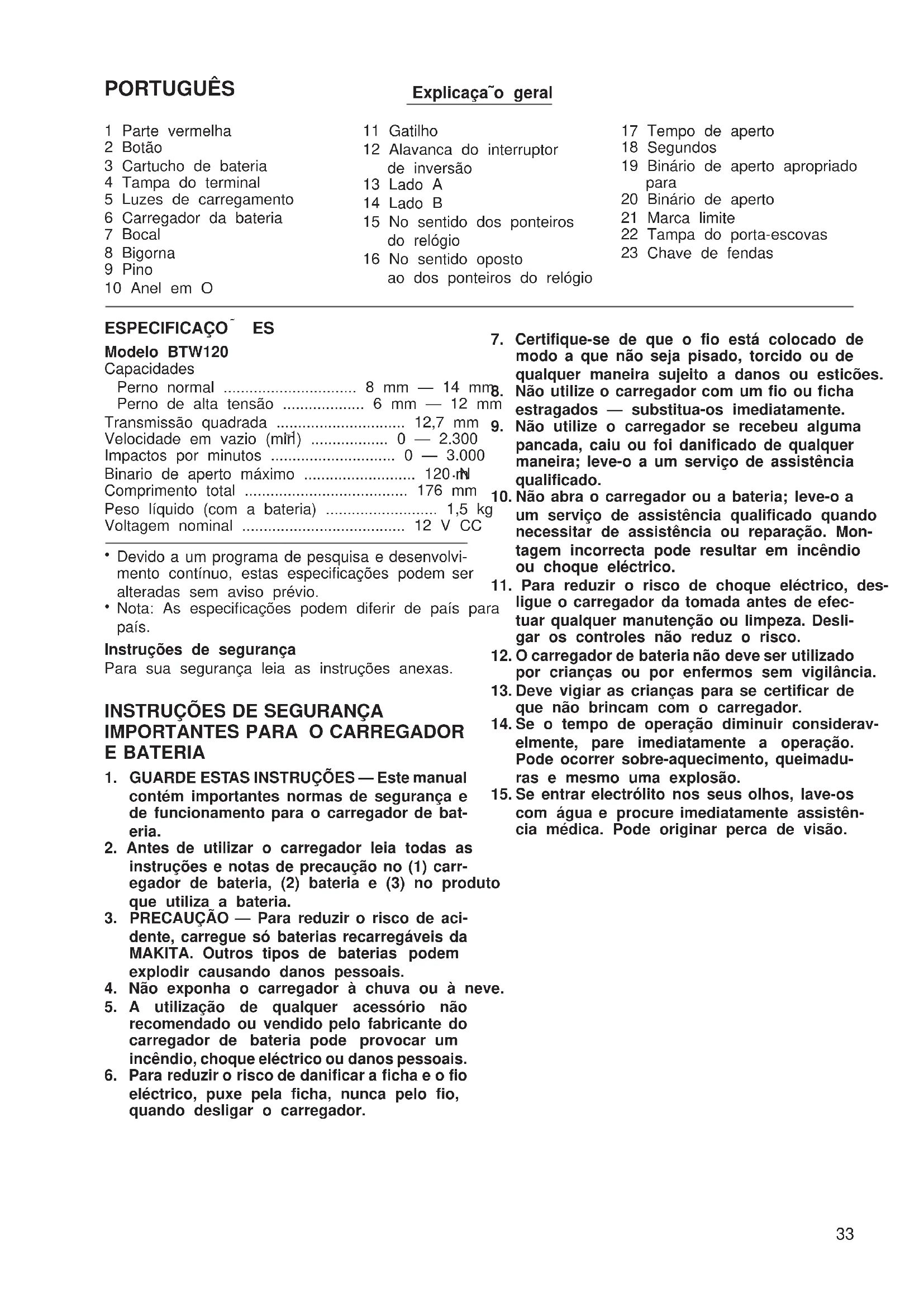 BTW120 (Sp) (’100. 11. 28)PORTUGUÊS Explicaça˜o geral 1 Parte vermelha 2 Botão 3 Cartucho de bateria 4 Tampa do terminal 5 Luzes de carregamento 6 Carregador da bateria 7 Bocal 8 Bigorna 9 Pino 10 Anel em O 11 Gatilho 12 Alavanca do interruptor de inversão 13 Lado A 14 Lado B 15 No sentido dos ponteiros do relógio 16 No sentido oposto ao dos ponteiros do relógio 17 Tempo de aperto 18 Segundos 19 Binário de aperto apropriado para 20 Binário de aperto 21 Marca limite 22 Tampa do porta-escovas 23 Chave de fendas ESPECIFICAÇOx ES Modelo BTW120 Capacidades Perno normal ............................... 8 mm — 14 mm Perno de alta tensão ................... 6 mm — 12 mm Transmissão quadrada .............................. 12,7 mm Velocidade em vazio (min