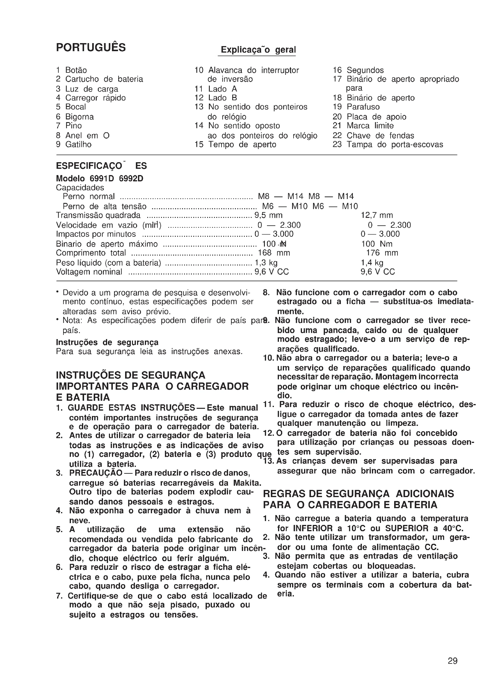 6991D/6992D (Sp) (’100. 6. 12)PORTUGUÊS Explicaça˜o geral 1 Botão 2 Cartucho de bateria 3 Luz de carga 4 Carregor rápido 5 Bocal 6 Bigorna 7 Pino 8 Anel em O 9 Gatilho 10 Alavanca do interruptor de inversão 11 Lado A 12 Lado B 13 No sentido dos ponteiros do relógio 14 No sentido oposto ao dos ponteiros do relógio 15 Tempo de aperto 16 Segundos 17 Binário de aperto apropriado para 18 Binário de aperto 19 Parafuso 20 Placa de apoio 21 Marca limite 22 Chave de fendas 23 Tampa do porta-escovas ESPECIFICAÇOx ES Modelo 6991D 6992D Capacidades Perno normal .......................................................... M8 — M14 M8 — M14 Perno de alta tensão .............................................. M6 — M10 M6 — M10 Transmissão quadrada .............................................. 9,5 mm 12,7 mm Velocidade em vazio (min